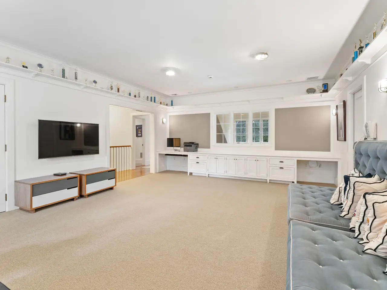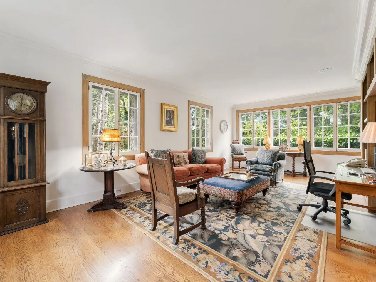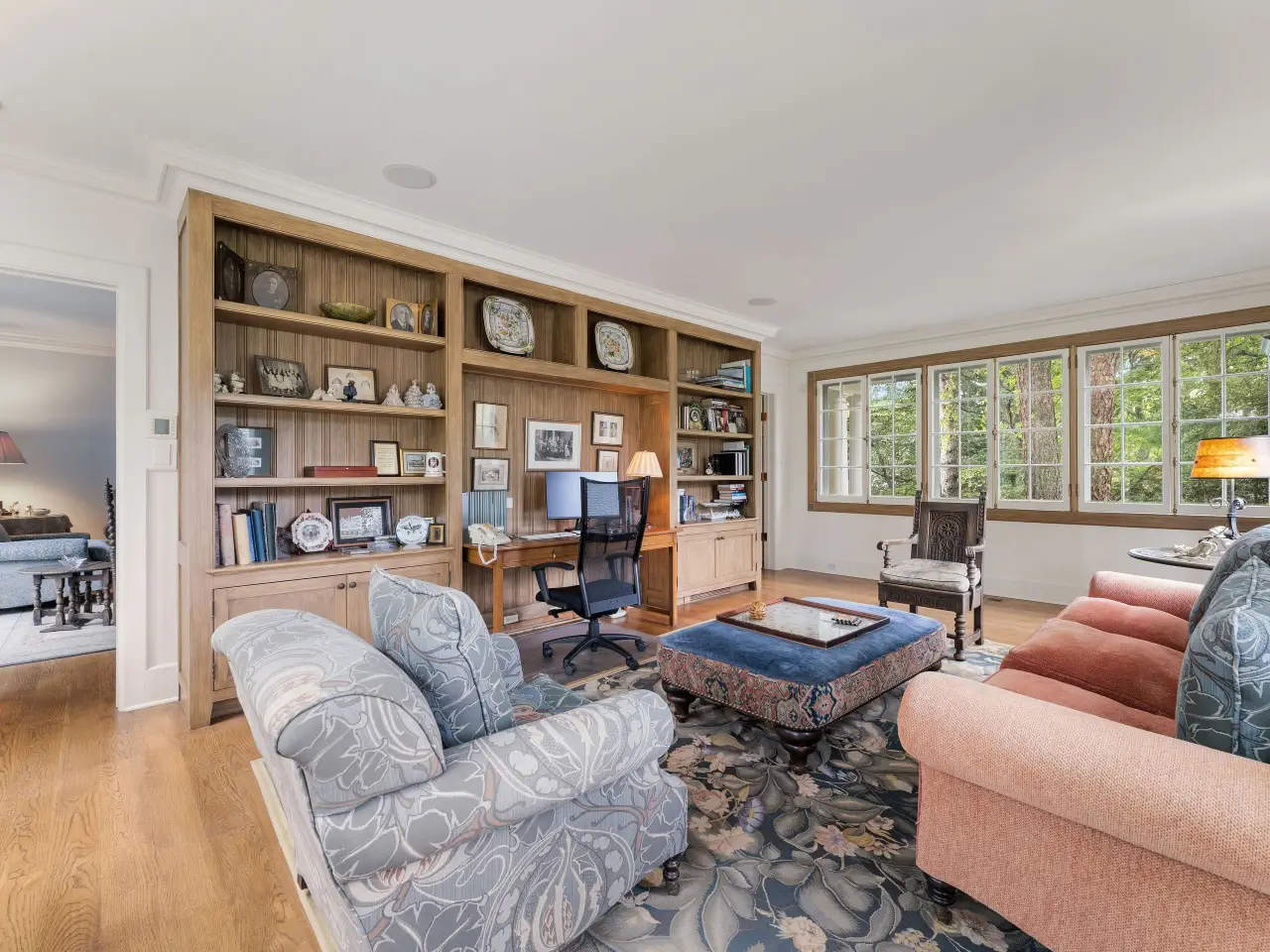 This spectacular six-bedroom home in the coveted Grange section of Greenacres, sits on 2.61 sweeping, park-like acres. Rebuilt in 2001 with attention to detail and exquisite finishings, this home blends modern luxury with classic warmth. The foyer opens to a formal living room with a fireplace and an adjoining study. A gracious dining room connects to a butlers pantry and chefs kitchen with large island and views of the patio and pool. Enjoy seamless indoor-outdoor living with a screened-in porch, family room with French doors, and access to the patio, gardens, pool, hot tub and cabana with half bath and laundry. Upstairs, a magnificent primary bedroom suite offers an elevated ceiling, luxurious primary bathroom, expansive closet, and a second office. An additional family bedroom includes a fireplace, en-suite bath, and oversized closet. Two more bedrooms share a Jack and Jill bath, while a fifth bedroom suite with a full bath is ideal for guests. A large central playroom and spacious laundry room complete the second floor. The third floor has another charming bedroom, full bath, and flexible space for a home office or playroom. The lower level offers an additional 1376 square feet and boasts soaring ceilings, a grand recreation room, movie theater, kitchenette, gym, and half bath. The property also includes a two-car attached garage with mudroom entry, second powder room and a two-car detached garage. Private, elegant, and reimagined for modern living, 65 Garden is a true Greenacres gem!