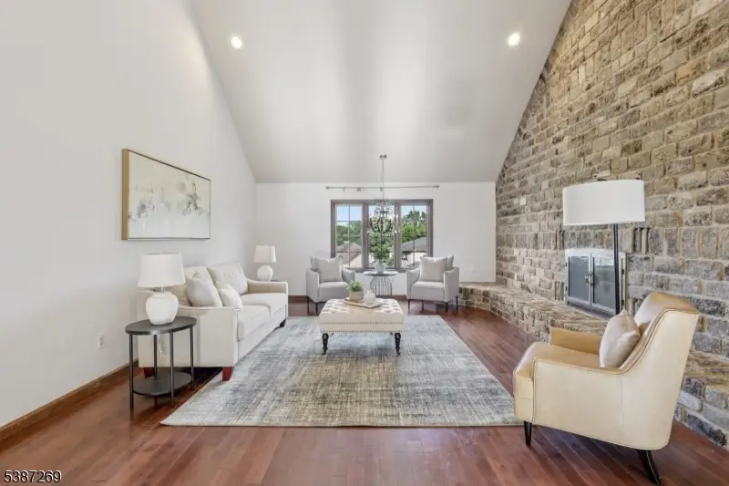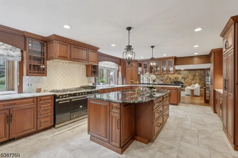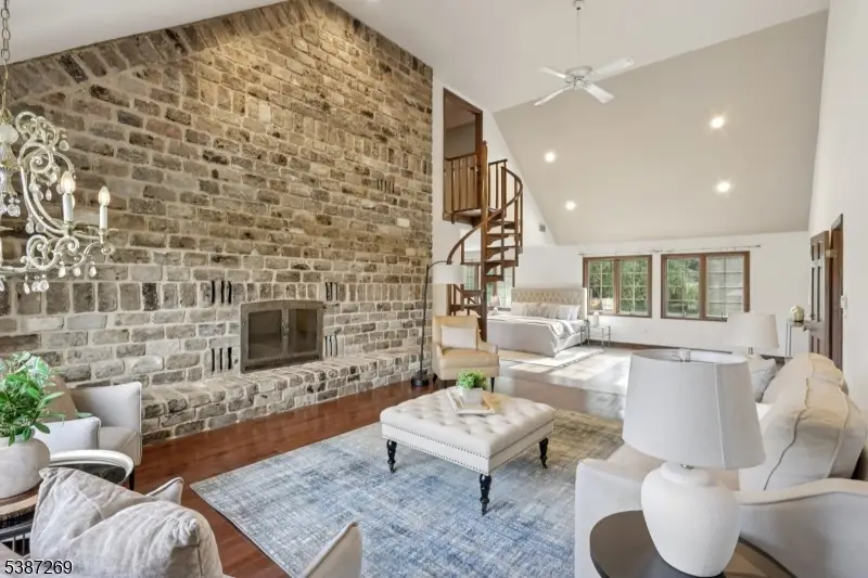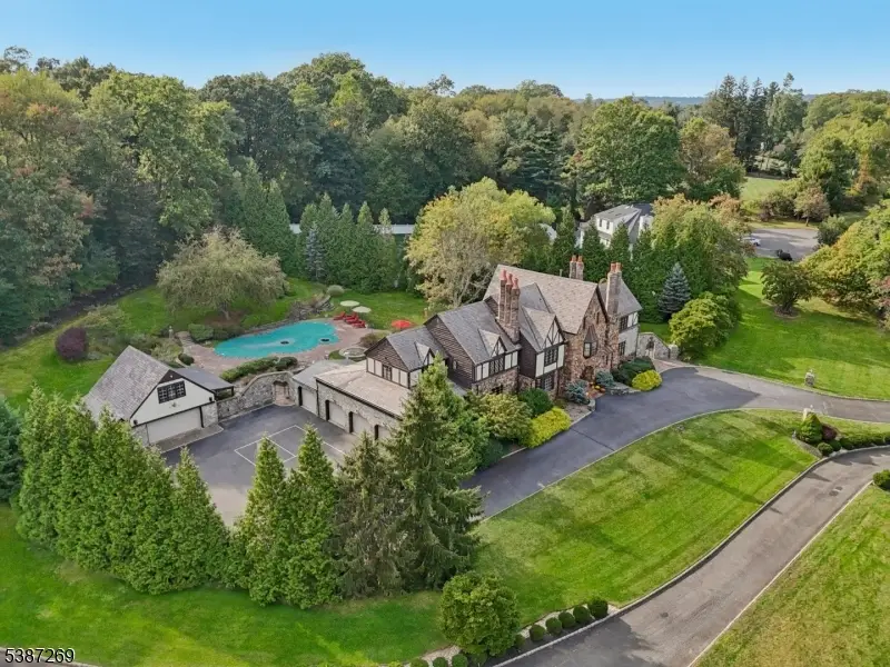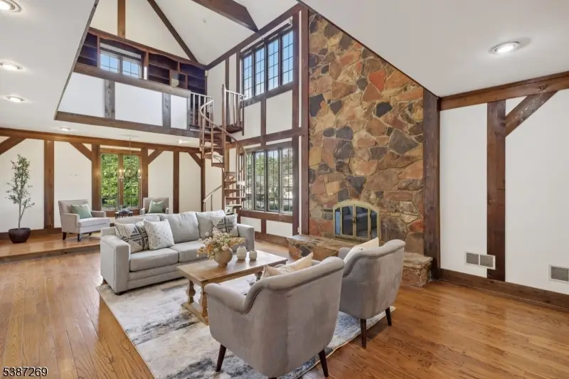 This exceptional 5-bedroom, 5.1-bath estate is a rare find, blending architectural interest with inspired design and functionality. Nestled on a quiet cul-de-sac in one of Scotch Plains' most desirable neighborhoods, it sits on 1.34 park-like acres with amenities for entertaining and everyday living. A striking stone exterior opens to expansive rooms, hardwood floors, five fireplaces, and a dramatic two-story living room with a spiral staircase to a wrap-around library. The chef's kitchen, renovated in 2019, features a 60" Lacanche range imported from France, dual Sub-Zero refrigerators, two dishwashers, and custom cherry cabinetry. The luxurious primary suite offers dual walk-in dressing closets, a spacious sitting area retreat with fireplace, and a private spiral staircase to a loft, creating a true spa-like escape. Multiple formal and informal living spaces make gathering easy. The third floor and finished lower level provide additional retreats, including two bedrooms, a full kitchen, wet bar, full bathroom, entertainment areas, game rooms, exercise room, and separate garage entrance. Outdoors, enjoy a heated in-ground pool and spa, three patios, a gazebo with lighting and integrated sound system, professional landscaping, and privacy on all sides. Two garages accommodate five cars, with the detached garage offering a workshop and additional storage.