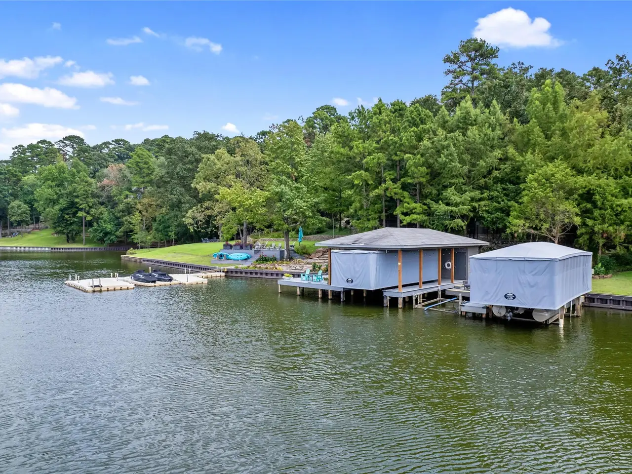 This beautiful compound on Lake Cypress Springs includes the rare opportunity to own a contemporary home in a private setting with over 12 acres. The private gated entrance leads you to one of the largest lots on the lake that has a contemporary custom home designed by the well-known architectural firm of Barry Bull Ballas. An expertly designed 4 bedroom and 5 and a half bath home with an exterior combination of stone, zinc, and hardy produce a timeless home nestled among the towering trees and perfectly oriented on the land to maximize the views of the lake with over 450 ft of lake frontage. The property boasts all the recreational options you can imagine. Sport court ideal for pickleball, basketball, foursquare, shuffleboard and badminton. Multiple boat docks including automatic lift and cover for a ski boat and pontoon boat and additional slip for a sailboat and floating dock for swimming and additional watercraft. There is a beautifully designed firepit that overlooks the beach area. The expert landscaping surrounds the home and lakefront with additional features including a Hot tub, fishing dock and tetherball. The Listing Price includes the following: 2011 Sun Tracker Pontoon Boat w.150 Mercury 4-stock engine and covered lift, Kawasaki UTV 4.4 Mule, two 2021 Sea-Doo Jet Skis, Three kayaks and one paddleboard. This sophisticated contemporary lake house is ready to enjoy and includes countless recreational options in this uniquely private setting on beautiful Lake Cypress Springs.