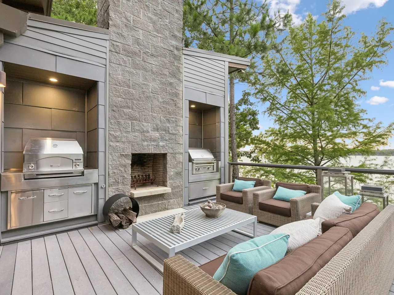 Outdoor deck with fireplace, pizza oven, and grill