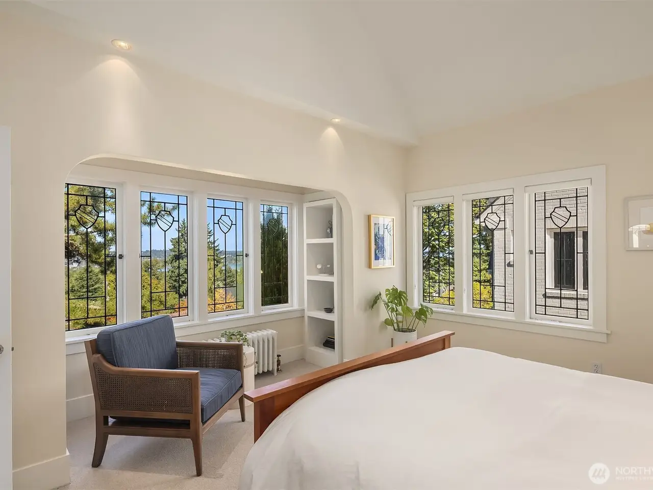 One of N Capitol Hill's finest homes w/ views of the Lake and Cascades! Built in 1926 and exquisitely maintained, this luxury home combines historical details w/ contemporary necessities. Original craftsmanship steeped throughout with tradition. Beautiful leaded glass windows, hardwood floors, Batchelder FP, French Doors, Coved Ceilings, picture moulding, custom built-in shelves & private balcony overlooking professionally landscaped yard w/ elegant gardens, patio & sport court. Exquisite formal LR, DR, chef's kitchen, sunroom & spacious new media center. Plus more - updated radiant heaters, tile roof w/ solar panels, updated electrical panel, 2-car garage w/ EV charger. Close to restaurants, coffee shops, parks, bike trails, UW and freeway.