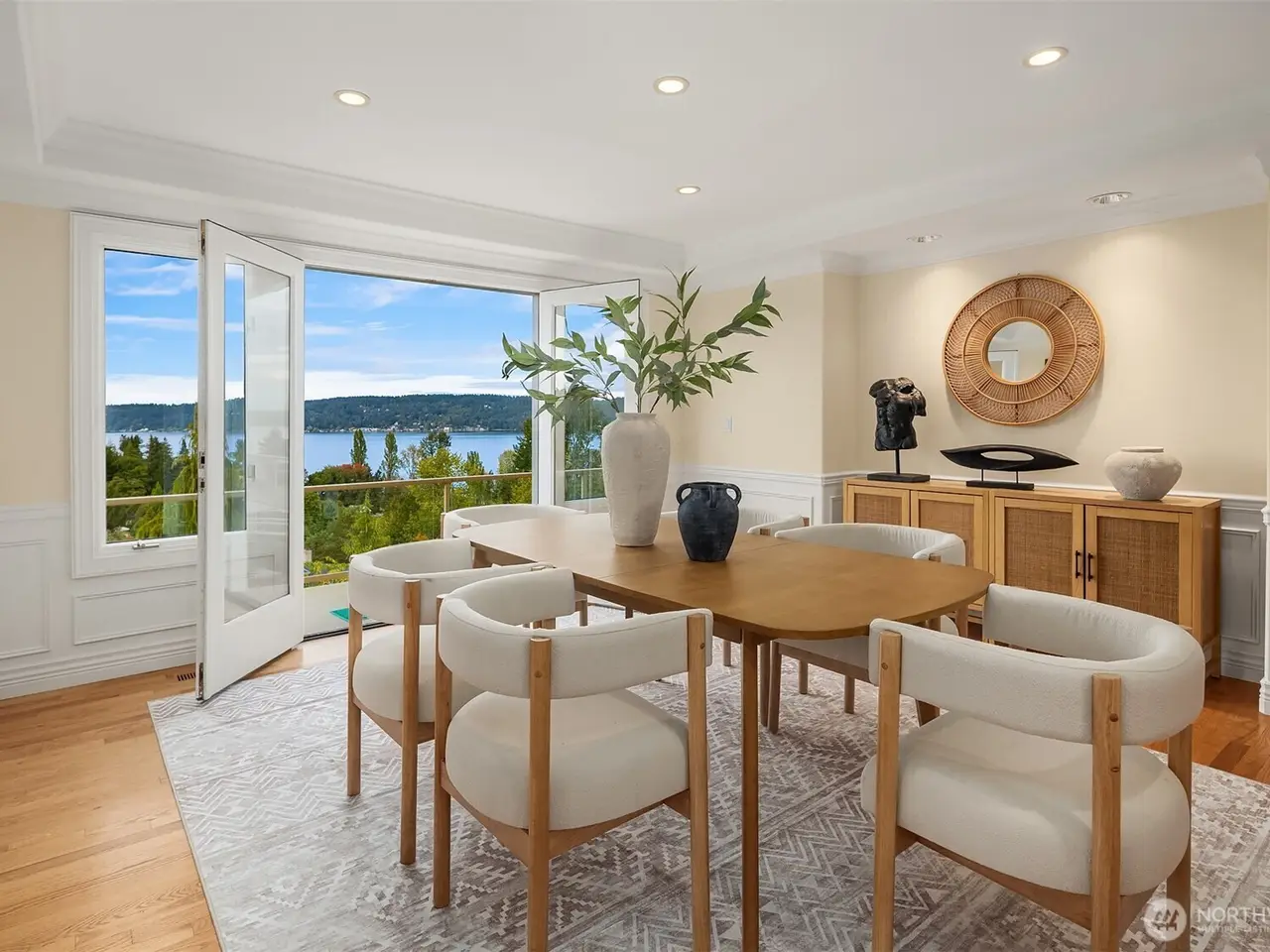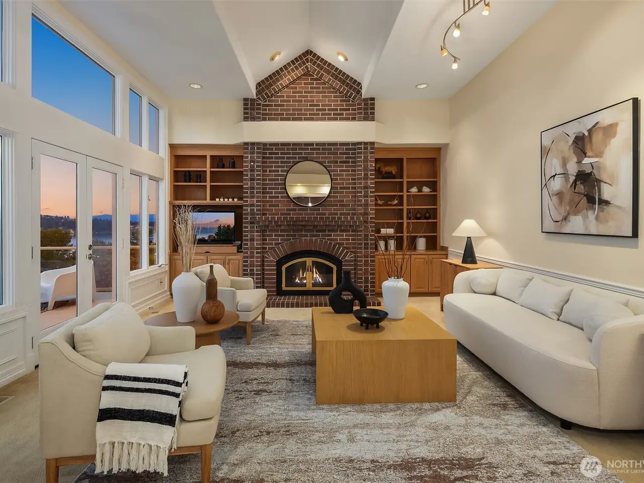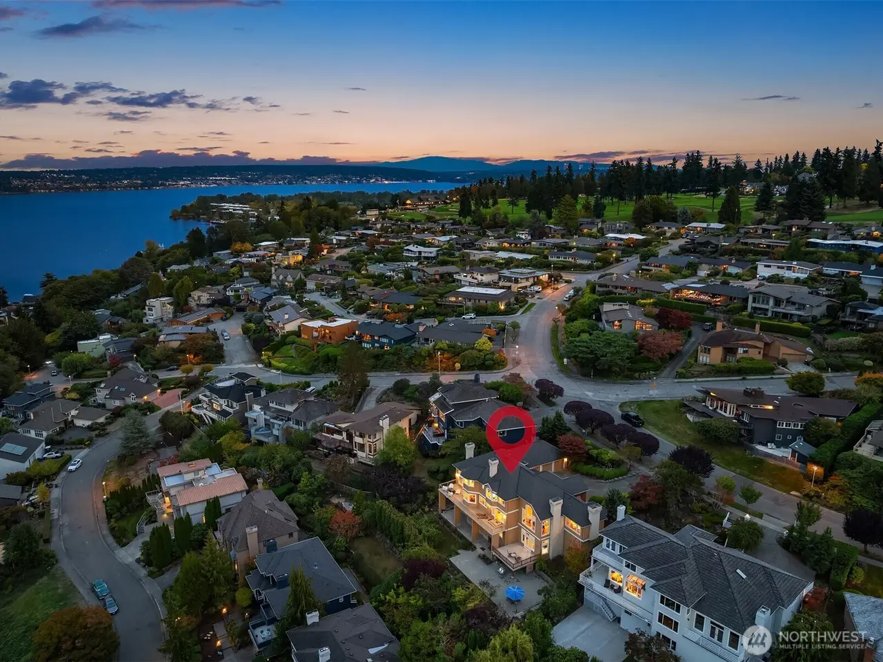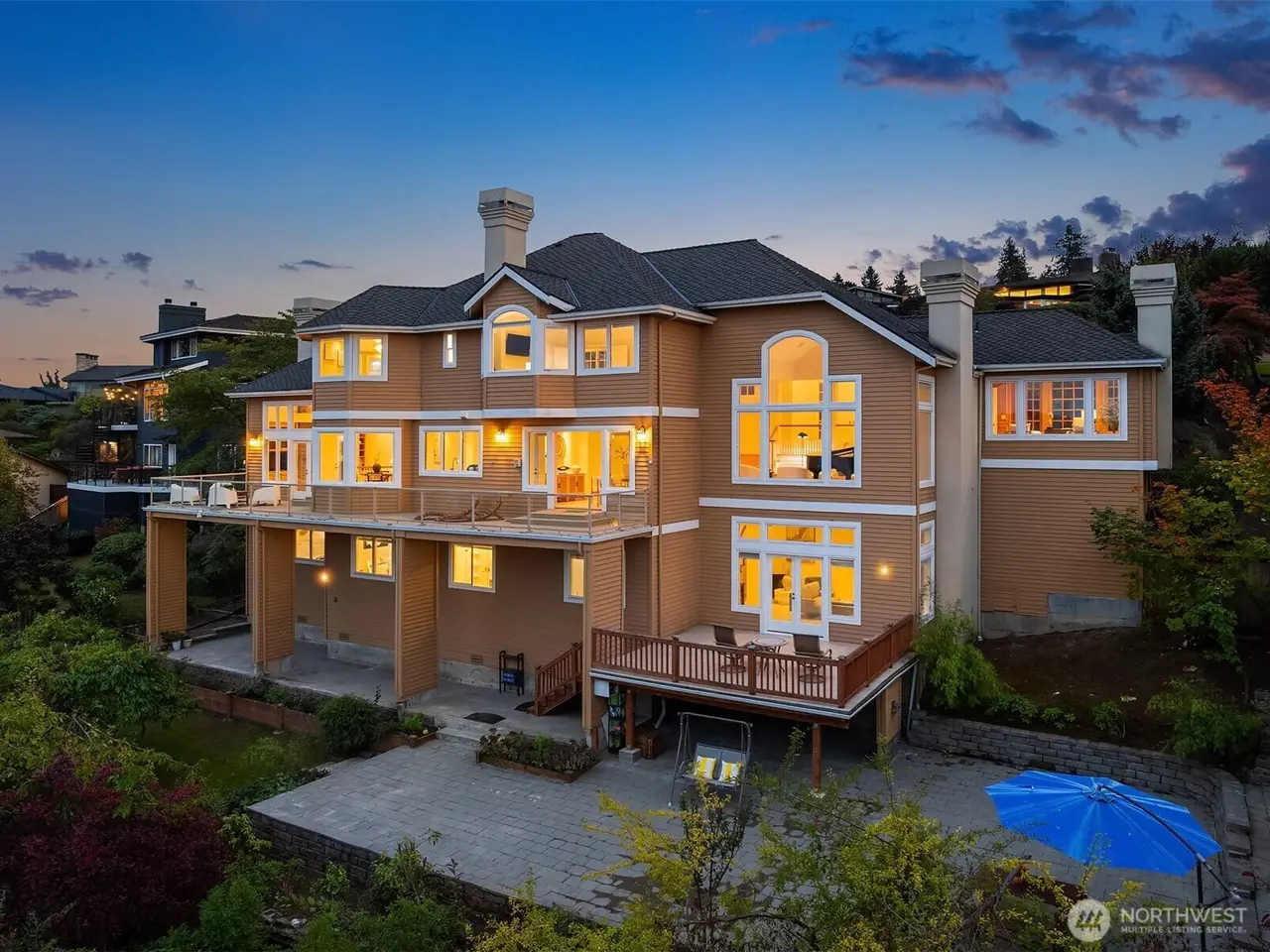 Perched above Lake Washington in highly desirable Inverness neighborhood, this NW contemporary residence showcases stunning panoramic views from nearly every room. Sunlight fills open-concept living spaces through expansive floor-to-ceiling windows & soaring ceilings. Timeless layout flows from elegant living room to formal dining room. Gourmet kitchen opens to spacious family room. Upstairs, luxurious primary suite & additional en-suite bedroom. Lower level offers generous bonus room, 3 view-filled bedrooms & 2 more baths. Extensive millwork & built-ins throughout. Enjoy expansive view decks & low-maintenance private backyard. Dual-zone HVAC, 5 gas fireplaces & 3-car garage. Close to B-G Trail, parks, Seattle Children's, U Village & UW.