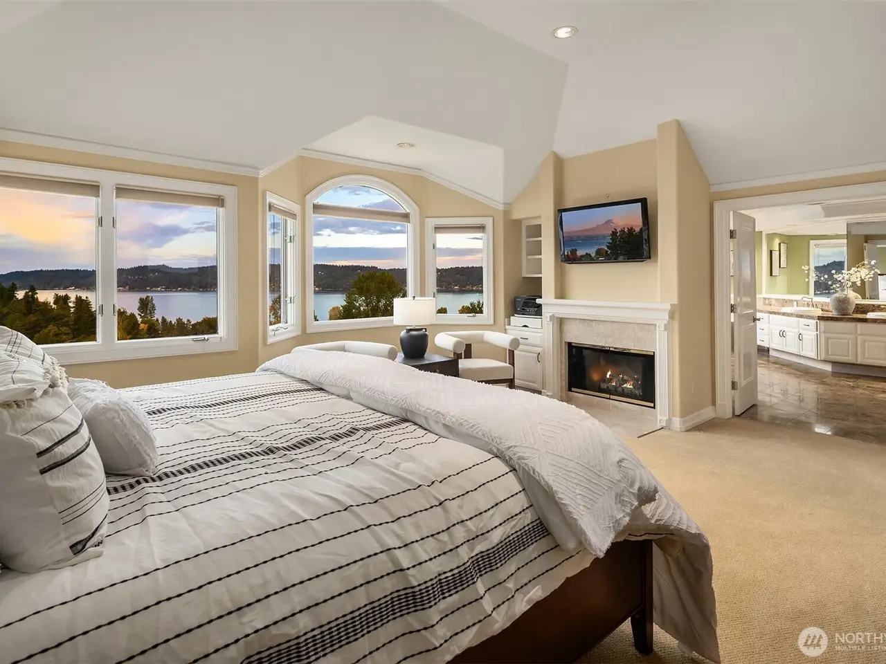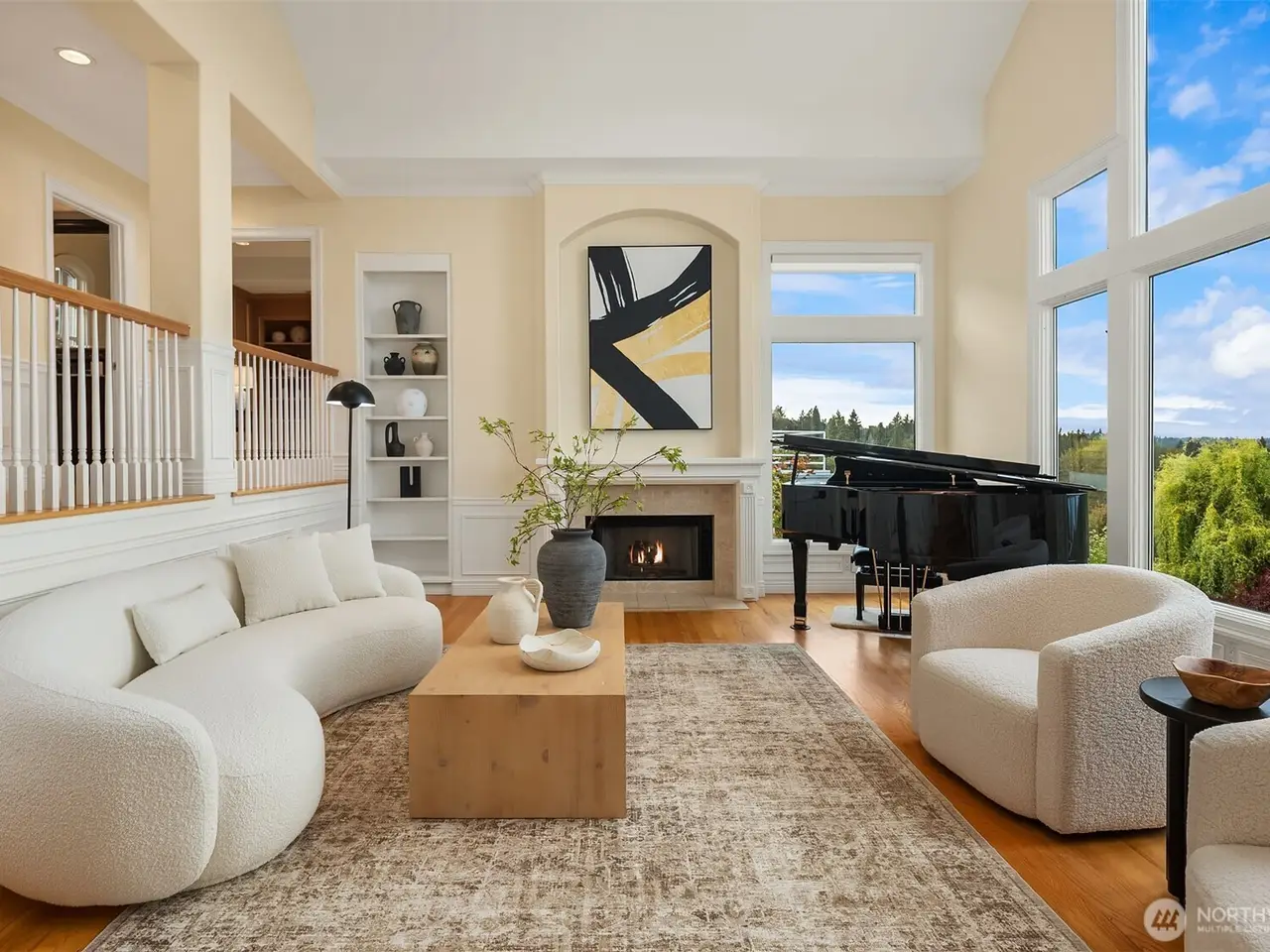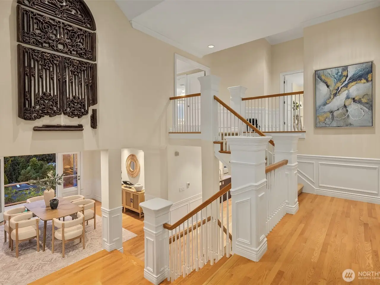 Perched above Lake Washington in highly desirable Inverness neighborhood, this NW contemporary residence showcases stunning panoramic views from nearly every room. Sunlight fills open-concept living spaces through expansive floor-to-ceiling windows & soaring ceilings. Timeless layout flows from elegant living room to formal dining room. Gourmet kitchen opens to spacious family room. Upstairs, luxurious primary suite & additional en-suite bedroom. Lower level offers generous bonus room, 3 view-filled bedrooms & 2 more baths. Extensive millwork & built-ins throughout. Enjoy expansive view decks & low-maintenance private backyard. Dual-zone HVAC, 5 gas fireplaces & 3-car garage. Close to B-G Trail, parks, Seattle Children's, U Village & UW.