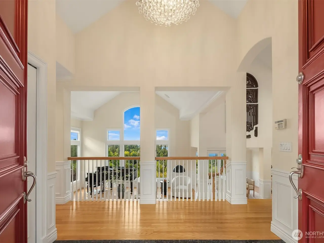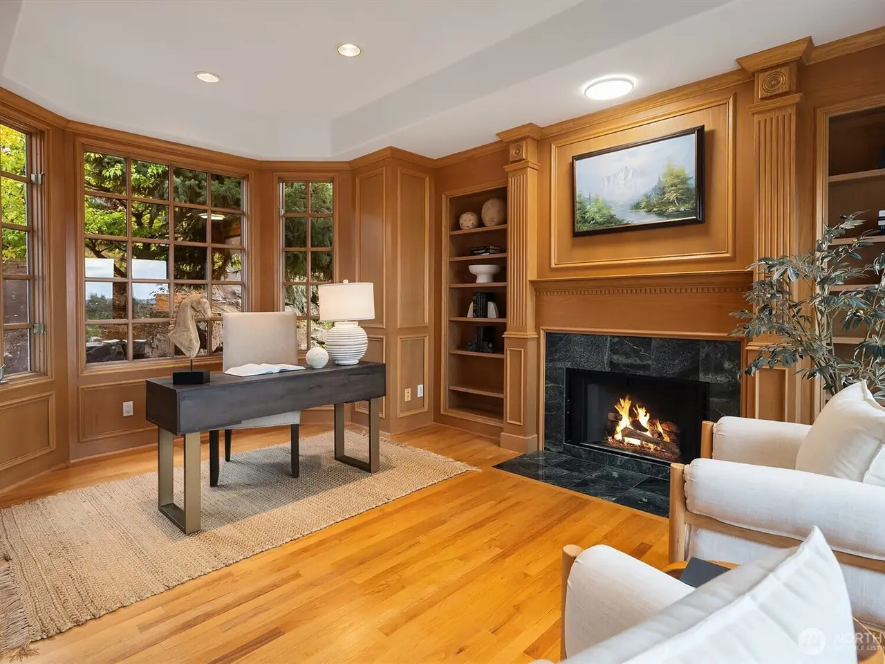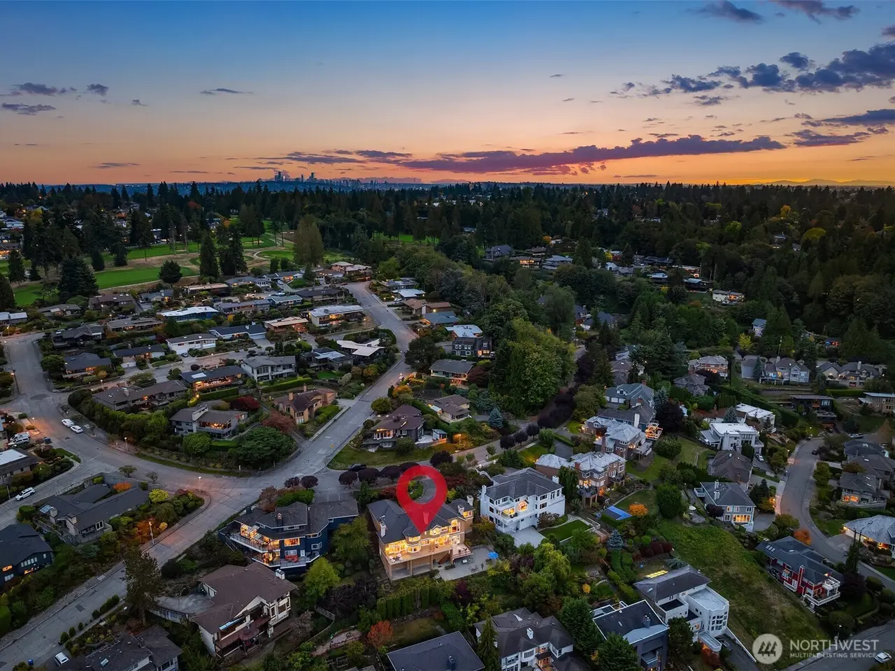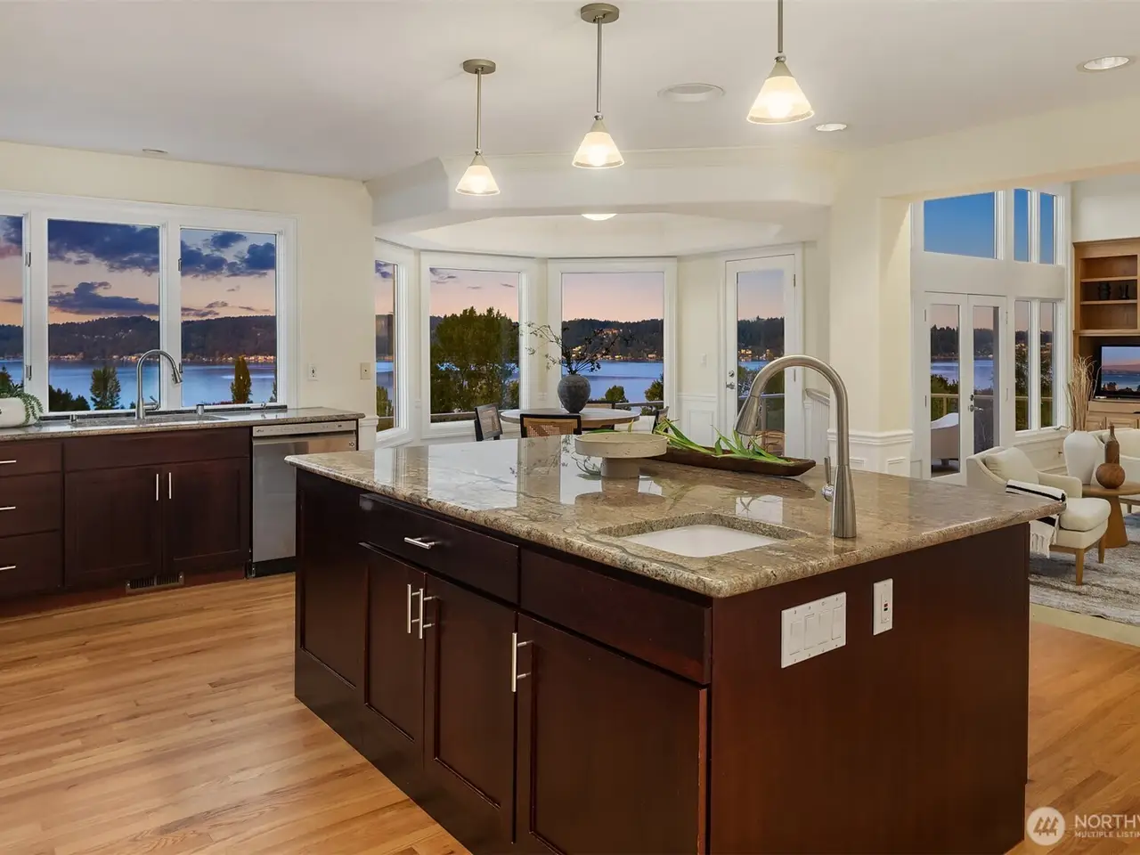 Perched above Lake Washington in highly desirable Inverness neighborhood, this NW contemporary residence showcases stunning panoramic views from nearly every room. Sunlight fills open-concept living spaces through expansive floor-to-ceiling windows & soaring ceilings. Timeless layout flows from elegant living room to formal dining room. Gourmet kitchen opens to spacious family room. Upstairs, luxurious primary suite & additional en-suite bedroom. Lower level offers generous bonus room, 3 view-filled bedrooms & 2 more baths. Extensive millwork & built-ins throughout. Enjoy expansive view decks & low-maintenance private backyard. Dual-zone HVAC, 5 gas fireplaces & 3-car garage. Close to B-G Trail, parks, Seattle Children's, U Village & UW.