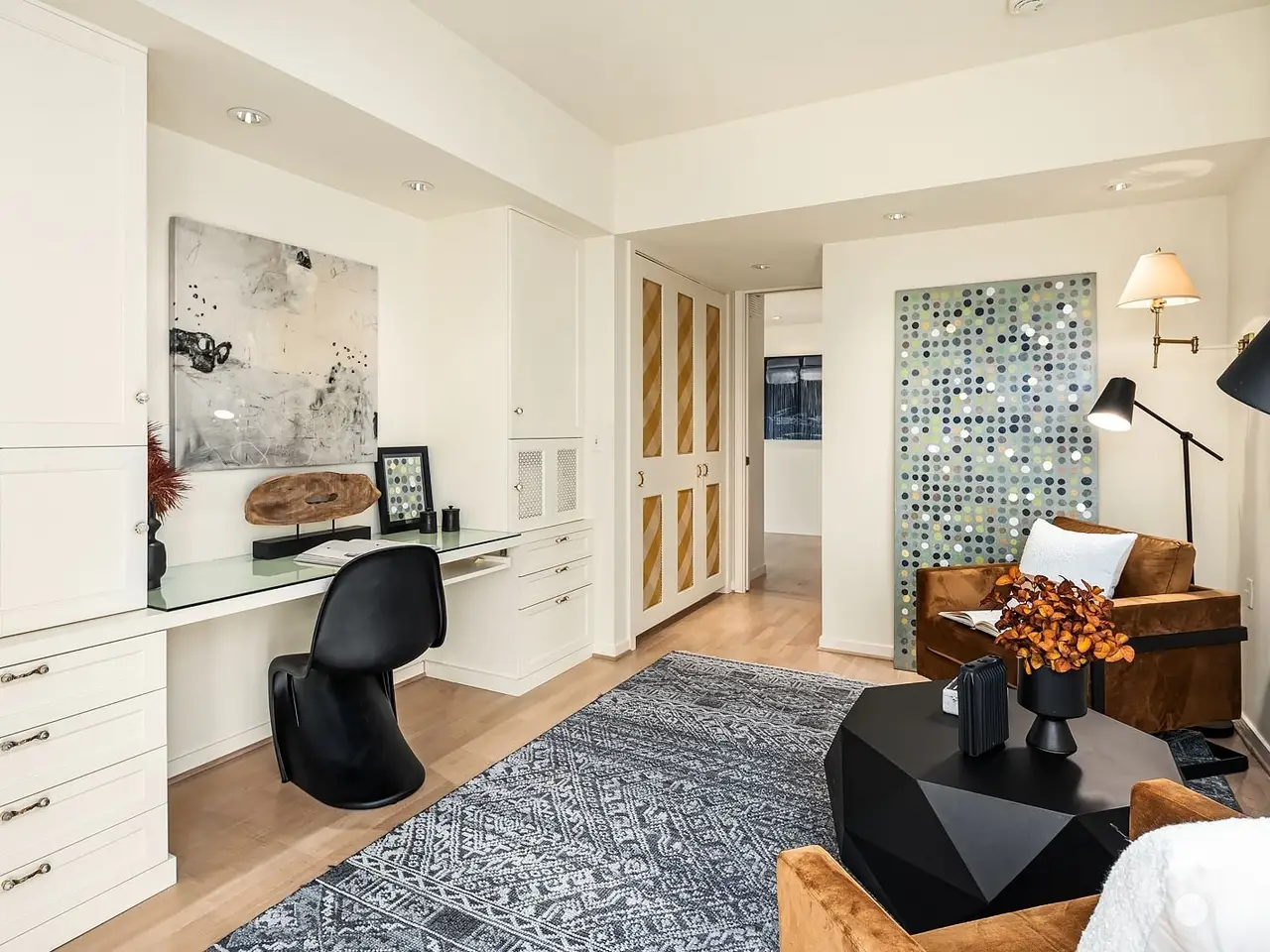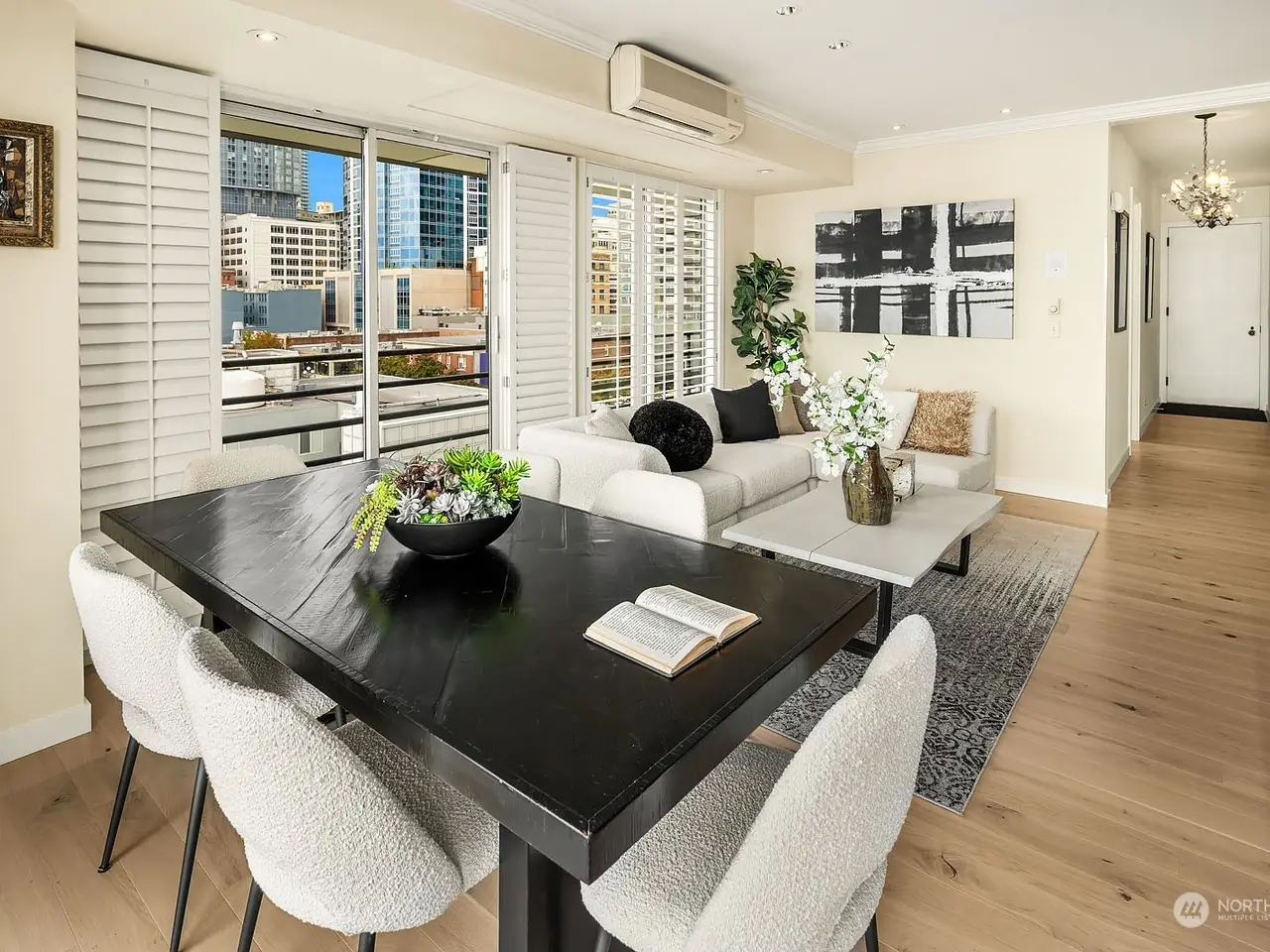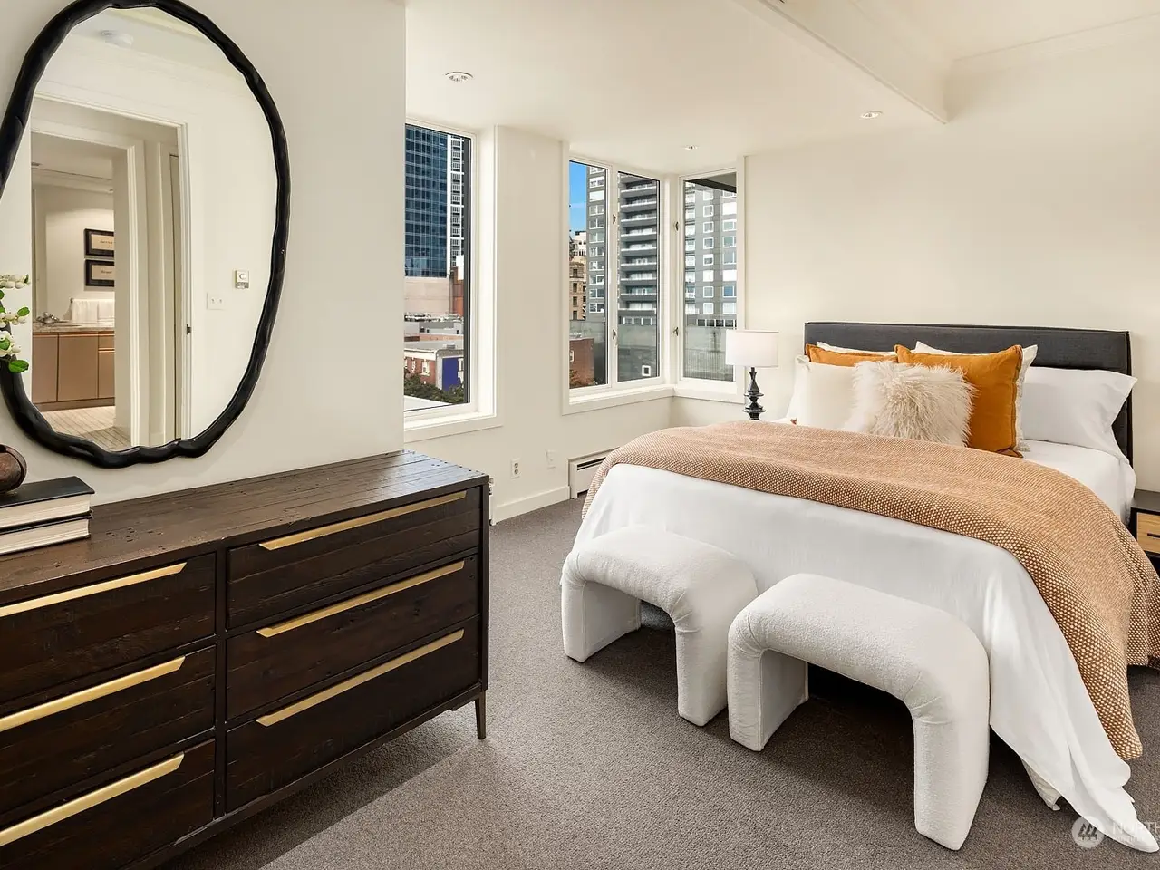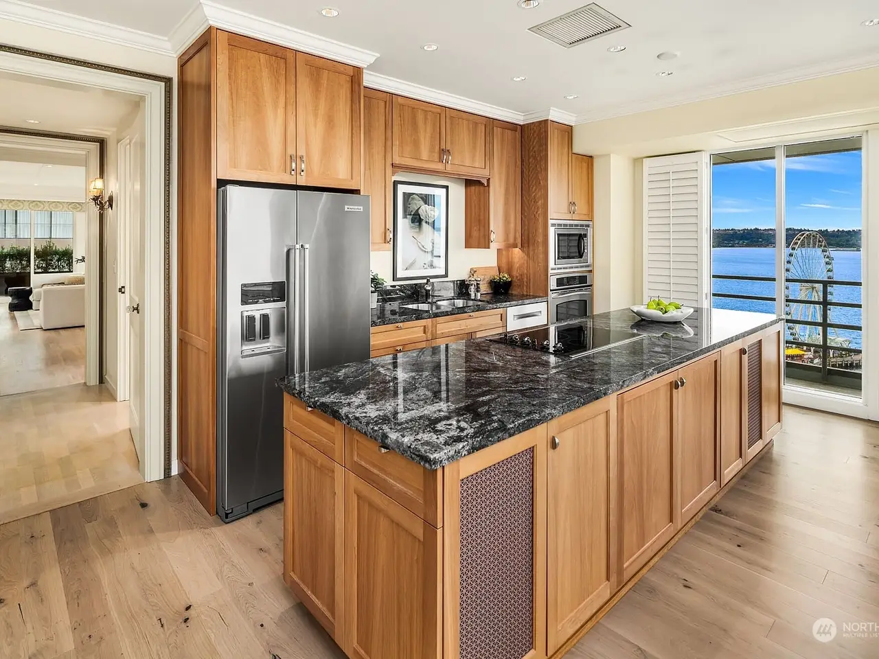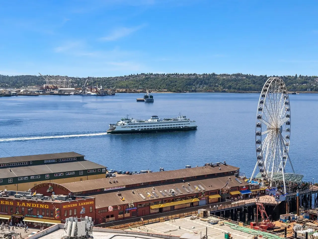Live luxuriously front & center above it all. Updated & re-launched, this home floats elegantly above the Wheel & the exciting new Waterfront. Spacious 3-BR home w/ serenity & seclusion. 2 units combined along the entire western span of this luxury concierge building. Wrap-around patios present unobstructed views of Elliott Bay, Olympic Mtns & striking sunsets. Each space in this U-shaped unit conveys comfort & smart design. Formal entry presents ample wall space for art enthusiasts & a great first impression. Walls of windows welcome light. Built-ins & closets provide generous storage. Kitchen/family rms gaze north to Pike Place Mkt. 2 pkg spaces & storage. Close to SAM, Four Seasons for dining or spa visits, Benaroya Hall & the Market.