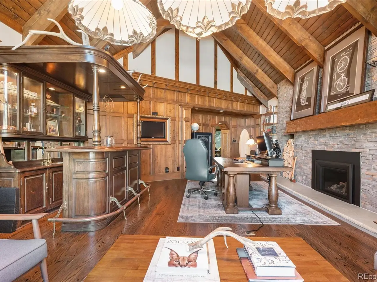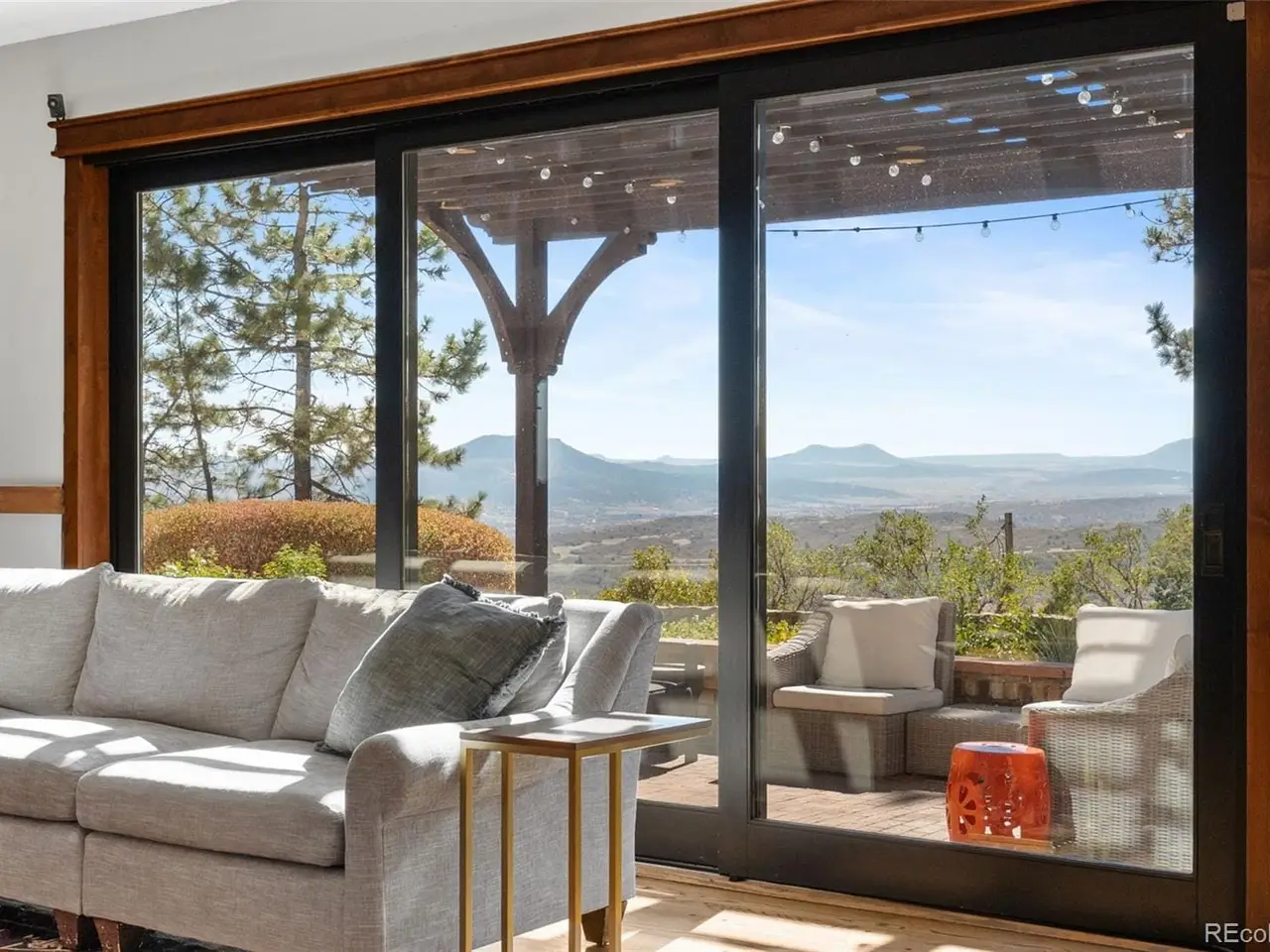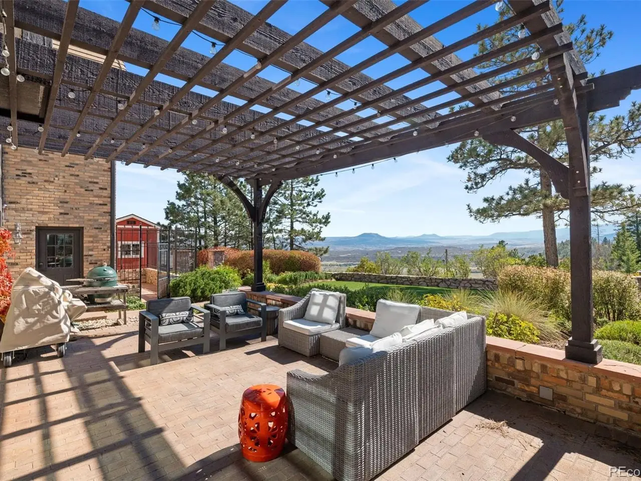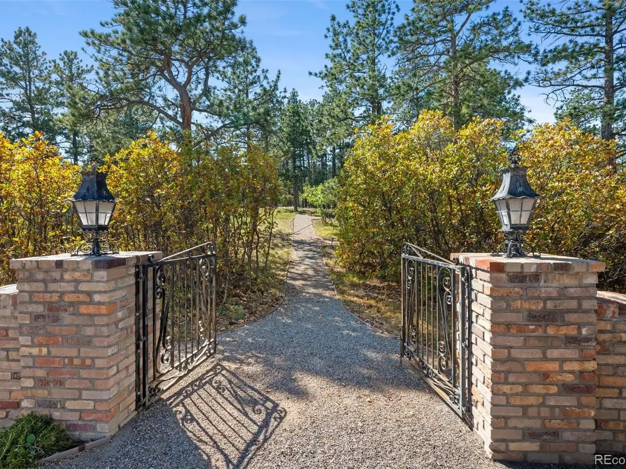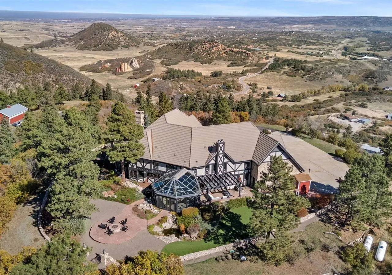 Situated atop 40 acres of breathtaking Colorado landscape, this fully renovated Tudor estate in Sedalia offers an unparalleled blend of sophistication and country charm in a private setting. The gourmet kitchen has been artfully reimagined with top-of-the-line finishes, fixtures, and appliances, featuring a rare artifact from the French Revolution as the cooktop backsplash. Charm and intrigue continue to flow throughout the home, highlighted by remarkable details such as an authentic stage coach bar, historic period fixtures, stunning chandeliers, and custom stonework, complemented by five inviting fireplaces and elegant marble flooring. This residence boasts a striking two-story glass atrium that invites natural light and panoramic views of the majestic mountains and Downtown Denver. The expansive outdoor living areas are equally impressive, showcasing meticulously landscaped grounds complete with low-maintenance turf, serene water features, sports field, grazing pasture, ATV track, shooting range, treehouse, and walking trails that enhance the estate's tranquility. Additional amenities include a spacious bonus/playroom, a state-of-the-art home theater, and two versatile outbuildings, ideal for vehicles, animals, or potential caregivers accommodations. The expansive primary suite is the epitome of luxury with dual walk-in closets, sitting area, fireplace, coffee bar and five piece marble bathroom. The generously proportioned secondary bedrooms are perfect for children and guests. For those with a passion for sustainable living, this estate features a goat and chicken farm, adding a unique touch to this luxurious retreat. Situated just 25 minutes from the Denver Tech Center and a mere 12 minutes from Whole Foods, this property ensures both privacy and accessibility. This exceptional estate is a rare opportunity, embodying the height of luxurious mountain living while providing countless amenities for a lifestyle of comfort and seclusion.