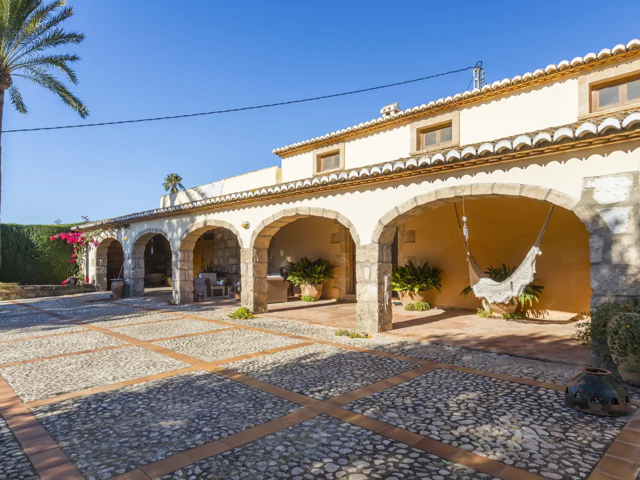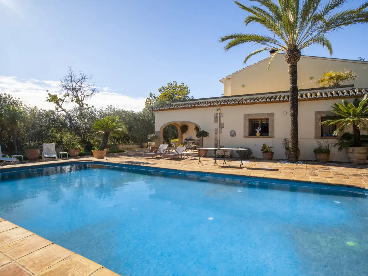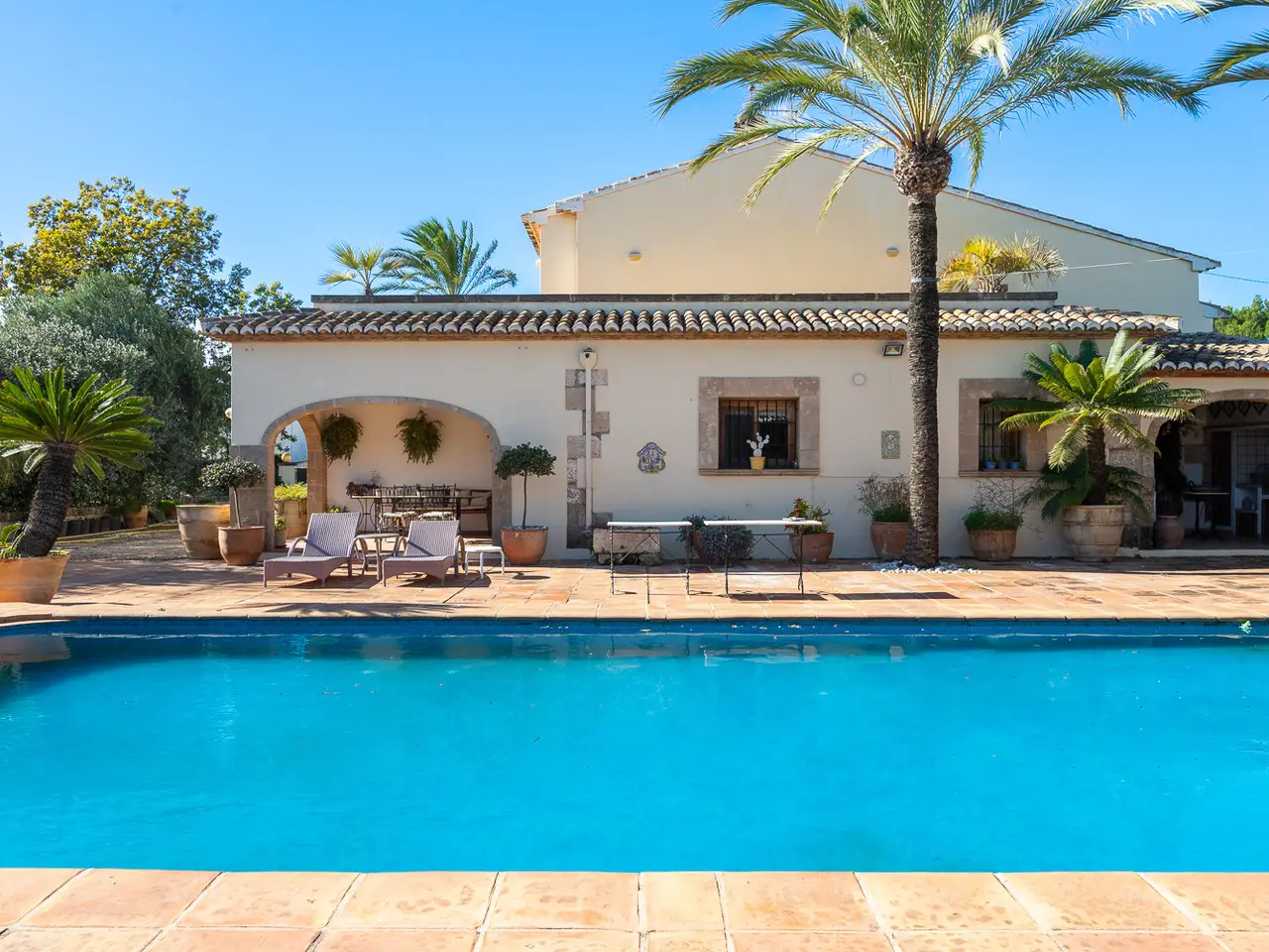 A magnificent property is presented in the quiet area of Senioles, in Jávea, Alicante. This property has a large plot of 2,436 m², completely flat, offering an ideal space to enjoy outdoor life. It has an orchard with different types of fruit trees. With 4 bedrooms and 3 bathrooms, of which 2 are en suite, this villa is perfect for families or those looking for comfort and privacy. The proximity to the old town, the port and the beach makes it an unbeatable option for living all year round or vacationing. The villa is characterized by a large naya typical of the area, with tosca arches, followed by a spectacular entrance hall with views of the interior patio, which is ideal for outdoor dinners or gatherings throughout the year. Next is the large living room with fireplace, sunny and very cozy, dining area, kitchen and laundry room. On this same floor there are two bedrooms and a bathroom. From the kitchen you can access the porch that overlooks the pool, which has a large terrace around it to enjoy the sun, with a dining area under the palm trees and next to the barbecue with typical Valencian tiles. From the large entrance hall you can access the upper floor, where you will find the spectacular and bright master bedroom with its en-suite bathroom and two open terraces, one with views of the Montgó and the other facing south, with open views of the valley. Through an elegant corridor, with a balcony overlooking the inner courtyard, you can reach another bedroom with an en-suite bathroom. The exterior of the property is equally impressive, with large areas, plants and fruit trees. It is worth highlighting the pool and the entire surrounding area, very private and comfortable due to its proximity to the kitchen, porch and barbecue, where in summer time people spend almost all day together. The interior patio of the house is one of the most welcoming spots, full of plants, with stone and rough walls, the floor is paved, imitating the old one of the town's church square. In addition, it has a large garage, a DIY and storage area. It has an alarm system for added security. Due to all its features, this villa is a unique opportunity. Without a doubt, it is an ideal option for those looking for a comfortable home in a privileged environment.