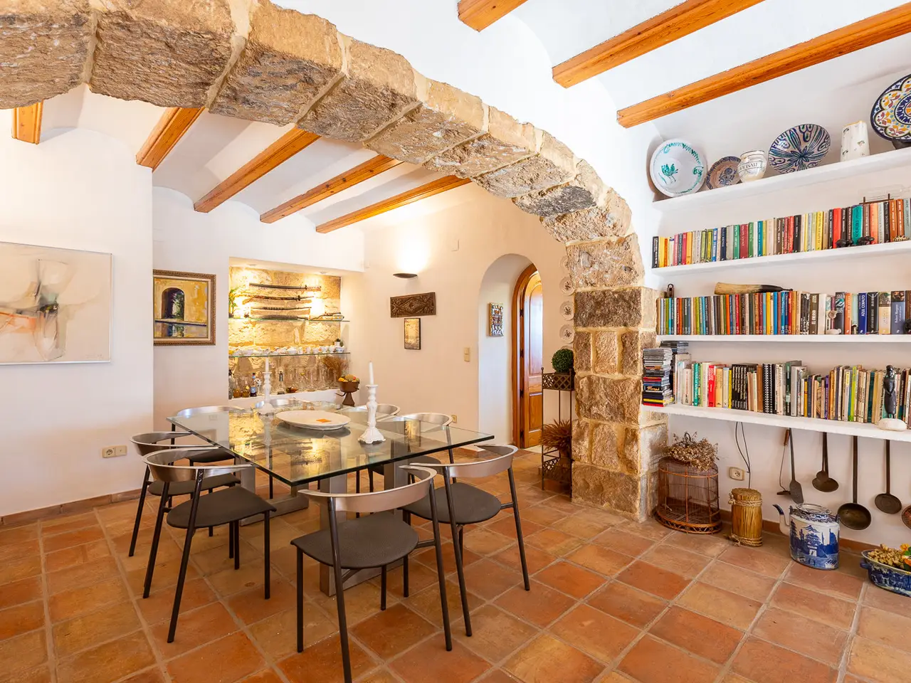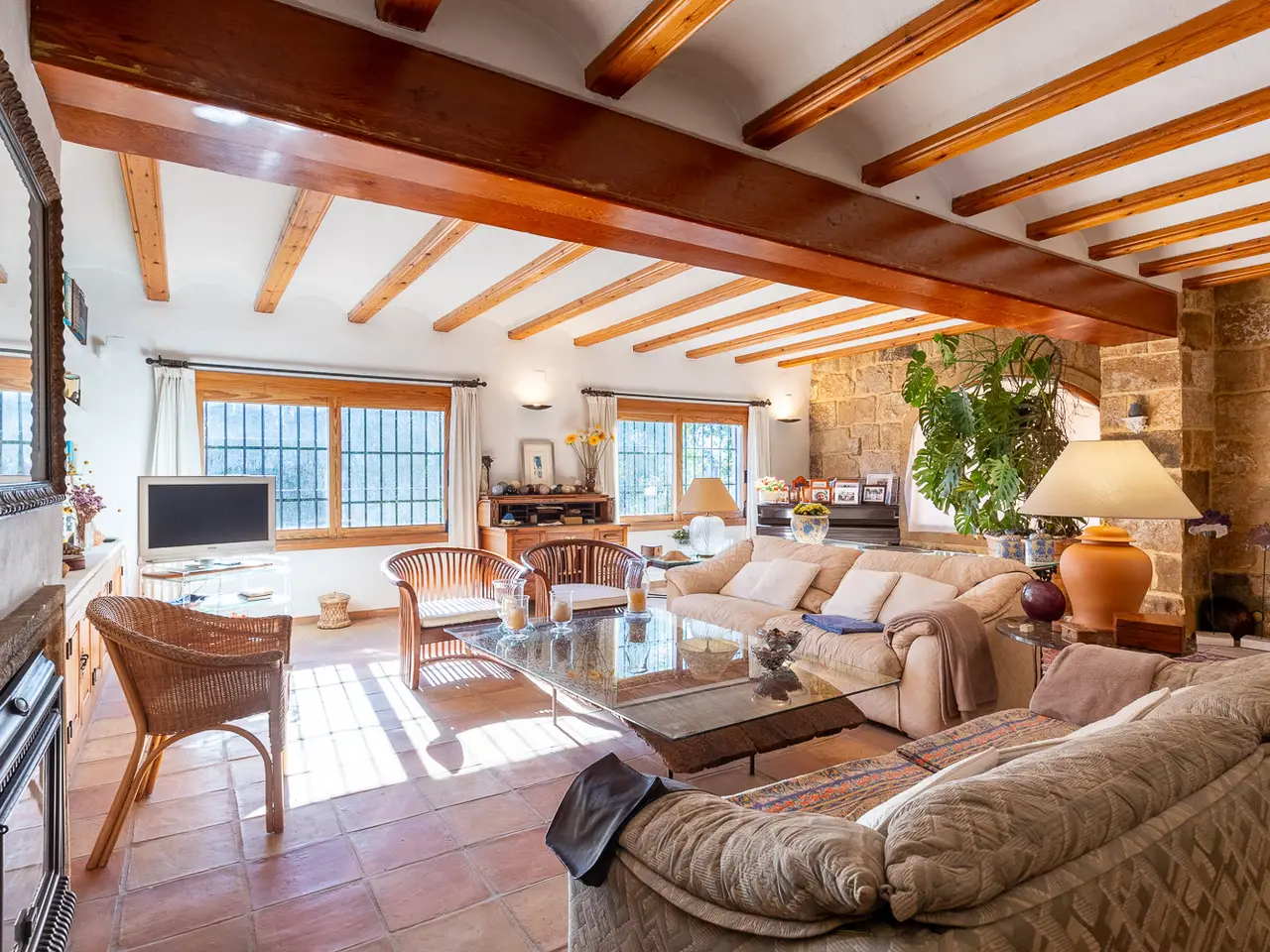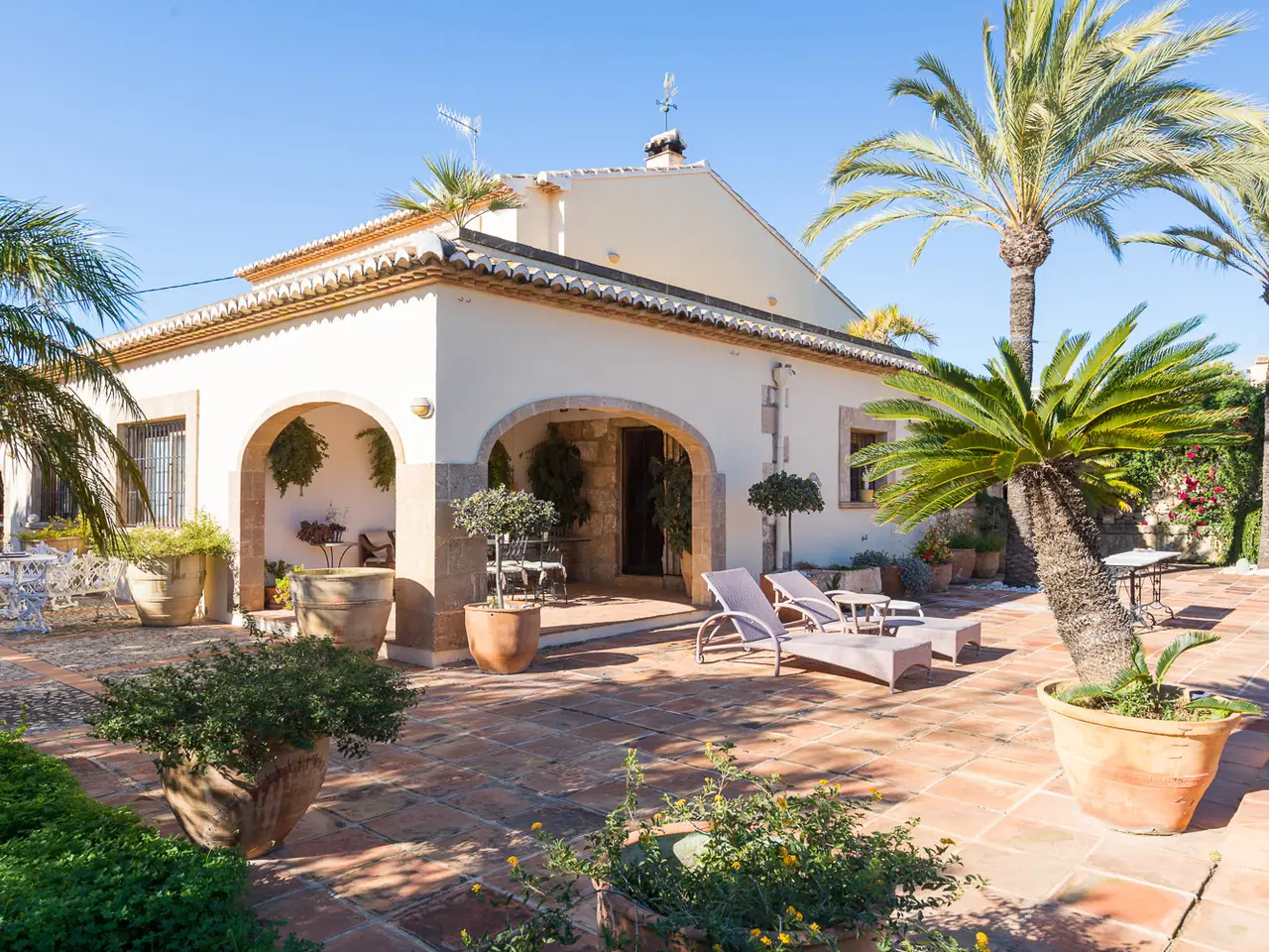 A magnificent property is presented in the quiet area of Senioles, in Jávea, Alicante. This property has a large plot of 2,436 m², completely flat, offering an ideal space to enjoy outdoor life. It has an orchard with different types of fruit trees. With 4 bedrooms and 3 bathrooms, of which 2 are en suite, this villa is perfect for families or those looking for comfort and privacy. The proximity to the old town, the port and the beach makes it an unbeatable option for living all year round or vacationing. The villa is characterized by a large naya typical of the area, with tosca arches, followed by a spectacular entrance hall with views of the interior patio, which is ideal for outdoor dinners or gatherings throughout the year. Next is the large living room with fireplace, sunny and very cozy, dining area, kitchen and laundry room. On this same floor there are two bedrooms and a bathroom. From the kitchen you can access the porch that overlooks the pool, which has a large terrace around it to enjoy the sun, with a dining area under the palm trees and next to the barbecue with typical Valencian tiles. From the large entrance hall you can access the upper floor, where you will find the spectacular and bright master bedroom with its en-suite bathroom and two open terraces, one with views of the Montgó and the other facing south, with open views of the valley. Through an elegant corridor, with a balcony overlooking the inner courtyard, you can reach another bedroom with an en-suite bathroom. The exterior of the property is equally impressive, with large areas, plants and fruit trees. It is worth highlighting the pool and the entire surrounding area, very private and comfortable due to its proximity to the kitchen, porch and barbecue, where in summer time people spend almost all day together. The interior patio of the house is one of the most welcoming spots, full of plants, with stone and rough walls, the floor is paved, imitating the old one of the town's church square. In addition, it has a large garage, a DIY and storage area. It has an alarm system for added security. Due to all its features, this villa is a unique opportunity. Without a doubt, it is an ideal option for those looking for a comfortable home in a privileged environment.