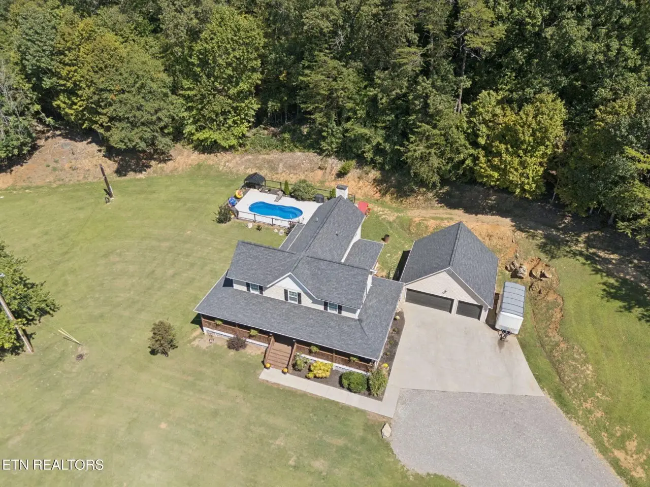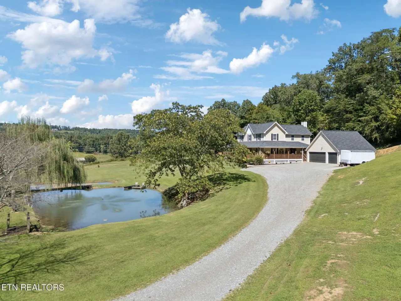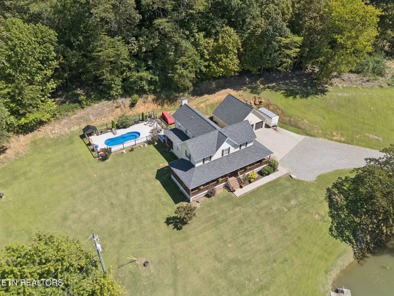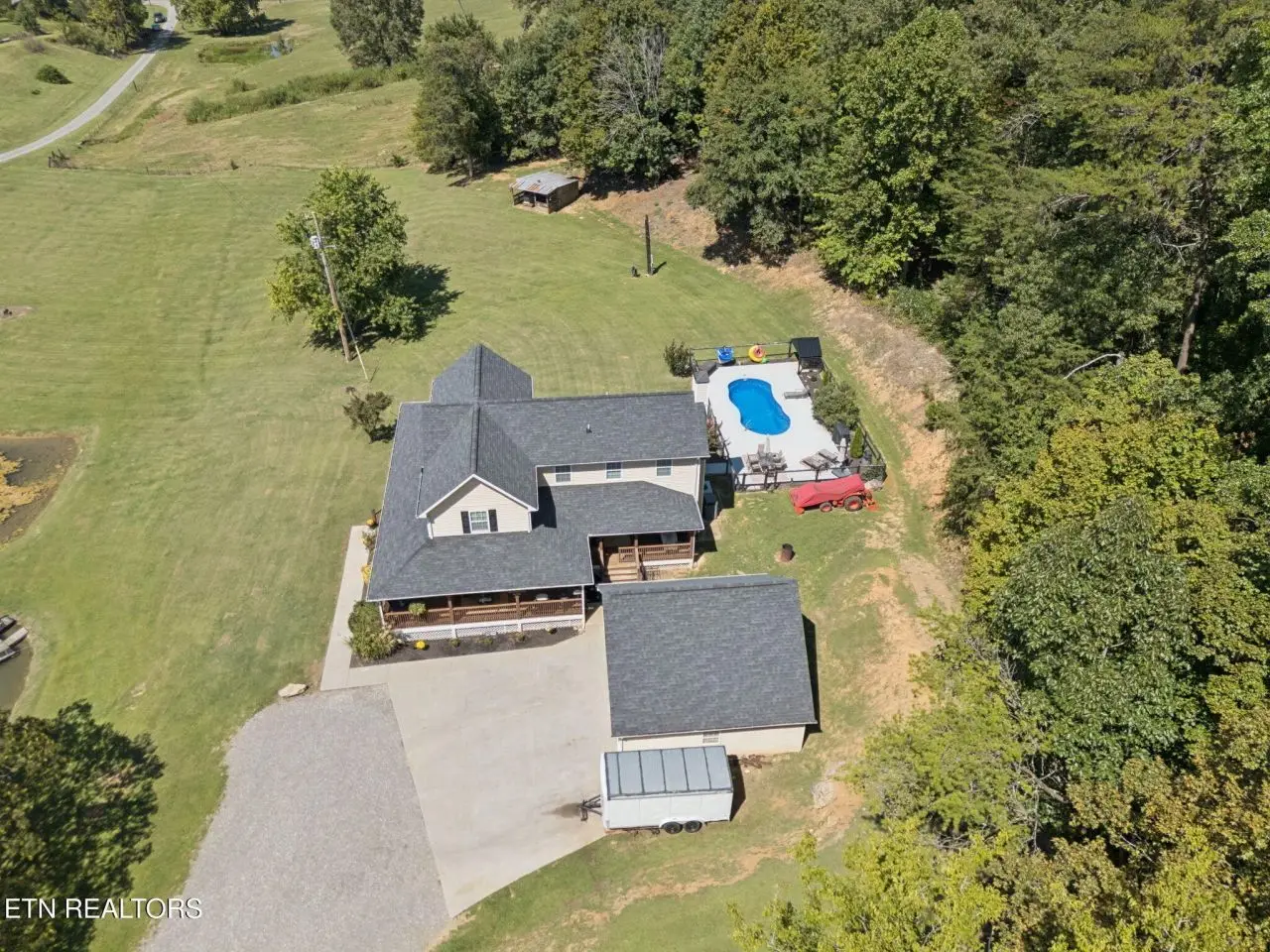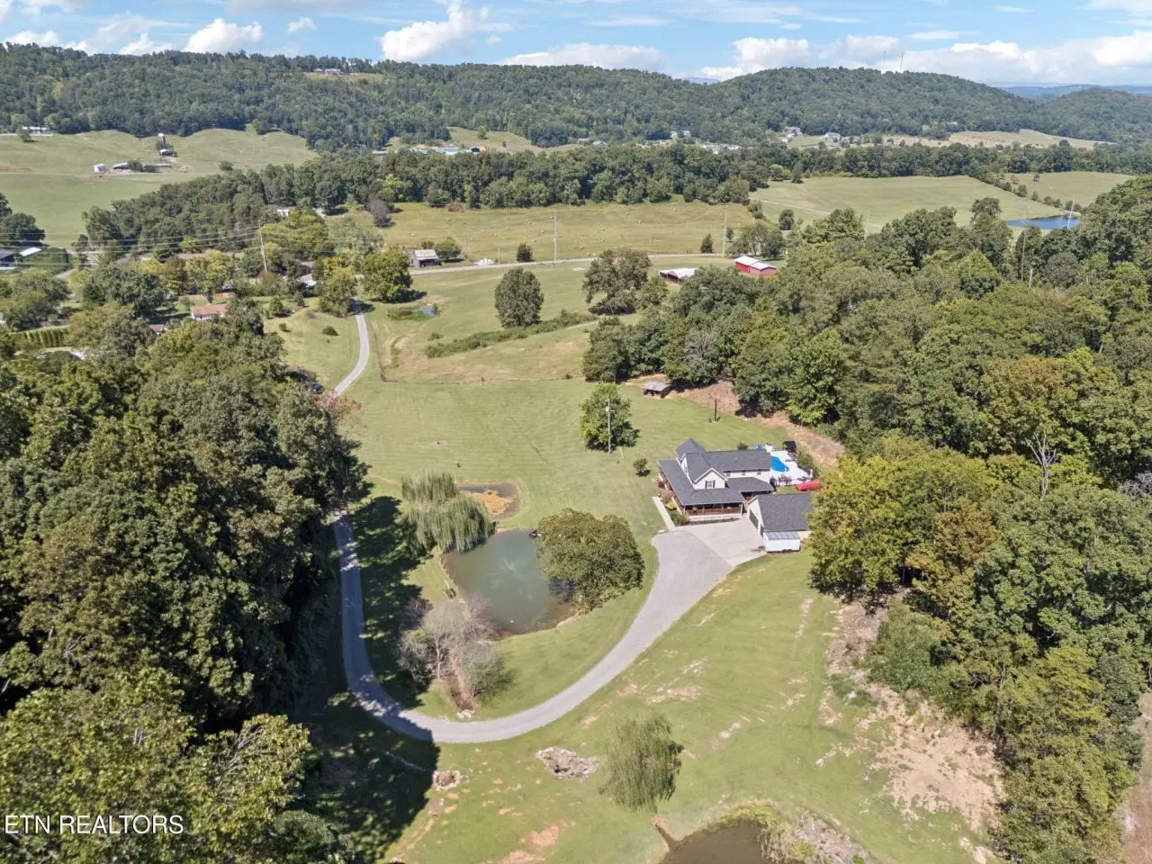 ''Welcome Homestead'' Almost 8 Acres of unrestricted land in between Knoxville and Sevierville; 2960 sq ft home enhanced with a 3/4 wrap around porch; its own spring water with 3 spring fed ponds stocked; small barn; portion cleared with more if need be to expand your pasture for your future homestead. The fiberglass pool with a surround patio awaits your floats. Entering this farmstyle home you are greeted to hardwood flooring; vaulted ceilings; a bedroom on main floor with a living area flowing into the kitchen area offers 3 tone custom maple cabinetry; granite counter tops; composite granite double sink; newer appliances; and a center island; laundry is conveniently located for life ease. Sweeping upstairs on hardwood flooring, there are 3 updated bedrooms including a large master suite area. New roof in 2020; new tankless water heater in 2024; one new heating/cooling unit installed in 2024. There is also a separate septic system with another electric pole for another home. Property is ready for your small farm and peace. 36 miles to Dollywood and University of Tennessee is 25 miles from this oasis of peace. ''Come On Homestead'' Buyer to verify information before making an informed offer.