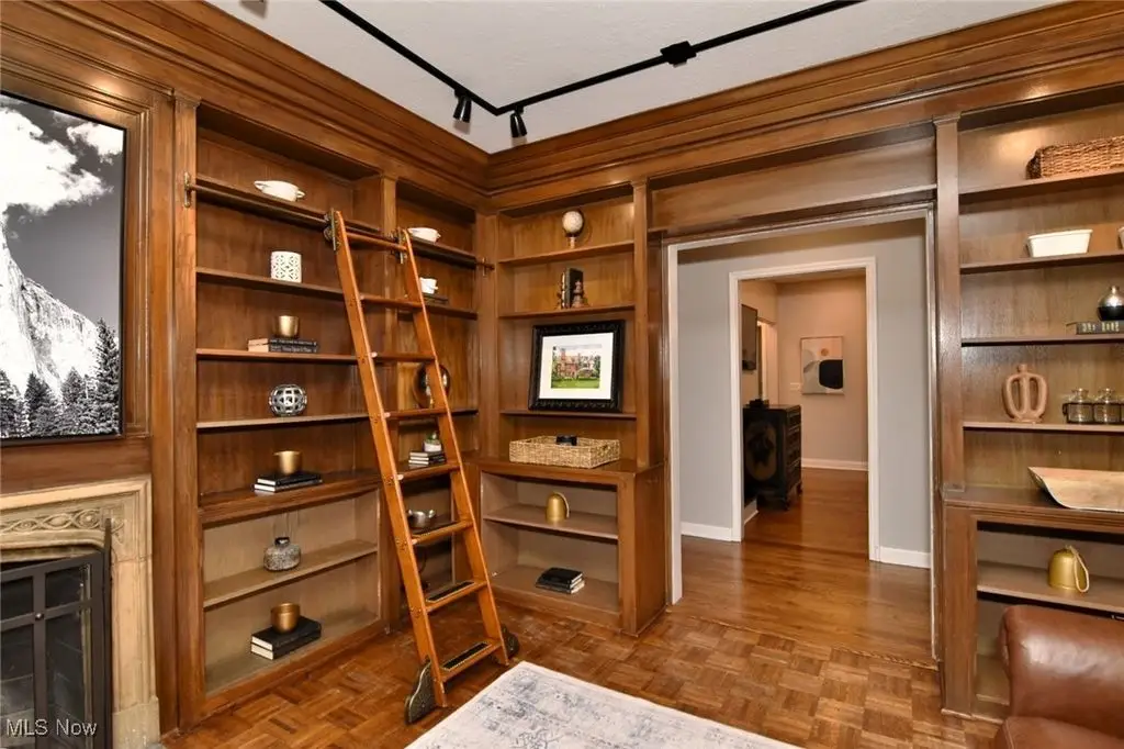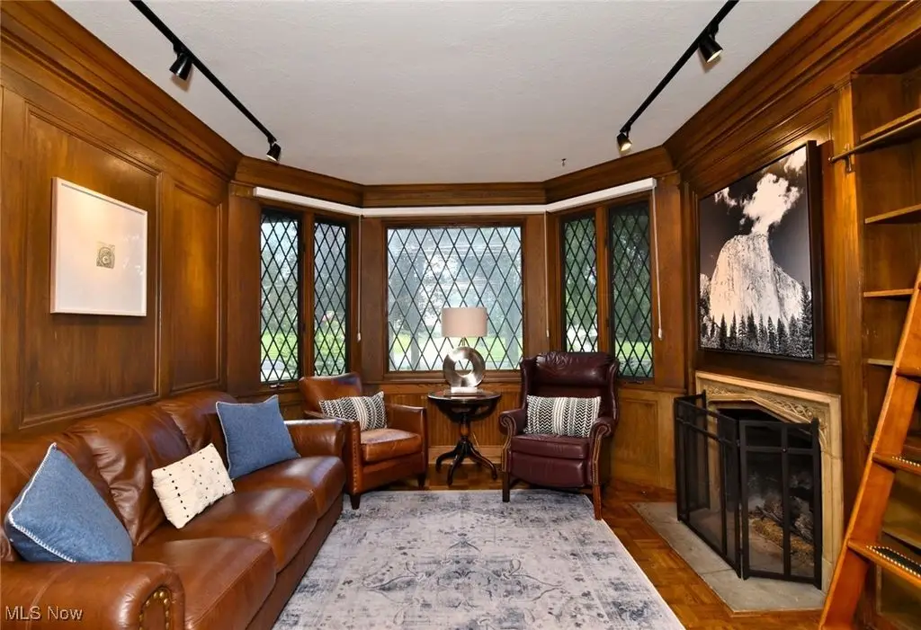 Wood-paneled library with fireplace