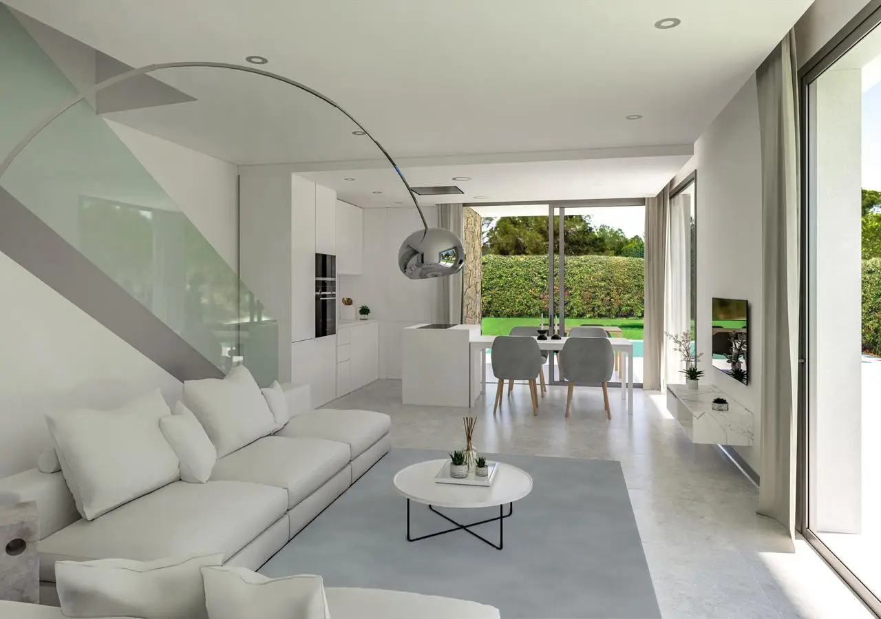 Essential House is a residential complex of detached homes with 3 or 4 bedrooms and 3 full bathrooms, two of which are ensuite. The plots, ranging from 590 to 700 m2, are south-facing and offer sea and mountain views, where light fills every room. The homes are equipped with hot/cold air conditioning, high-end appliances, and a selection of top-quality materials. Additionally, they feature a spacious garden area and a private pool. They are located in Sierra Cortina Resort, one of the most prestigious residential areas on the Costa Blanca.