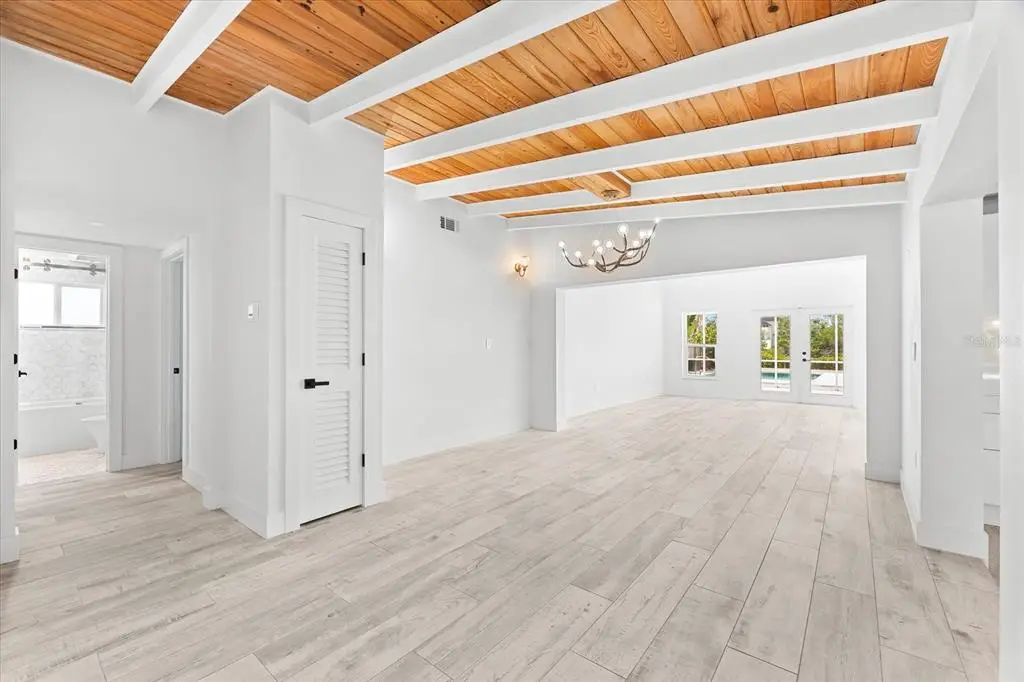Soaring ceilings clad in hand-cut cypress wood shiplap