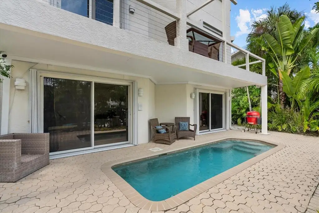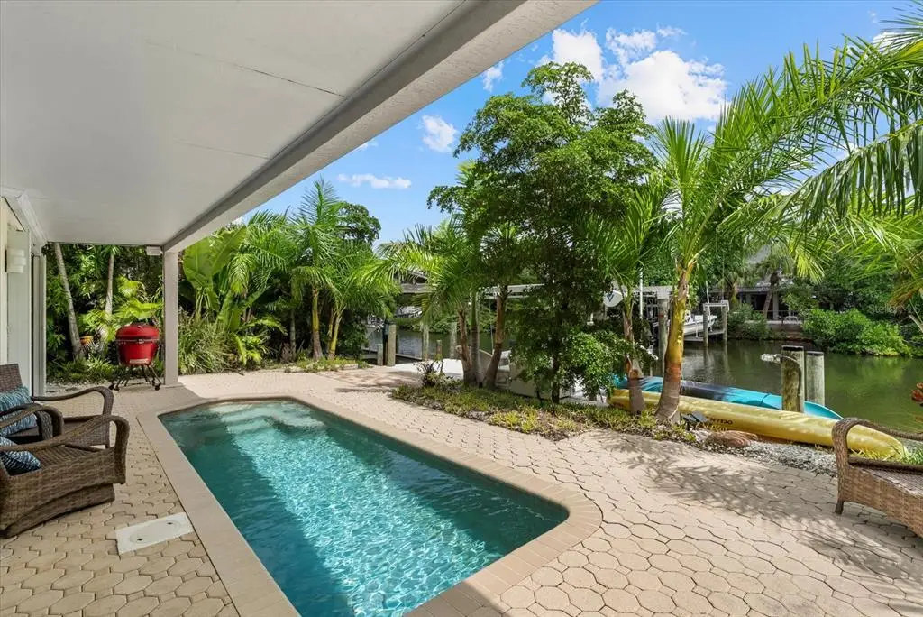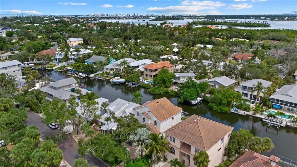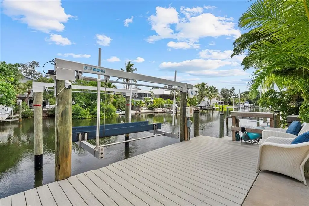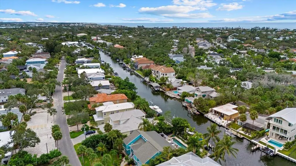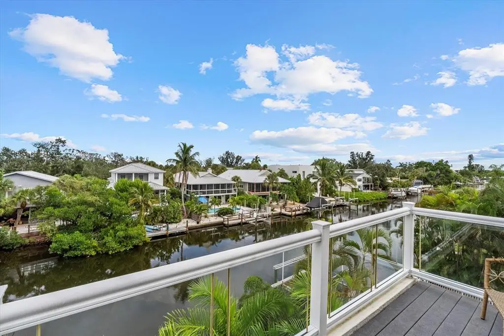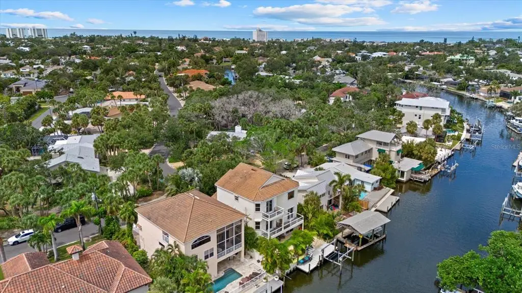 Welcome to your Siesta Key waterfront retreat with natural light and perfectly positioned on the Grand Canal. Elevated for peace of mind and crafted for coastal living, this three-story, 3-bedroom home with den/guest room celebrates time on the water from the moment you arrive. The main level opens to a large canal-view balcony and features a bright living room with a 22 ft ceiling, a defined dining area, and a chefÆs oasis kitchen anchored by a center islandùoffering abundant storage, wood cabinetry, stainless-steel appliances, and expansive prep surfaces for effortless entertaining. Upstairs, the private primary suite spans the top floor with an adjacent office, a generous walk-in closet, and a spacious bathroom with dual sinks, soaking tub, and walk-in shower. Sliders open to your own third-floor balcony with beautiful canal views. The ground level offers a 2-car garage plus 700 sq ft of air-conditioned flex space (not included in main living area) with sliders to the pool and boat dockùideal for a gym, rec lounge, or entertaining space. A private elevator connects all three levelsùfrom the garage to the main living space and top-floor suite. Outside is a boaterÆs dream: deep-water frontage on the Grand Canal with quick access to Roberts Bay, Sarasota Bay, and the Gulf; composite decking, a 10,000-lb lift, and a seawall with turn-backs (all new as of Nov 2021). A clever two-level dock allows easy tide-height boarding and effortless kayak launches. This elevated Grand Canal home is perfect for boating, kayaking, paddle boarding, and daily dolphin/manatee watching. Lush, mature landscaping (on an irrigation well) wraps the property in privacy. All a short bike ride or walk to Siesta Key Village dining/shopping and world-famous Siesta Beach.