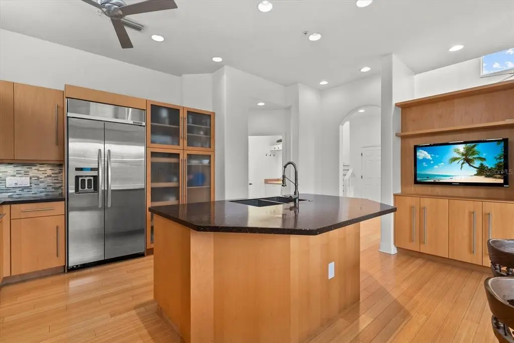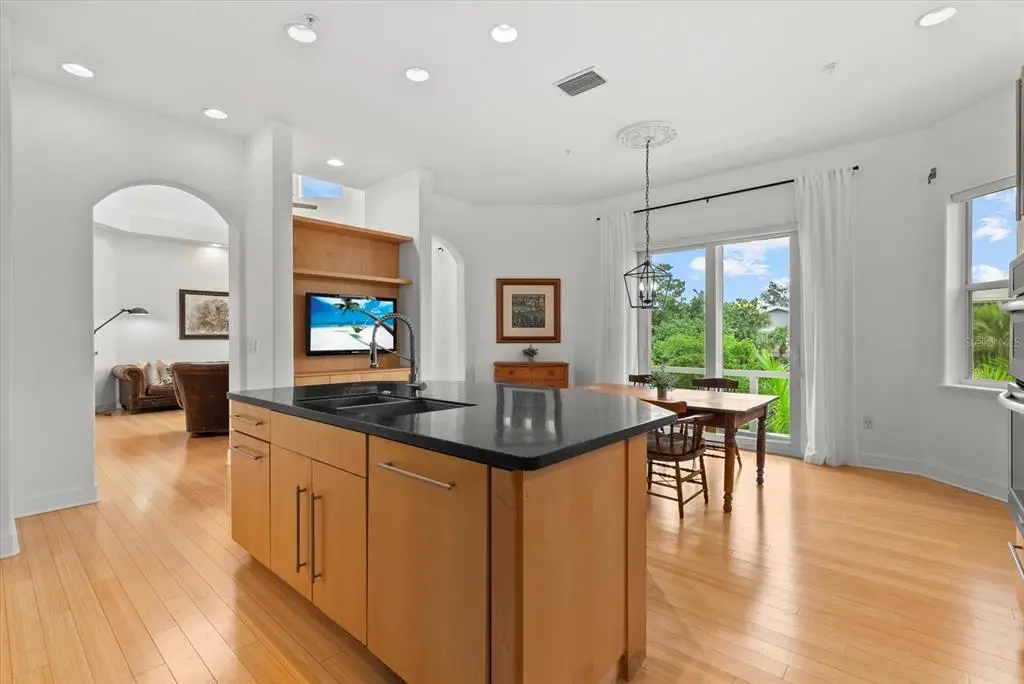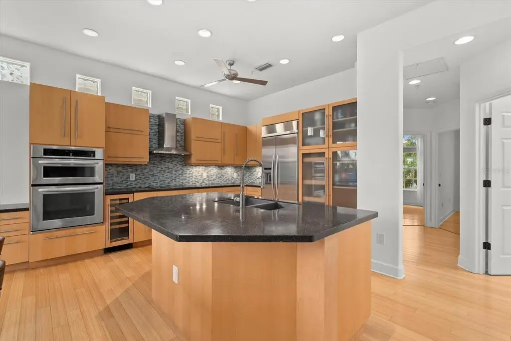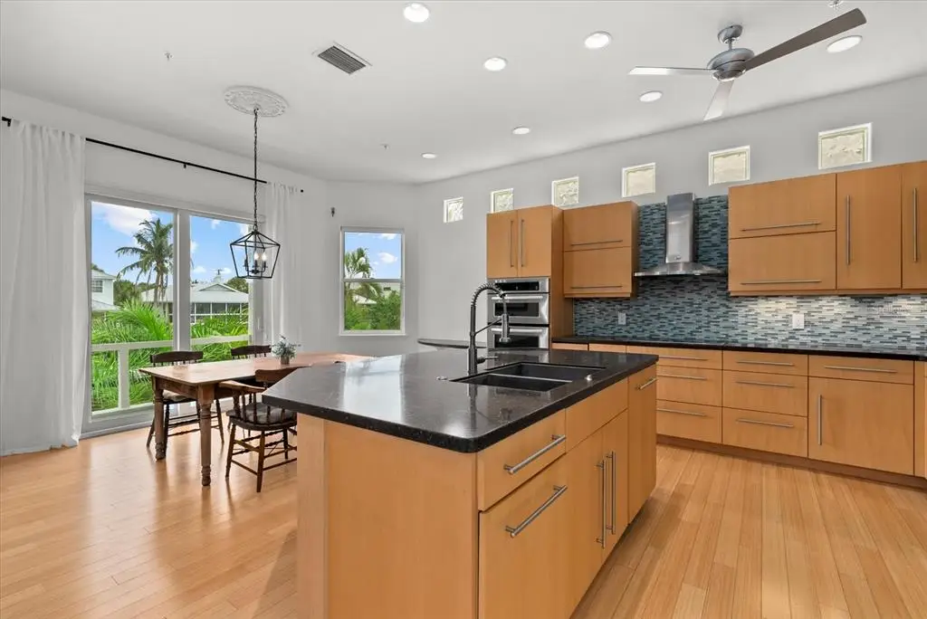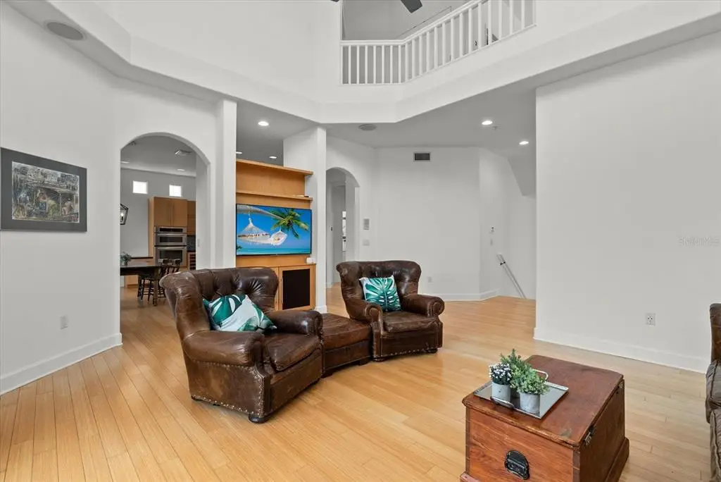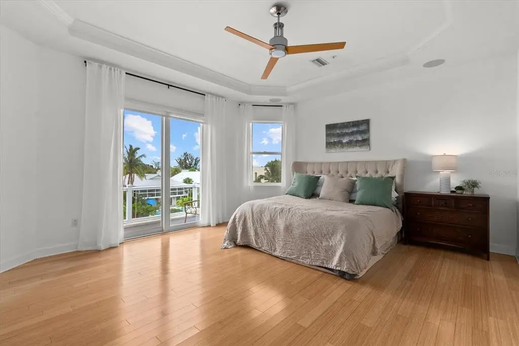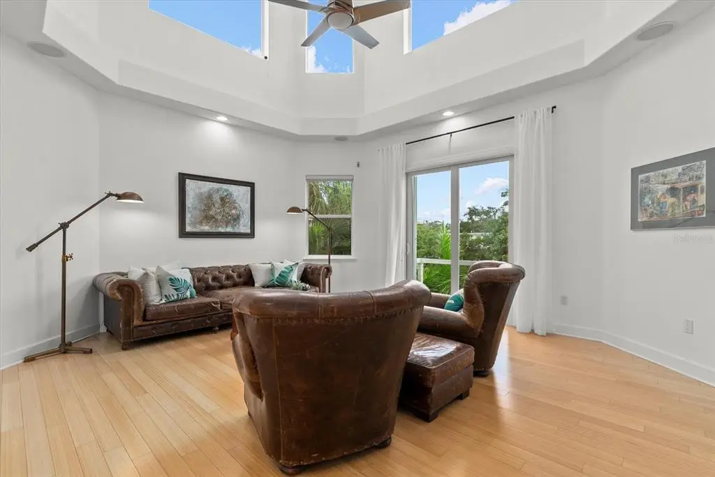 Welcome to your Siesta Key waterfront retreat with natural light and perfectly positioned on the Grand Canal. Elevated for peace of mind and crafted for coastal living, this three-story, 3-bedroom home with den/guest room celebrates time on the water from the moment you arrive. The main level opens to a large canal-view balcony and features a bright living room with a 22 ft ceiling, a defined dining area, and a chefÆs oasis kitchen anchored by a center islandùoffering abundant storage, wood cabinetry, stainless-steel appliances, and expansive prep surfaces for effortless entertaining. Upstairs, the private primary suite spans the top floor with an adjacent office, a generous walk-in closet, and a spacious bathroom with dual sinks, soaking tub, and walk-in shower. Sliders open to your own third-floor balcony with beautiful canal views. The ground level offers a 2-car garage plus 700 sq ft of air-conditioned flex space (not included in main living area) with sliders to the pool and boat dockùideal for a gym, rec lounge, or entertaining space. A private elevator connects all three levelsùfrom the garage to the main living space and top-floor suite. Outside is a boaterÆs dream: deep-water frontage on the Grand Canal with quick access to Roberts Bay, Sarasota Bay, and the Gulf; composite decking, a 10,000-lb lift, and a seawall with turn-backs (all new as of Nov 2021). A clever two-level dock allows easy tide-height boarding and effortless kayak launches. This elevated Grand Canal home is perfect for boating, kayaking, paddle boarding, and daily dolphin/manatee watching. Lush, mature landscaping (on an irrigation well) wraps the property in privacy. All a short bike ride or walk to Siesta Key Village dining/shopping and world-famous Siesta Beach.