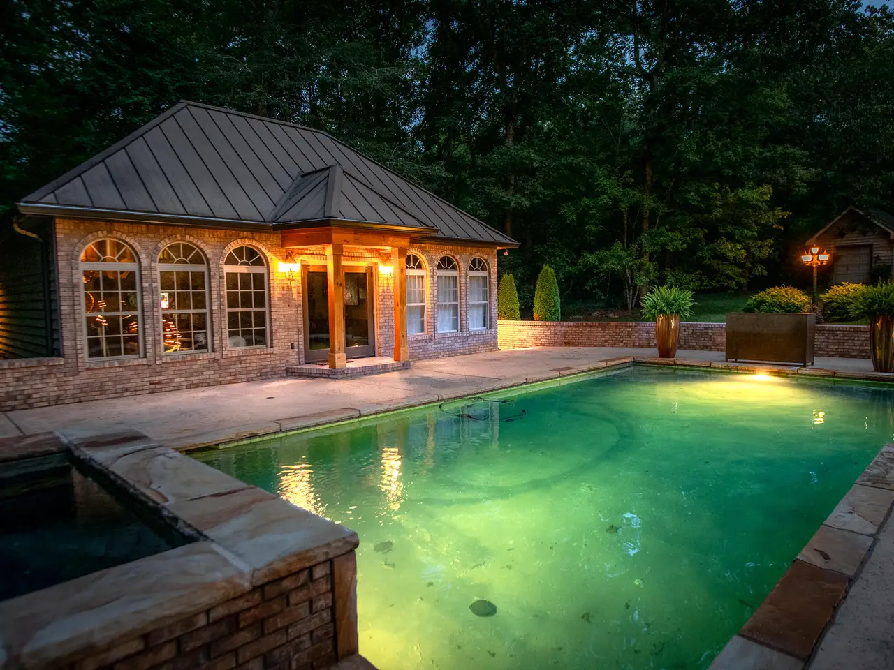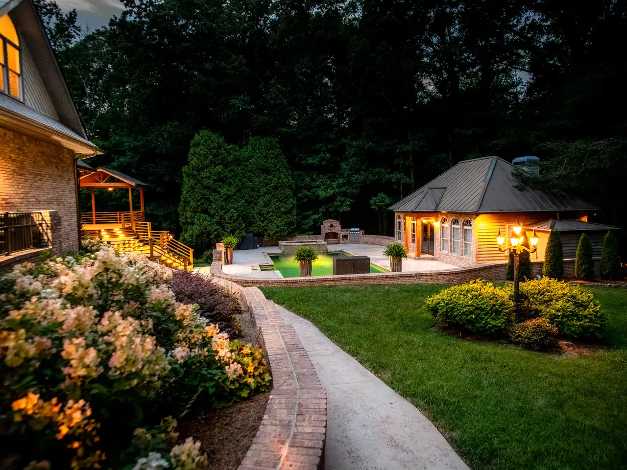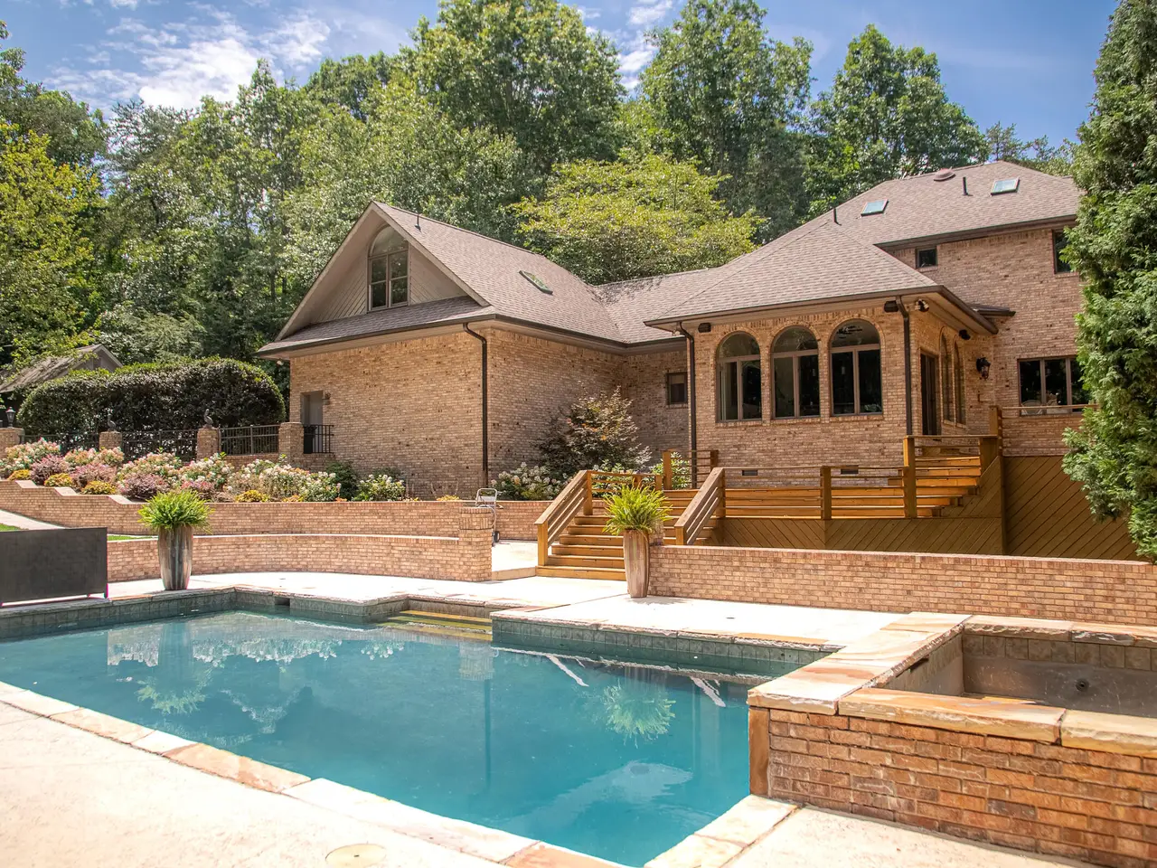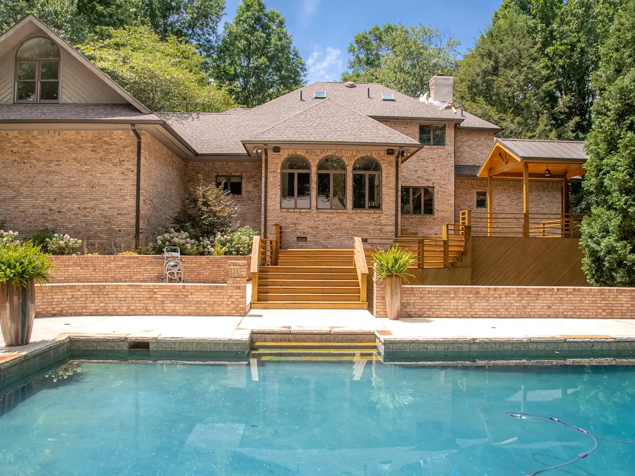 Fabulous estate property on 3.3 acres in the heart of Signal Mountain, offers both privacy and luxurious resort-style living. A long driveway through lush grounds leads you to the home. The all brick home features 10 foot ceilings, hardwood flooring, fireside den and living room, dining room, kitchen, office with built-ins, powder room, spacious primary bedroom on the main level with new Calacatta tile shower, chef's kitchen with Viking, Wolf and Kitchen Aid appliances, custom cabinetry and granite countertops. A most inviting sunroom overlooks the salt water pool, spa, 3 tiered decking with Pergola, outdoor fireplace, gathering and grilling area and pool/guest house - a true oasis to come home to! Upstairs are 2 additonal bedrooms each with ensuite bath. A separate stairway leads to the light filled 4th bedroom/bonus room and bath. There is a main level 3 car garage and a lower level gym/workshop. The main house has 3,989 square feet with an additional 584 square feet in the lower level gym space. The 710 square foot poolside studio guest house offers a fireside living area, kitchen with all Kitchen Aid Appliances and Laundry and 5th bedroom and bath. The grounds are truly stunning - and so very private. a year round spring runs parallel to the back yard for added privacy. Beautiful hardwood trees and native plants provide a lush setting. There is a charming garden shed in the backyard and an additonal building with garage door that has a car lift for working on cars/storage and workshop. The entire backyard is fenced and there is a separate fenced area for dogs. Zoned for top rated Signal Mountain schools, 72 Cool Springs is more than a home, it is a lifestyle!