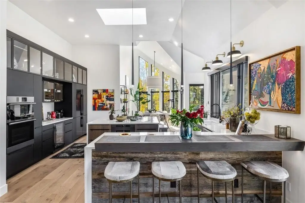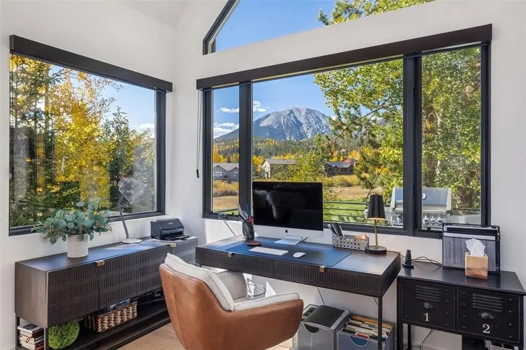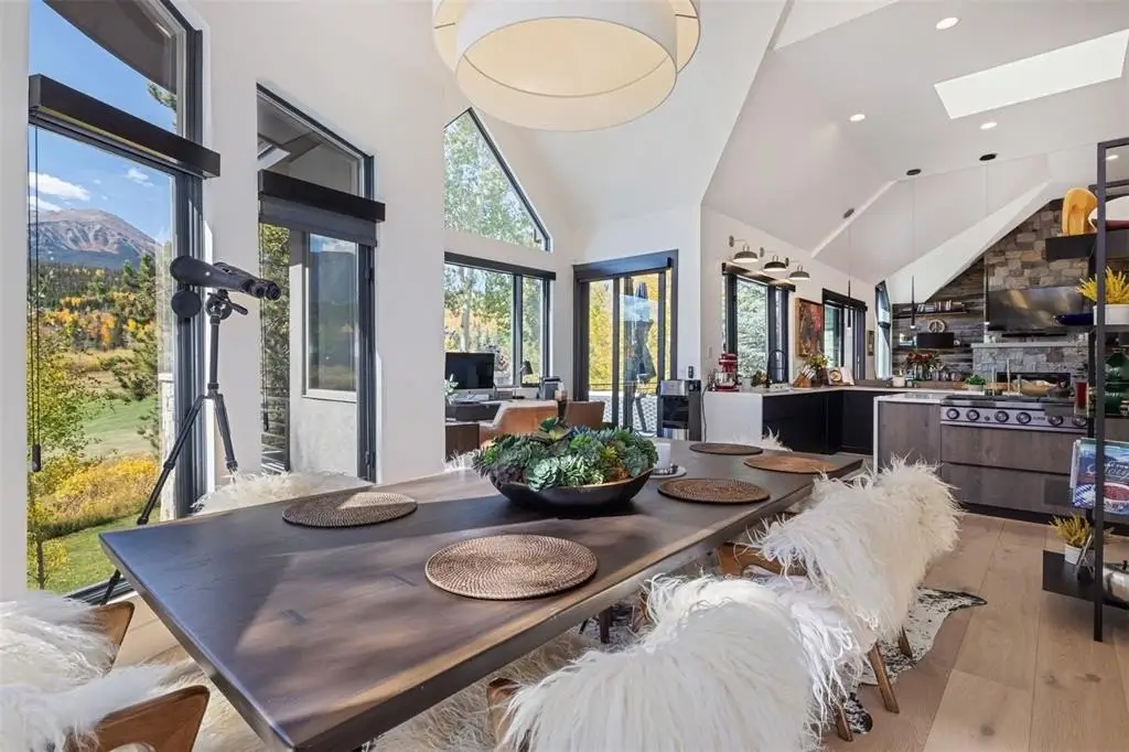 A Sanctuary of Sunlight, Soul and Sophistication. Welcome to this mountain masterpiece where luxury meets serenity. Perched on the 6th hole of the Raven Golf Course and framed by awe inspiring views of Buffalo and Red Mountains, this custom designed home with thoughtful upgrades throughout is a sanctuary of sunlight, style and stunning mountain and golf course views. Thoughtfully designed by the award-winning Allen Guerra Architecture firm when expanded and remodeled in 2022, every inch of this residence radiates warmth, creativity, and elegance. Step through to the beautiful entry and soaring vaulted ceilings, enjoy the wide plank oak floors, and reclaimed wood accent walls that echo the natural beauty outside. The open-concept great room flows seamlessly into a chef’s kitchen adorned with European custom cabinetry, Dacor black stainless appliances, and a sunlit nook or work from home alcove, perfect for morning coffee or quiet reflection. Four custom indoor stone fireplaces, an expansive family room with billiards and bar, peaceful outdoor spaces and an oversized bunk suite offer space for both connection and retreat. The main level primary and secondary suites each feature private fireplaces and outdoor access and decks, while the expansive deck and lower patio, each with fire pits and panoramic views invite year-round enjoyment. Surrounded by mature Aspen and evergreens, this home offers peace and privacy just minutes from Silverthorne’s trails and town center. With an oversized 3-car garage, abundant storage, and refined finishes throughout, this is more than a home, it’s a place to enjoy the surrounding nature to the fullest.