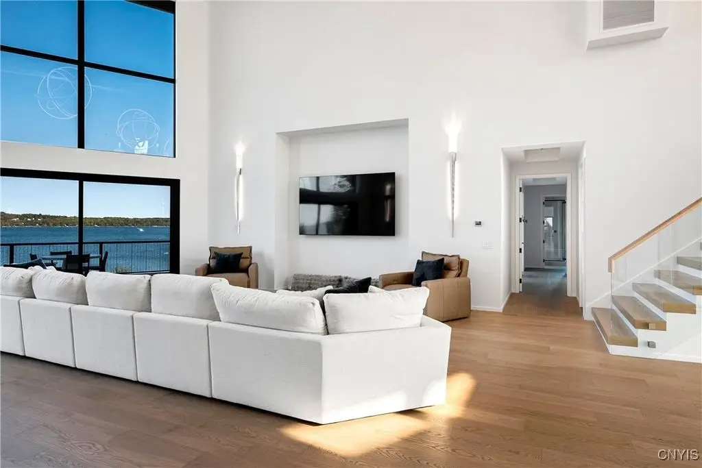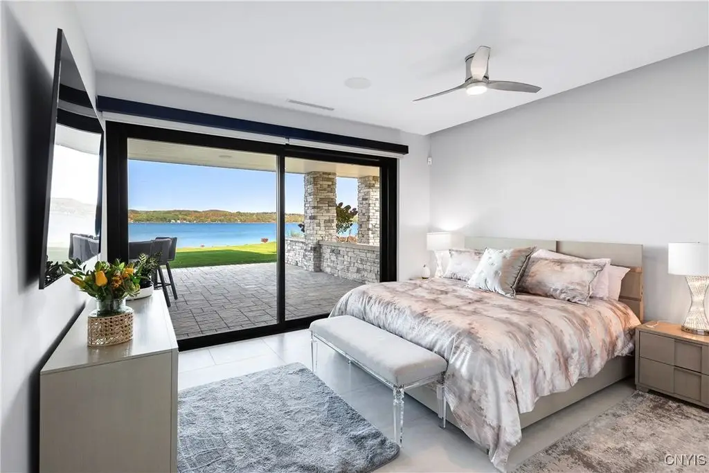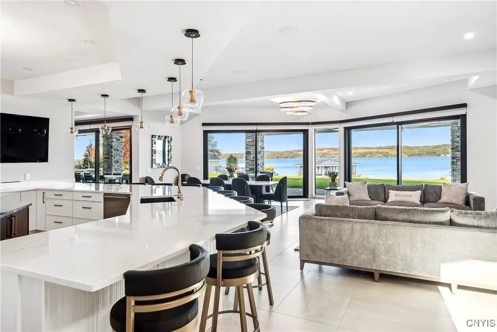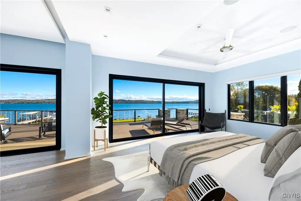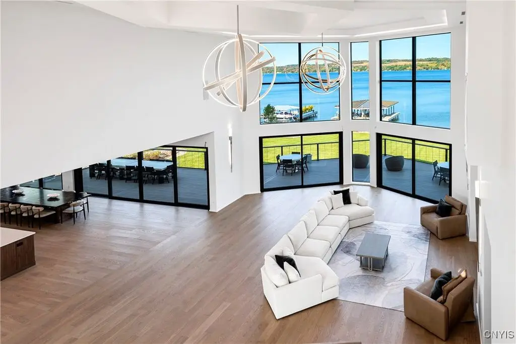 Wow, prepare to be amazed by this stunning custom-built contemporary home situated on 200 feet of pristine lakefront on Skaneateles Lake. With a fully developed waterfront perfect for all your lakeside and boating activities, this newly constructed "Mansion" offers luxury living at its finest. Featuring 9 bedrooms, 14 baths, 2 Chef's kitchens, a guest suite, and a full glass elevator accessing all levels of the home, no detail has been overlooked. State-of-the-art technology including Savant WIFI controlled custom blinds and lighting scenes, along with top-notch infrastructure, ensure convenience and comfort. Boasting over 12,000 square feet of living space with an adaptable floor plan, each bedroom comes complete with its own en-suite bath and custom California closets. The home exudes both space and privacy, providing a truly luxurious living experience. Located in the prestigious Skaneateles School District and just minutes from the charming Village of Skaneateles, this home offers an extensive list of impressive features and amenities. Don't miss the opportunity to make this incredible property your own.