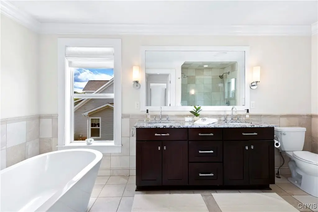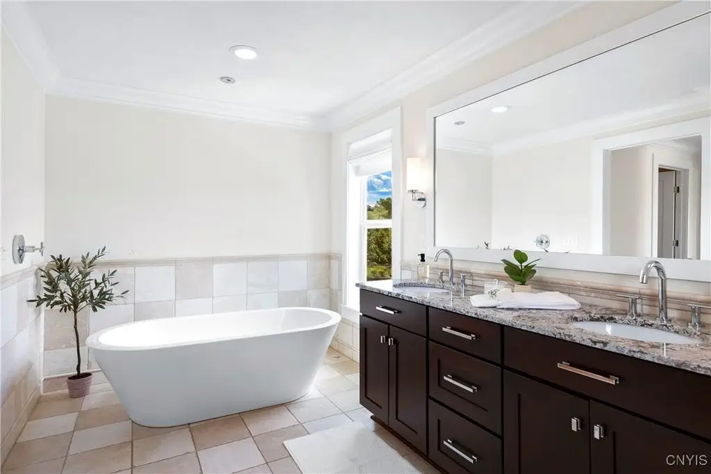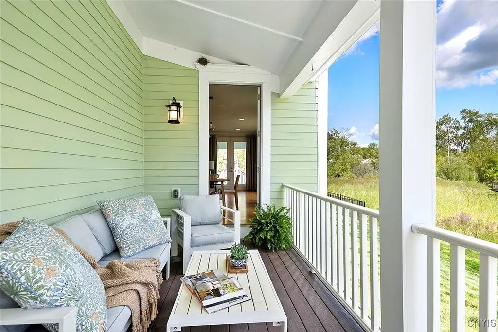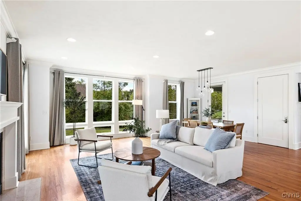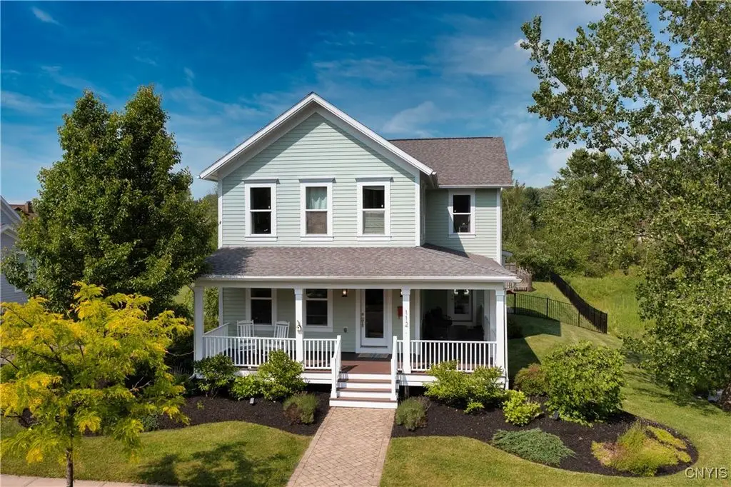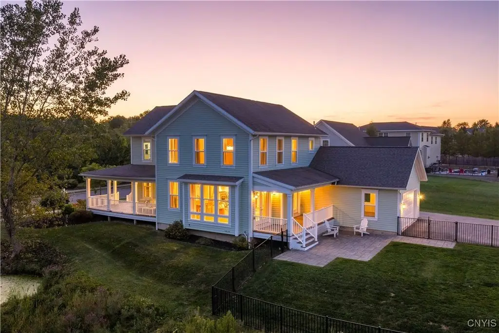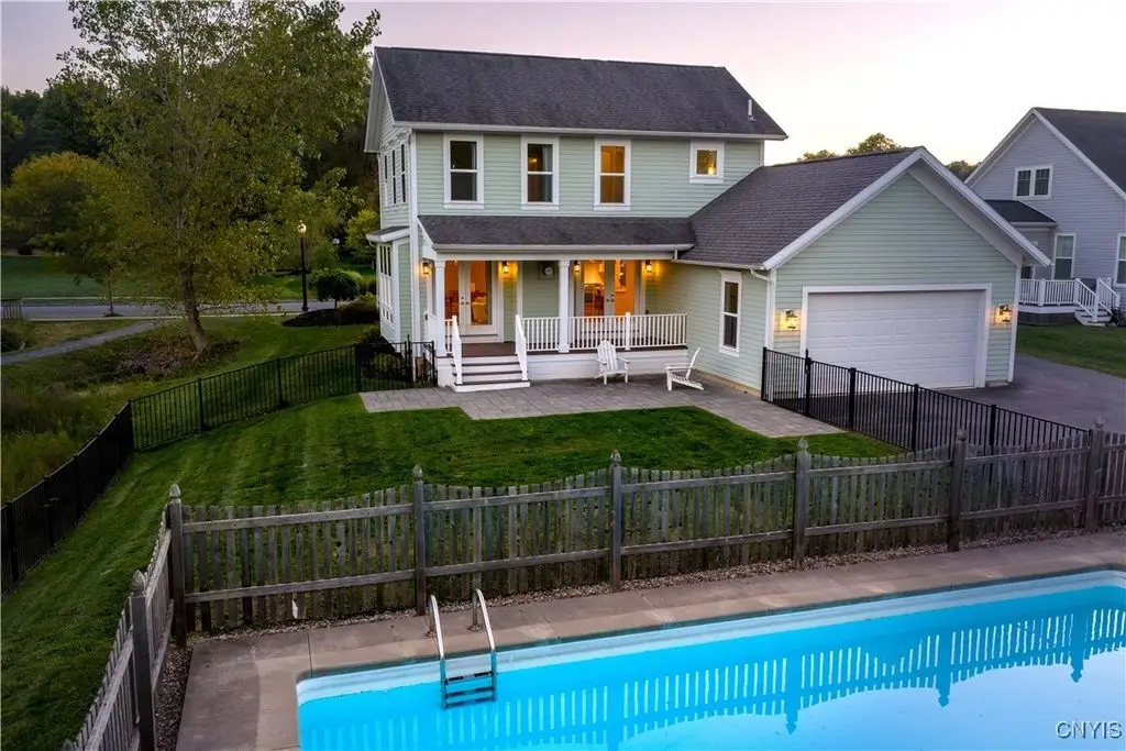 Stunning 2010-built home in award-winning Skaneateles school district offers 3,353 SF of luxury living on a .85 acre lot. This beautiful home features high ceilings and plentiful natural light. There is an open concept great room, 4 bedrooms, 3.5 bathrooms, a floor office/playroom, and a finished basement with a gym, family room, or additional bedroom. The gourmet kitchen boasts Thermador professional appliances, including a 6-burner gas range, granite countertops, a large eat-in island, and a walk-in pantry. Hardwood floors throughout the home create elegant continuity. The primary suite includes two separate walk-in closets and a spa-like bathroom with a soaking tub that is filled from the ceiling and a double-headed shower with glass doors. Additional highlights include a gas fireplace, second-floor laundry, and a mudroom. Outside, maintenance-free, Azek porches wrap around the front of the house with an additional covered porch in the back. The heated, 16x32 saltwater pool features electric heating (rare village approval, which results in lower heating costs) and an expansive patio area. Cedar pool fencing and PVC railings ensure low maintenance. This remarkable lot includes the detention pond land and adjacent stream, providing a natural buffer and forever-wild views despite the neighborhood location. Outside the front door, the view is a lovely, landscaped, park-like property. Walking distance to Skaneateles Village shops, restaurants, and the lake with easy trail access. Attached 2-car garage plus detached 1-car garage. Move-in ready luxury in an unbeatable location.