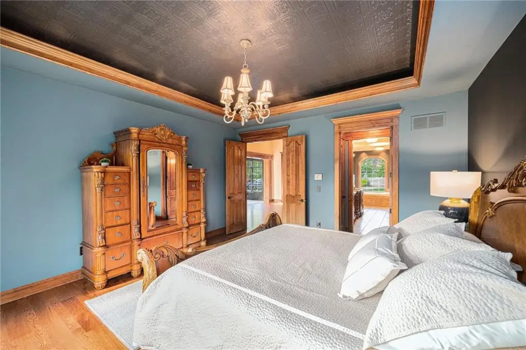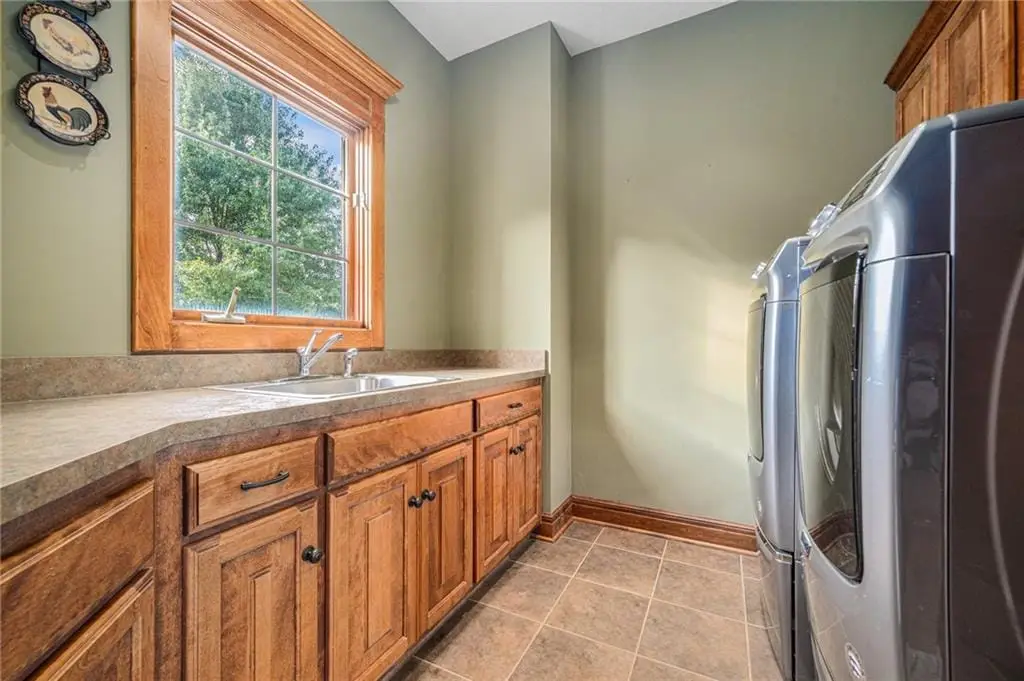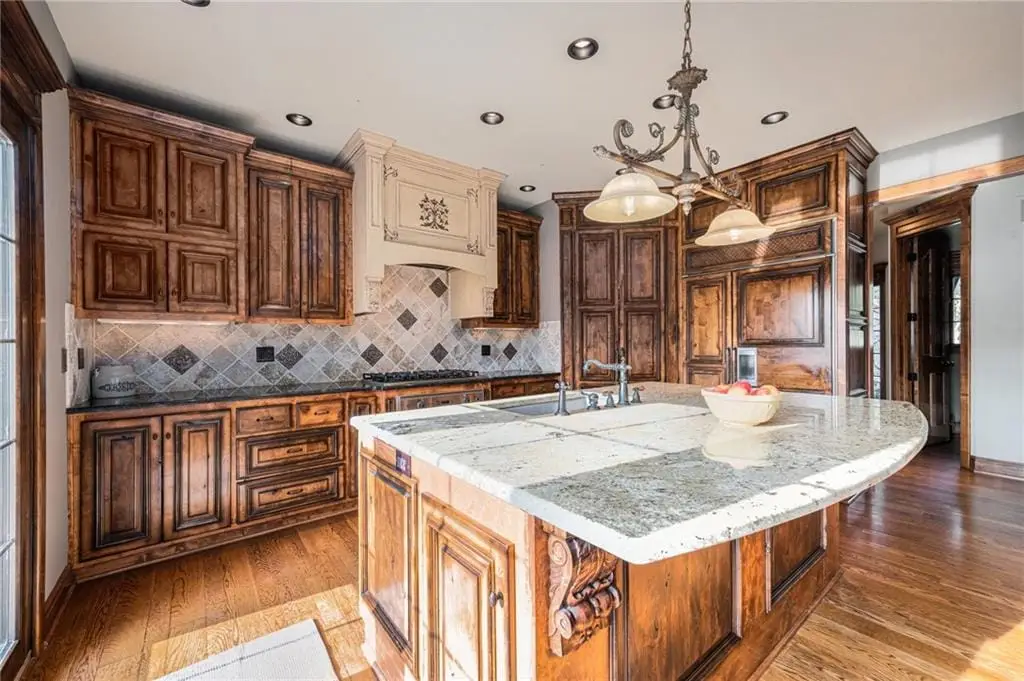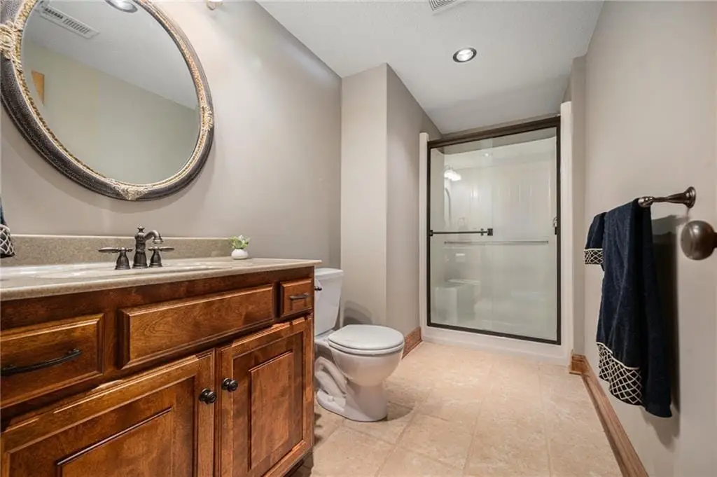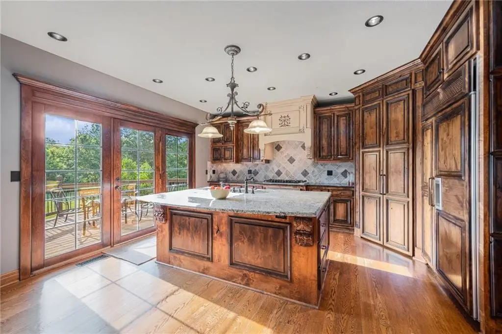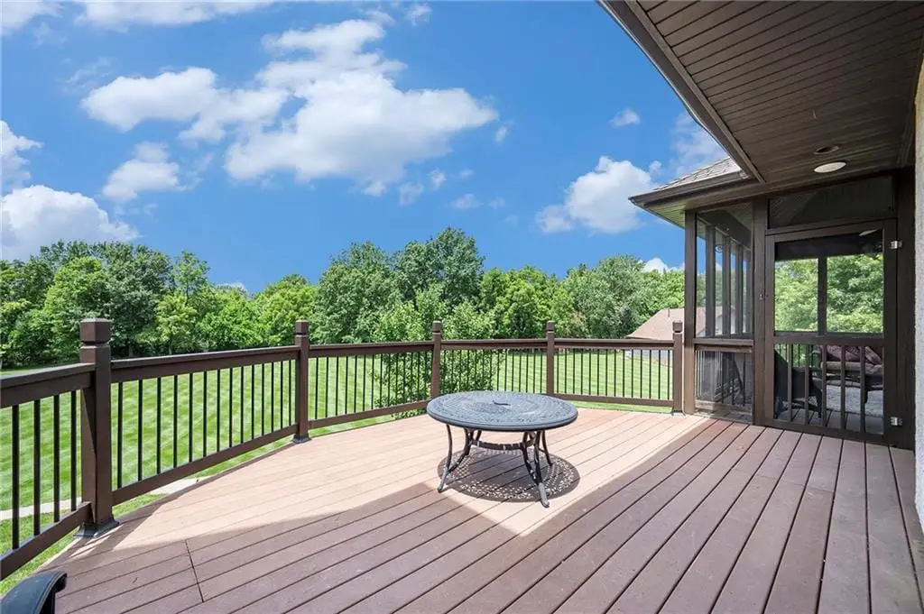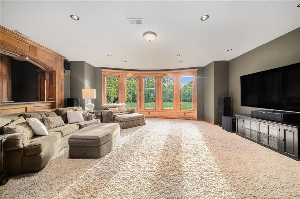 Tucked away on a quiet cul-de-sac in the desirable Strawberry Hill development, this impressive 1.5 story residence rests on a sprawling 1.76 acre lot. With quick access to The Litton Center, scenic walking trails, a play park & nearby Smithville Lake, the location offers both convenience & recreation. From the moment you arrive, the exterior showcases pride of ownership w/timeless curb appeal & meticulous care. Step inside to be greeted by a dramatic foyer featuring a curved staircase, soaring 2-story ceilings & rich, moody-traditional design details. Recently refinished hardwood floors, 2 geothermal HVAC systems (both in ground loop), computer-controlled Vantage Luxury Lighting, structured wiring & thoughtful upgrades throughout set this home apart. The great room makes a bold statement w/an arched wood entry, a striking stacked-stone fireplace flanked by custom built-ins & a wall of windows filling the space with natural light. The gourmet kitchen is designed for the chef at heart, offering knotty alder cabinetry, stone countertops, tile backsplash, built-in refrigerator, gas cooktop, oversized island & an exceptional walk-in pantry. Enjoy meals in the elegant formal dining room or the inviting 3-season room overlooking your private backyard. The main-level primary suite is a true retreat, boasting a coffered ceiling, spa-inspired ensuite w/dual custom vanities, large walk-in shower, jacuzzi tub & an expansive walk-in closet. Upstairs, discover 3 generously sized bedrooms, each with ample closet space & private or jack-and-jill bath access. The finished walkout lower level is designed as a full secondary living space - perfect for guests or multi-generational living. It includes a 2nd full kitchen, bedroom, bathroom, recreation/living areas, garage access & abundant storage. For entertaining, there’s even a theater/media room ready for movie nights or game day. Outside, the expansive backyard is ideal for gatherings, grilling, or tossing the football with friends.