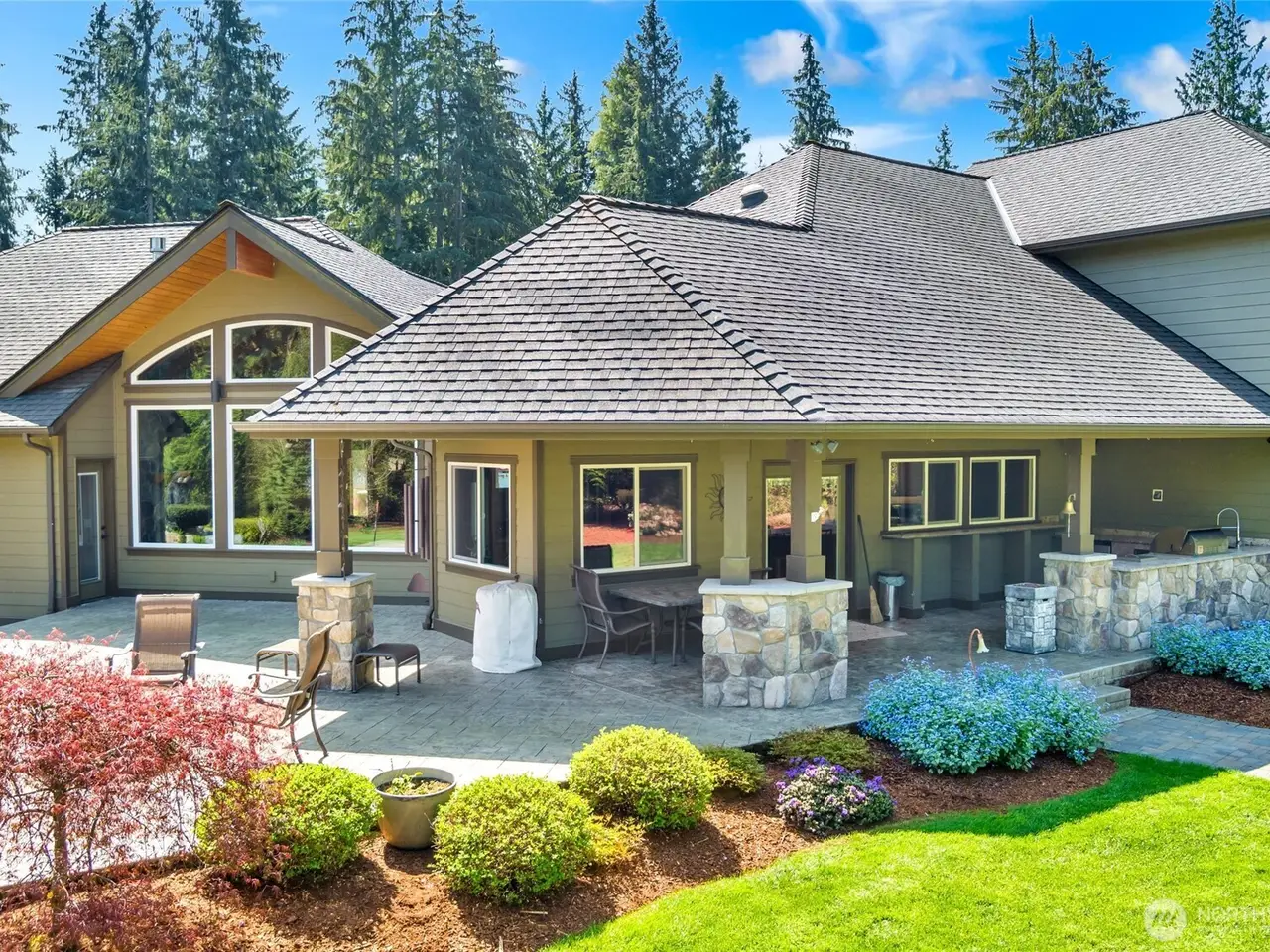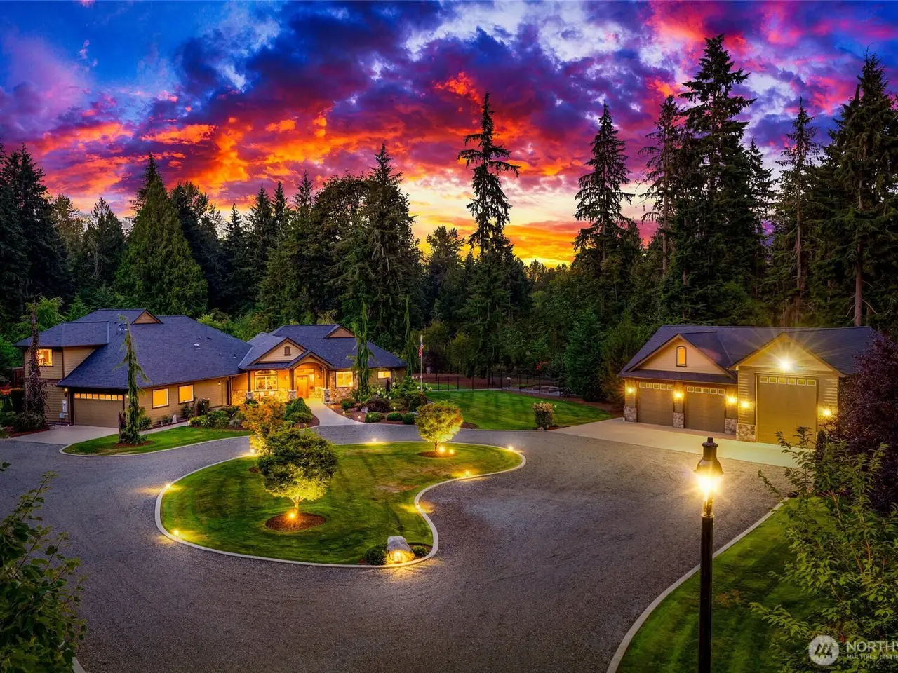 Experience elegant entertaining on 5 private acres near Woodinville wine country. The gated drive opens to a circular court with a tranquil water feature and entryway that sets the tone for sophistication. Inside, dramatic beam ceilings, a stone fireplace, and acacia floors create a warm, inviting ambiance. The gourmet kitchen with Sub-Zero and Wolf appliances inspires every culinary creation. Amazing upstairs surround sound theatre area. Step outdoors to a covered outdoor kitchen, water feature, and stamped patio all designed for gatherings. A Generac backup generator system, huge detached shop, and 42' motorhome garage complete this exceptional property.