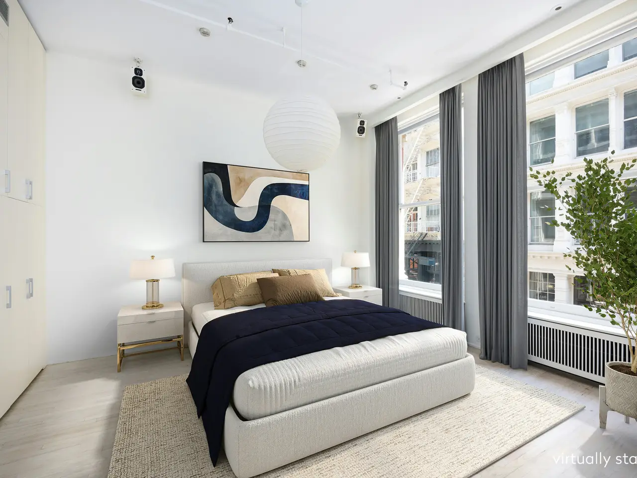Located on the coveted cobblestone block of Greene Street in the heart of SoHo, this super cool and expansive over 3,700 square-foot loft condominium offers a rare combination of striking design, natural light, and flexible living. With soaring 13-foot ceilings and oversized windows facing both East and West, this full-floor home provides fabulous space for both grand entertaining and everyday comfort. The open-concept living area is anchored by an oversized chef's kitchen featuring a six-burner Viking range with griddle, two Miele ovens, a built-in coffee maker, and two sinks. Whether preparing a casual meal or hosting a dinner party for 40 people, the kitchen offers both style and practicality, with generous storage and an adjacent wet bar that includes two wine refrigerators, an ice maker, and additional cabinet space. Beyond the kitchen, the grand and flexible living space has tranquil treetop views from huge and architecturally significant windows. Off of the foyer is a thoughtfully designed library area that provides an ideal space for either work or relaxation. There is even a bonus room currently outfitted as a gym, offering endless possibilities for personal use. The oversized primary bedroom features floor-to-ceiling windows and a massive walk-in closet. The en-suite primary bath feels like a spa retreat, with dual vanities, a wet room with a soaking tub and dual shower heads, and a Japanese electric toilet. The bright and airy second bedroom faces onto Greene Street and has custom built-in storage and an en-suite bathroom. A dedicated laundry room with a sink adds convenience, while the apartment is outfitted with a Nest system for central AC and overhead lighting throughout. With keyed entry directly into the apartment, this loft combines the best of privacy and convenience, nestled in a boutique building with low monthly common charges. Enjoy the best of Soho, with world-class dining, boutique shopping, and vibrant culture just steps from your door. The apartment is also within easy reach of major subway and bus lines.