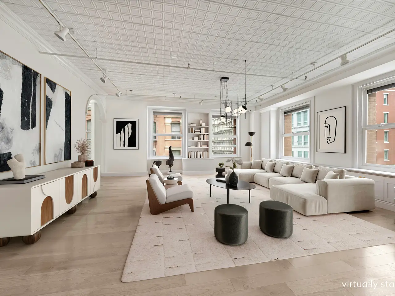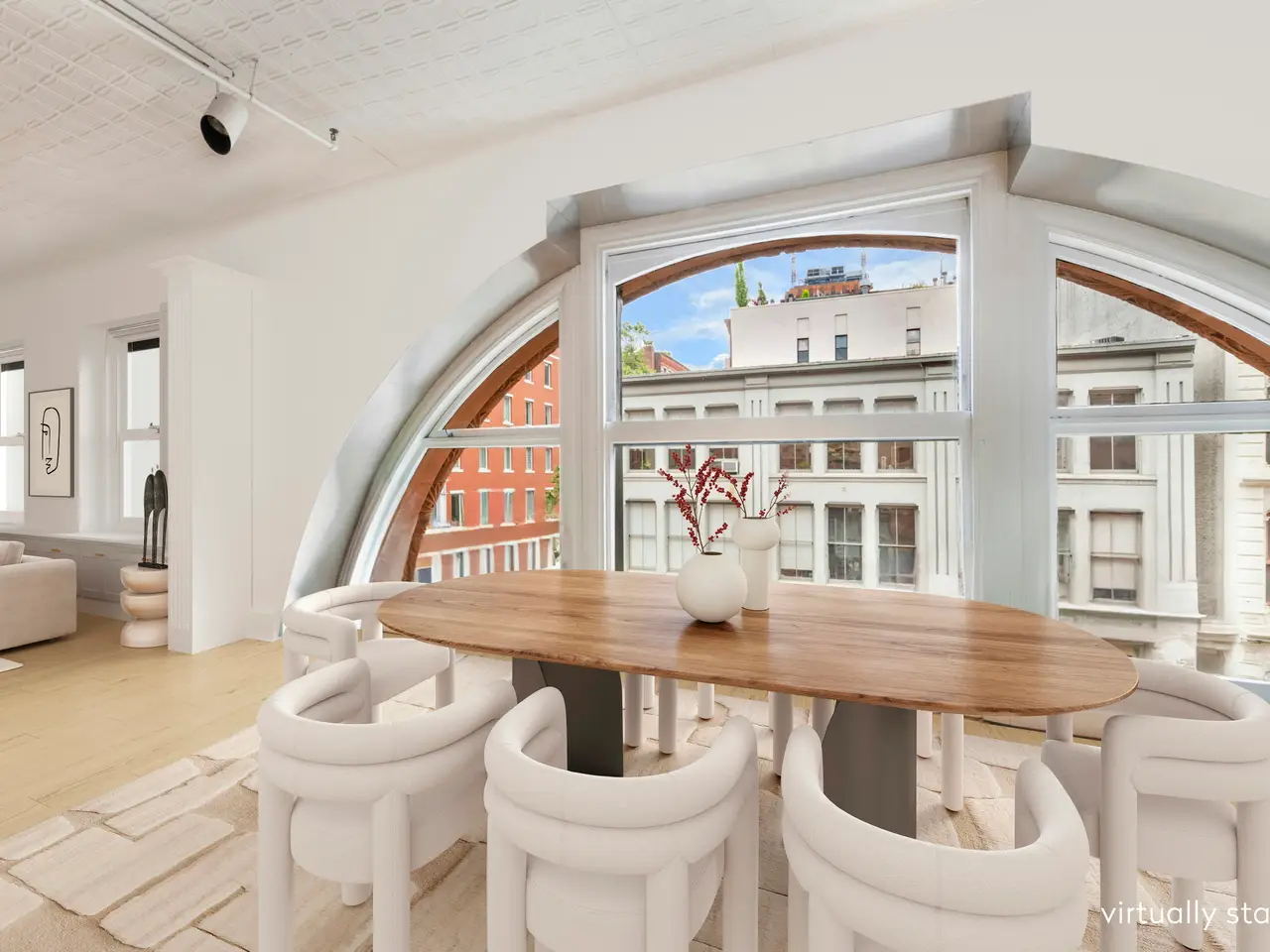 Rare opportunity to turn a historic SoHo home into your dream loft residence. This corner loft at 59 Wooster Street spans approximately 3,050 square feet and boasts southern and eastern exposures from twelve oversized and arched windows, 11-foot ceilings, stately columns, and original hardwood floors. There is also currently the opportunity to purchase the adjoining loft apt 3W and combine the two apts to create a 6,700 square foot extraordinary space which could have four+ bedrooms. This genuine loft is the perfect canvas for creating an unrivaled home or a versatile live/work space. The keyed elevator opens to a windowed foyer, introducing the home's stately architectural features and grand entertaining space. The living room and studio space occupy over 2,300 square feet and flow seamlessly together surrounded by oversized cast iron windows. Three columns divide the space, adding to its multi-use functionality. The home also features custom closets and built-ins throughout, providing ample storage. The principal bedroom nestled in the northwest corner of the loft offers privacy with custom frosted glass windows that provide tranquil light throughout the day. The suite also includes ample closet space with three double-deep built-ins, a separate walk-in closet, and a large en suite bathroom. The second bedroom is also generously proportioned and has its own en suite bathroom. Built in 1891 by Alfred Zucker, this Romanesque Revival building is located on the corner of Wooster and Broome Streets with close proximity to some of SoHo's most opulent offerings including luxury shopping at Chanel, Celine, and Gucci, and renowned restaurants like Cipriani and Balthazar. Premiere hotels such as The Crosby Street Hotel are also nearby, along with some of the city's most acclaimed art and entertainment venues.