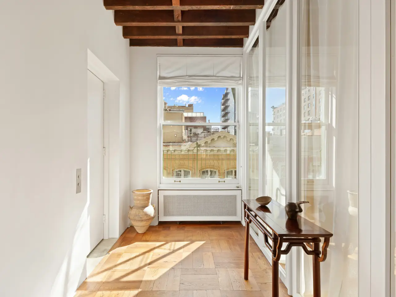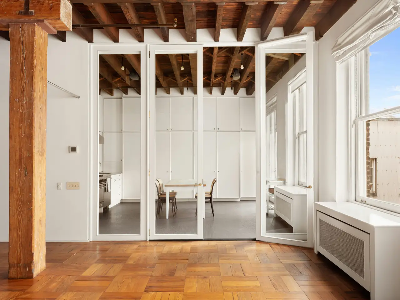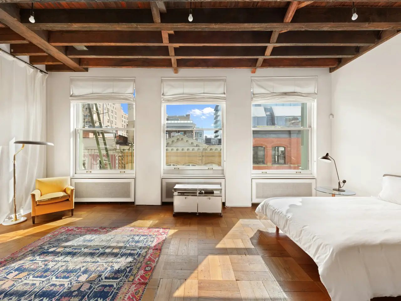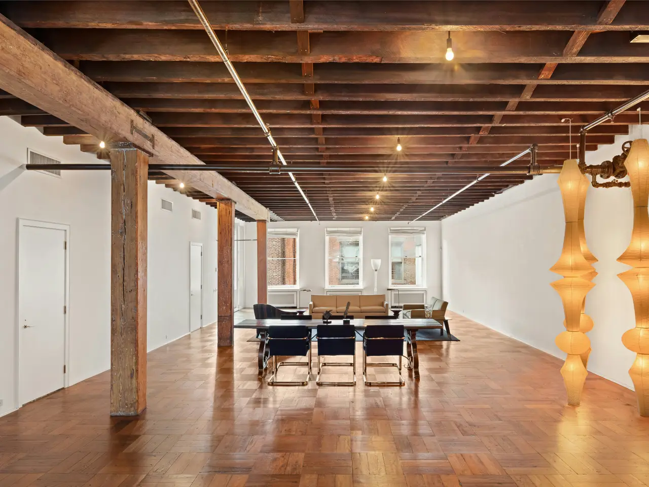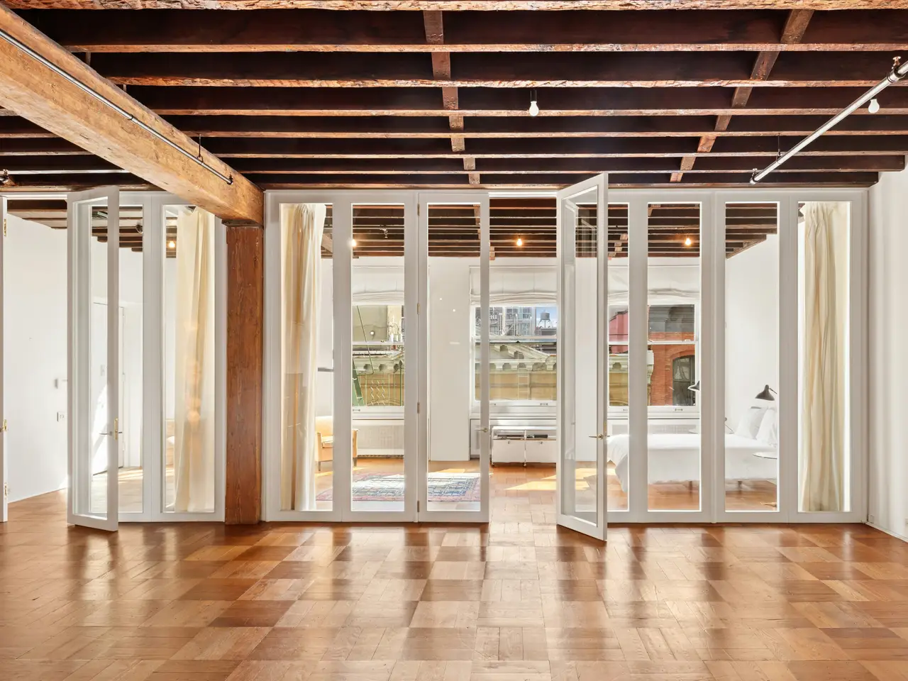 Quintessential Soho Charm This serene and sophisticated 3,200SF full-floor loft is located right in the heart of Soho's historic Cast-iron district and features grand proportions, a wide flexible layout and charming original details throughout. Designed by Annabelle Seldorf with a warm minimalist aesthetic, this graceful residence will appeal to those who appreciate understated luxury and pin-drop quiet privacy. Step off the key-locked elevator to a sun-drenched landing where floor-to-ceiling French doors open to an expansive entertaining space with exposed beamed-ceilings, original wood columns and exquisite walnut floors hand-laid in a parquet pattern. Abundant wall space provides the perfect backdrop for an extensive art collection while light floods the room through oversized windows. On one end of the loft, a wall of french doors open to a king-sized bedroom with brilliant morning light. At the opposite end, you'll find a large separate windowed eat-in-kitchen bathed in natural light with top-of-the-line appliances and abundant storage and pantry space. There are two tastefully renovated bathrooms, each finished in a European style with dual sinks and heated towel rails. Every inch of this home reflects a restrained elegance that both compliments and respects the original architecture. Additional amenities include central air-conditioning, a Miele washer-dryer and custom lighting on dimmers throughout. Built in 1883 and designed by Richard Berger, the iconic 6-story cast-iron building is located on Soho's most coveted cobblestone block, surrounded by historically significant architecture with great restaurants, cafes, alluring retail storefronts and the best that New York has to offer right at your doorstep. An exceptional home in the very best location!