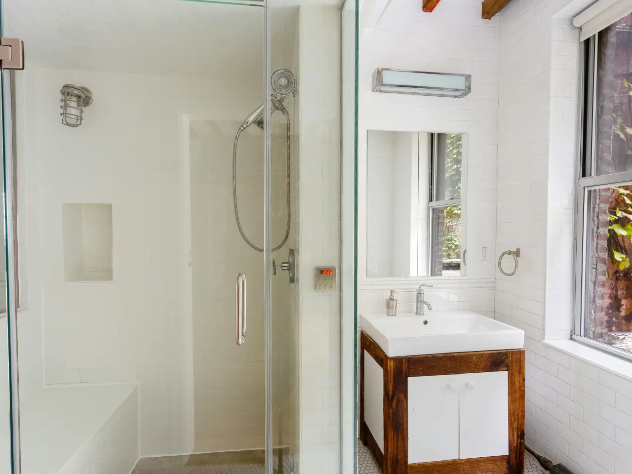 This renovated, full floor loft is perfectly situated on a highly coveted Nolita block. The living room features 11 foot beamed ceilings, exposed brick walls and giant, south facing windows. An open kitchen is decked out with stainless steel cabinetry, wrap around counter with room for seating, and state-of-the-art appliances like a Liebherr fridge, Verona stove, and Miele dishwasher. The quiet, North facing bedroom feels like a secluded sanctuary with direct access to the approximately 500 square foot private deck with lovely climbing ivy. There is plenty of storage with an enormous walk-in closet and other built-ins throughout. The Jack and Jill style bathroom is accessible from the bedroom and living room and is replete with spa quality amenities like a large steam shower and heated floors. The entire loft has automated shades there is also an in-unit washer/dryer. Situated in the heart of Nolita and extremely convenient to the 6,N,R trains and the surrounding neighborhoods of Soho, Noho and more!
