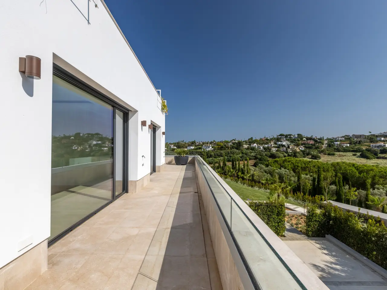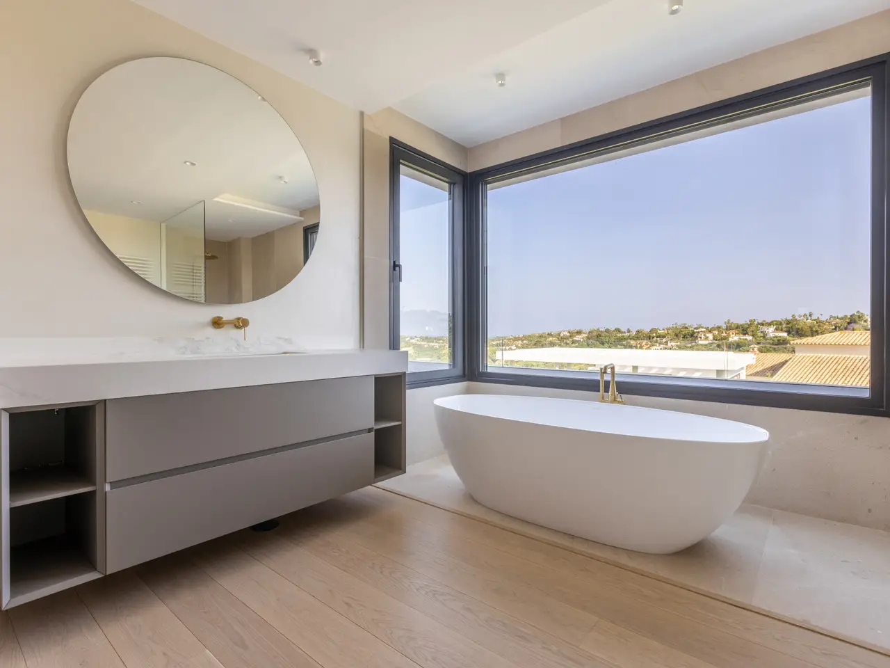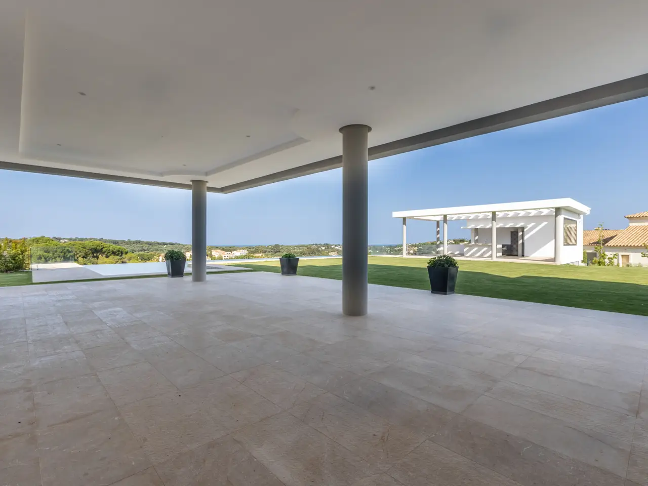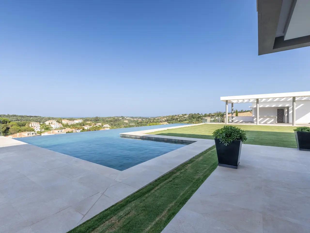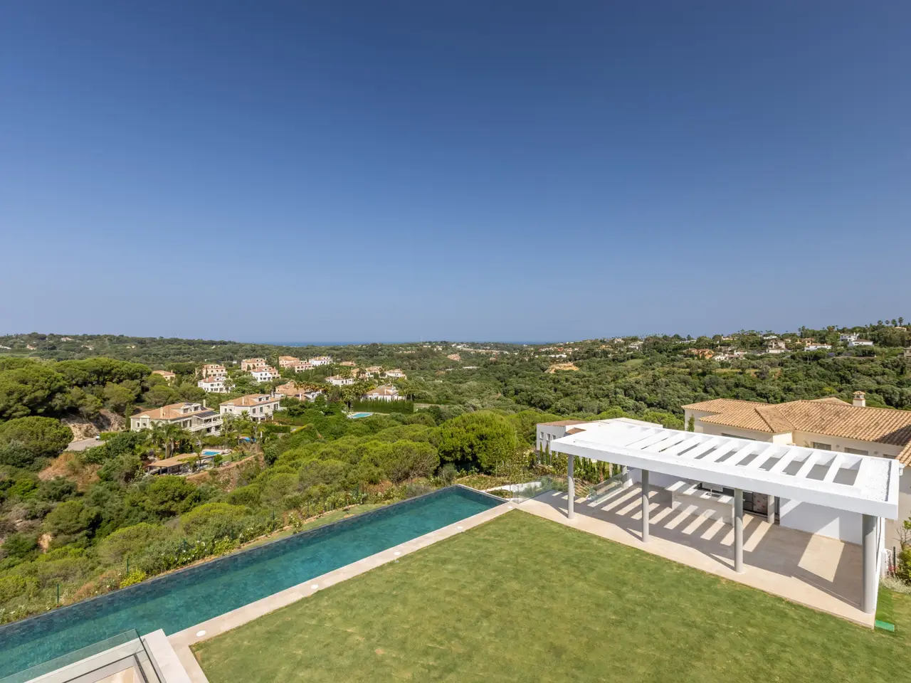 This incredible, recently built villa, located in a highly sought-after area, stands out for its spacious interiors, modern design, and spectacular panoramic views of the golf course, sea, and mountains. The villa sits on a generous 3,765 m² plot, offering a built area of 1,326 m² and an interior space of 920 m², complemented by a total of 308 m² of terraces and porches. The property features six bedrooms, seven full bathrooms, and an additional guest toilet, ensuring maximum comfort and privacy. Each room has been designed to provide brightness and spaciousness, and the property includes features such as underfloor heating throughout, air conditioning, central heating, smart home automation systems, and aerothermal technology. The layout also comprises a guest apartment, office, dressing room, main living room with fireplace, and several terraces (both covered and uncovered), including a solarium with breathtaking views. The exterior captivates with a meticulously maintained private garden, automatic irrigation system, and an impressive infinity pool that blends seamlessly with the landscape. The outdoor kitchen, fully equipped under a pergola, is ideal for enjoying barbecues and outdoor gatherings. The villa, located in a gated community with 24-hour security service, also boasts a private garage, storage room, elevator, accessible entrance for people with reduced mobility, and high-end finishes such as wooden floors and electric blinds. Thanks to its proximity to golf courses, the sea, marina, shops, schools, and all the amenities of Sotogrande, this villa represents a unique opportunity for those seeking exclusivity, privacy, and unparalleled views in one of the best residential areas of the Costa del Sol. Do not miss this opportunity and contact us for more information.