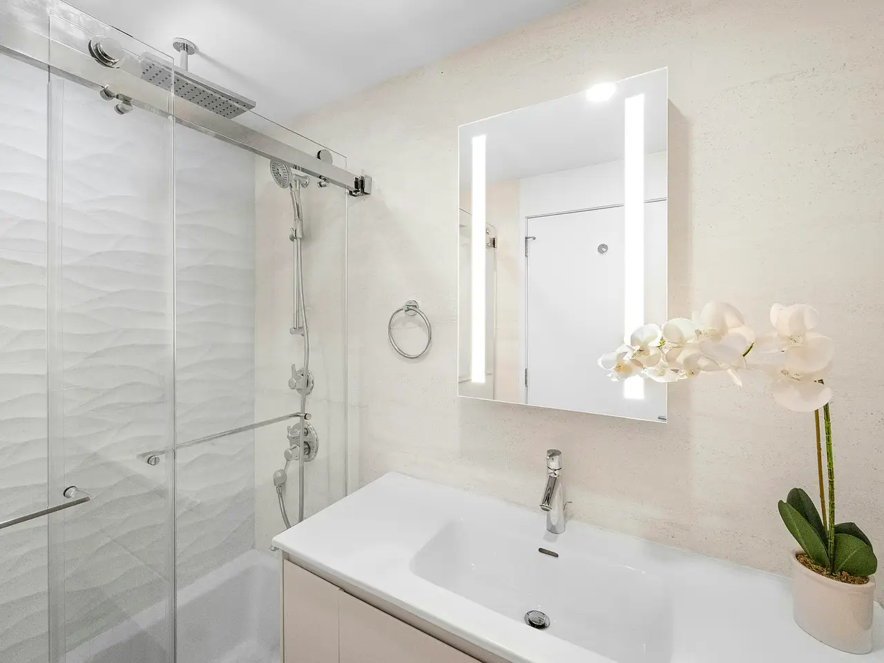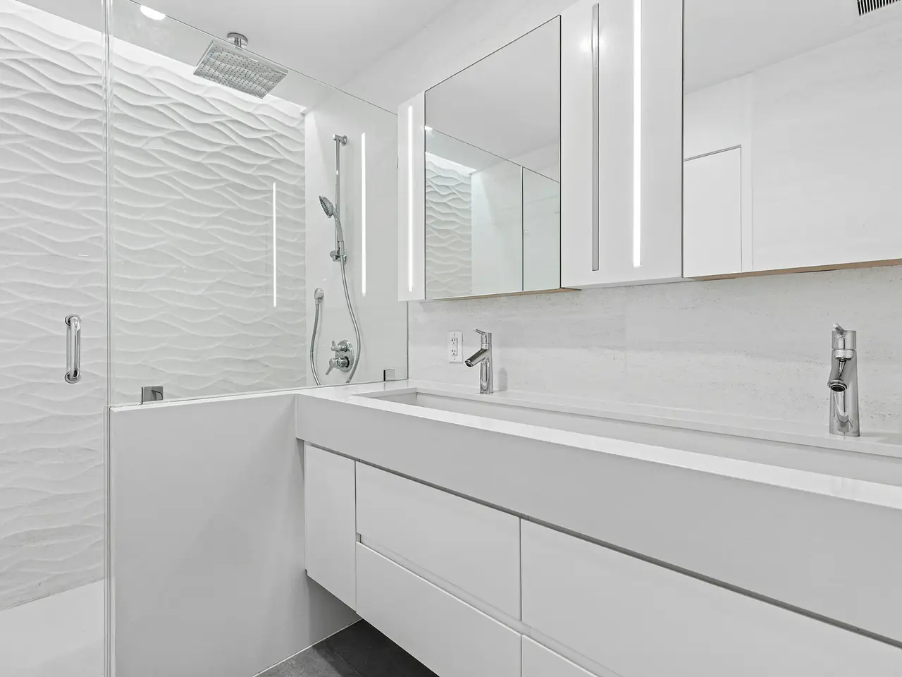 Spa-like primary bathroom Sleek Caesarstone countertops