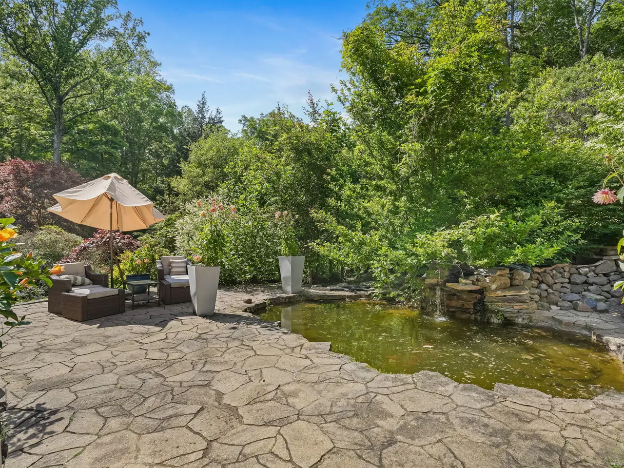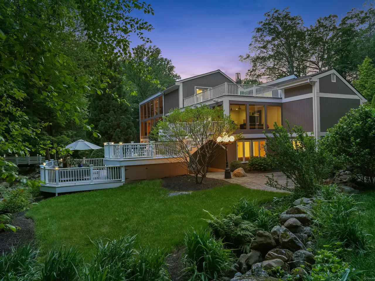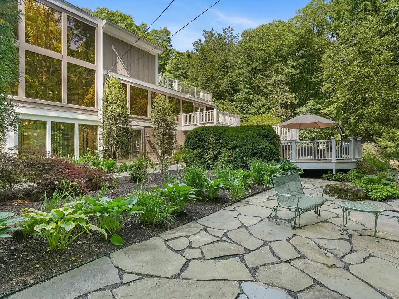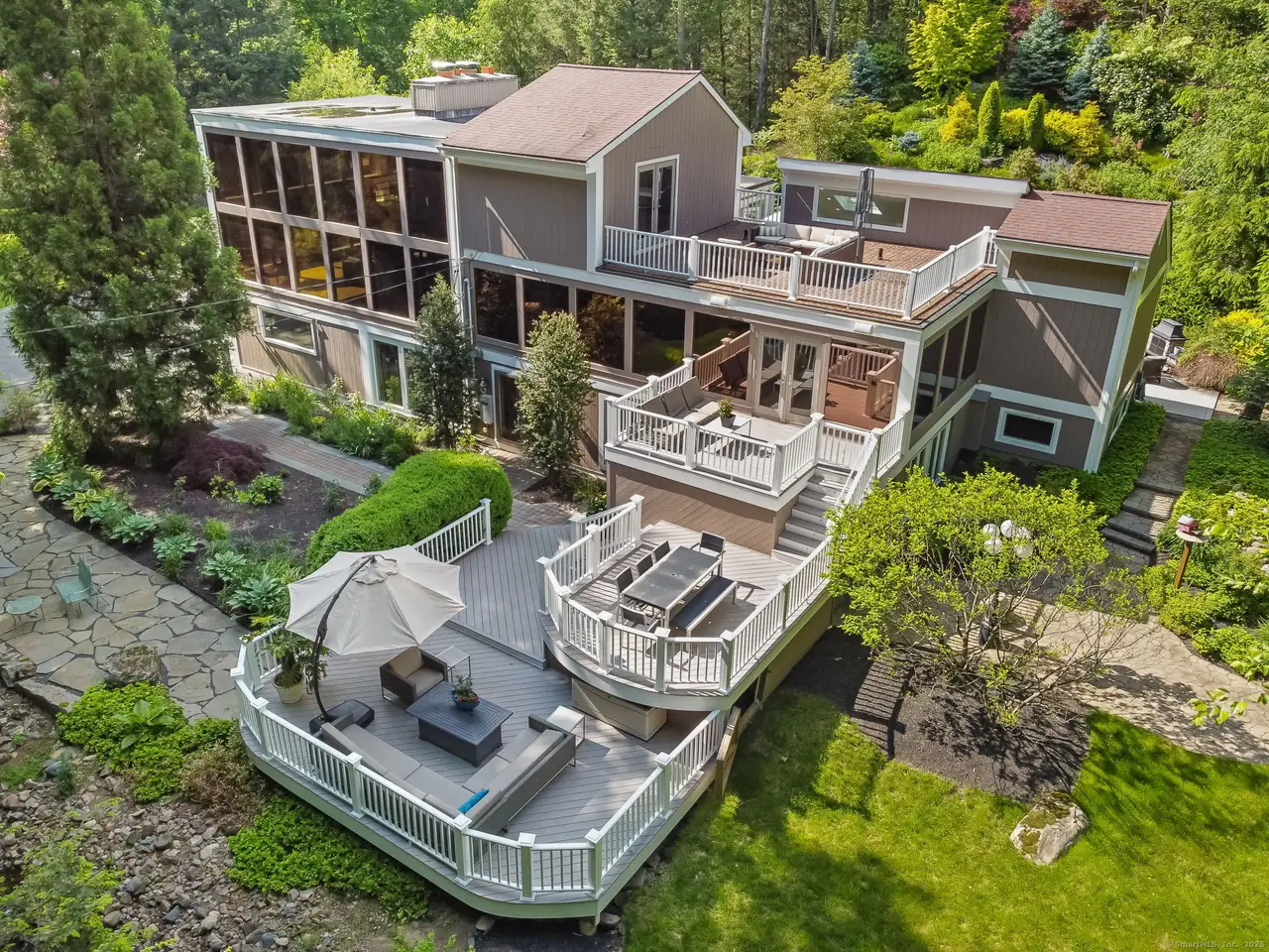 Welcome to the glass house of Southbury! Truly a home of style and distinction with its three levels of 5000+ sqft. Enjoy your own private oasis on over 3 secluded wooded acres landscaped for color from early Spring until the beautiful New England Fall. This one of a kind contemporary style home with glass walls in every major room brings the outside world in 24/7. Enter the lower level through the Garden Room hallway which leads to a Family Rm with fireplace & entrance to Patio with view of the KOI pond. The main level boasts of a Living Room with fireplace and floor to ceiling glass walls on three sides offering stunning views of the outdoors. Adjacent, is a recently remodeled Eat-in Kitchen with Thermador appliances, reflective big blue granite countertops and a deck right off the dining area. Also featured, is a lovely Primary Bedroom suite with motorized blinds, large custom Walk-in closet, and a newly renovated Bath featuring heated floors, large granite enclosed heated tub, bidet, & steam shower. The upper level offers an office with fireplace & Large room leading to the upper deck and a full bathroom. With its many rooms, this home offers the potential for five bedrooms for your family and guests with four full Baths. Perfect for entertaining whether inside or out. A very unique property! So much to see, so much detail. It must be viewed! Features: Thermador appliances: double oven, wine rack, microwave, warming drawer, & frameless induction cook top. Kitchen-ample counter space. 48 (4ft x 6ft) Custom double paned glass windows. 4 Double French Doors. Decks- 2 off Kitchen, 3 off Primary Bedrm & 1 off third level. 4 Fireplaces. Lighted Bridge. 5 Skylights throughout. Ceiling Fans. 22 KW Generax whole house generator. 500 gal Propane tank. Electric pet fence around the property. Wired speakers and sound system in LR, Kitchen & both front and back Decks. KOI Pond. ATD Security System. Programmable Thermostat.