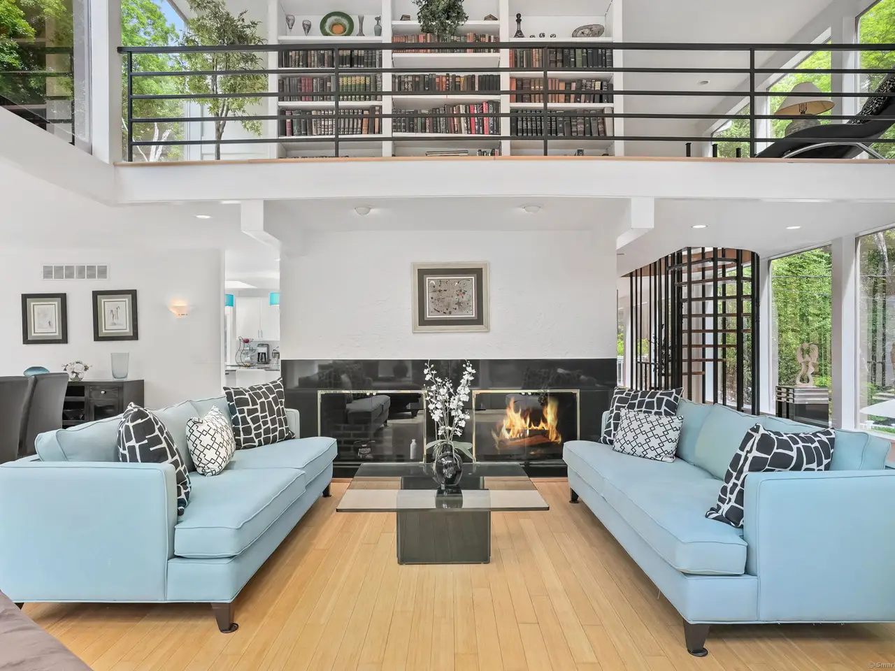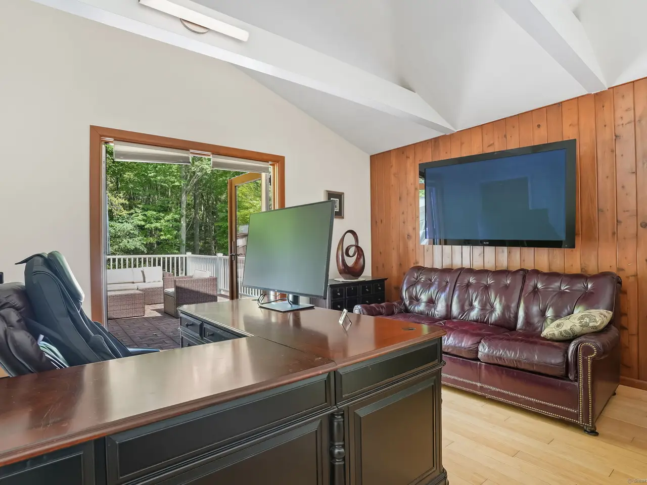 Office with fireplace and upper deck access