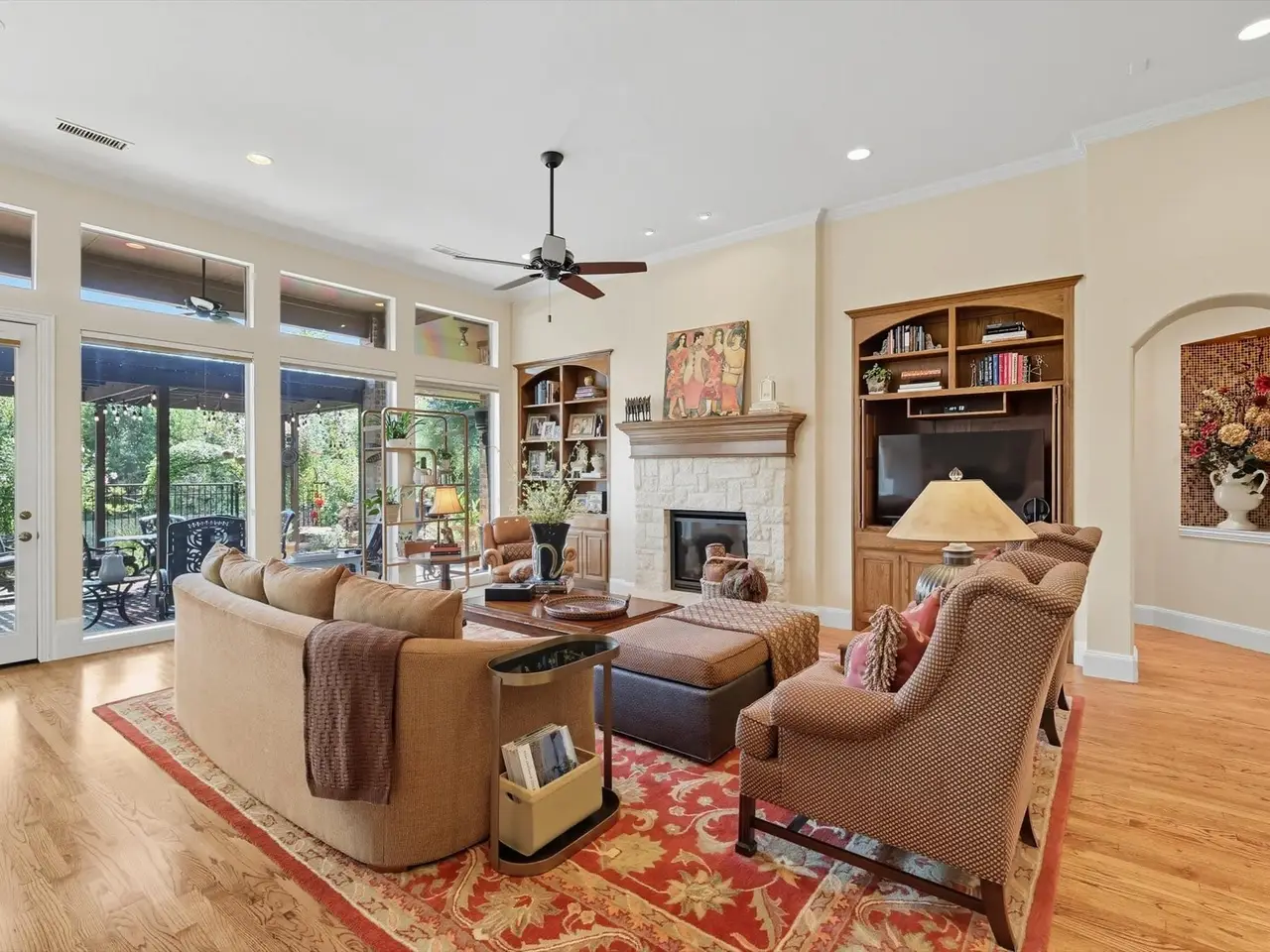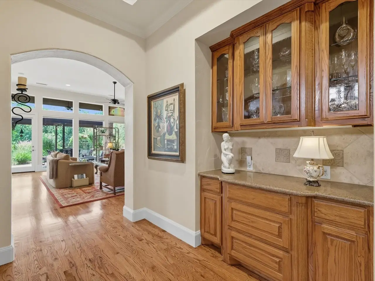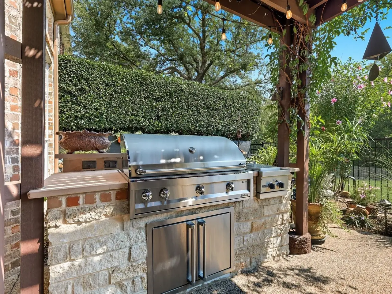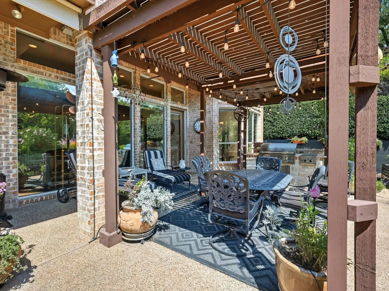 Immaculately maintained one-story home with fabulous curb appeal in the highly desirable Crescent Royale addition in Timarron. Hardwood floors throughout living areas, extra tall ceilings, and large living areas. Three bedrooms, three baths, two living areas and two dining areas. One bedroom currently being used as office. Lots of storage throughout. Spacious primary suite with huge bathroom, separate vanities, and large dual closets. Enjoy relaxing evenings in the stunning outdoor space with living area that includes summer kitchen with grill and burners, pergola, and soothing sounds of the rock waterfall and pond. Backyard features lush landscaping and easy maintenance and backs to green space for privacy. HOA maintains front yard. Roof replaced 8-25; water heaters replaced 2024, new fireplace 8-25.