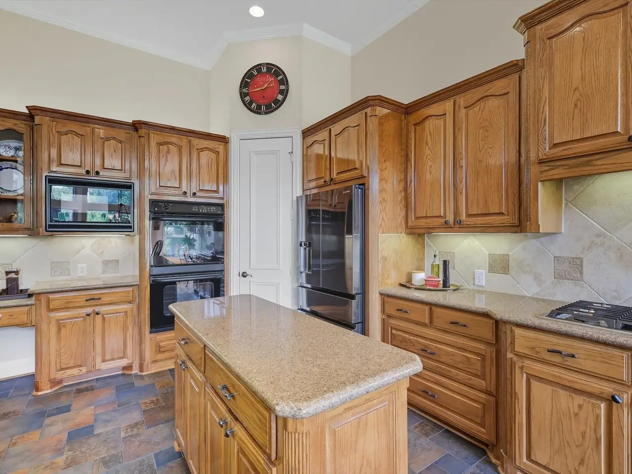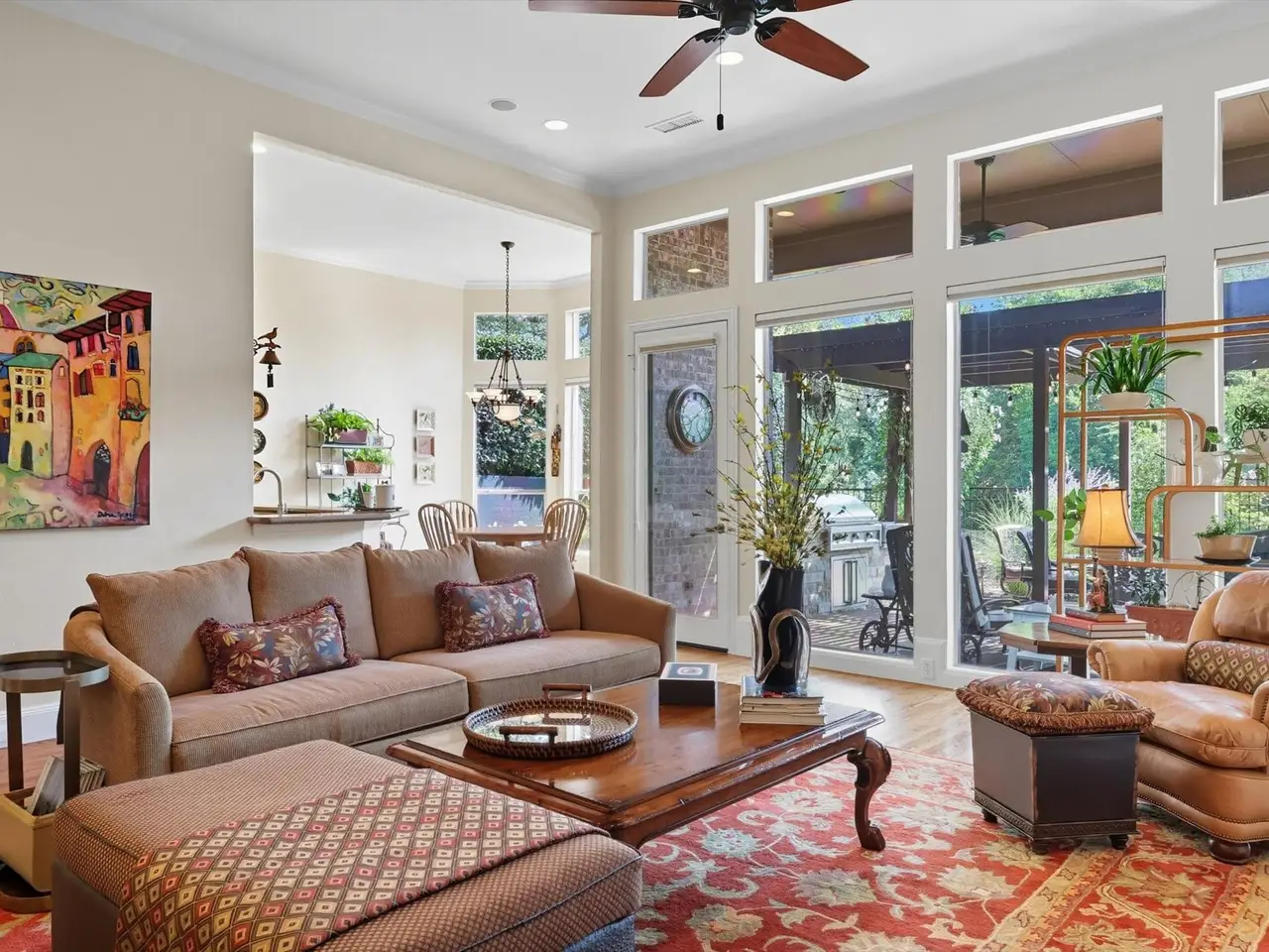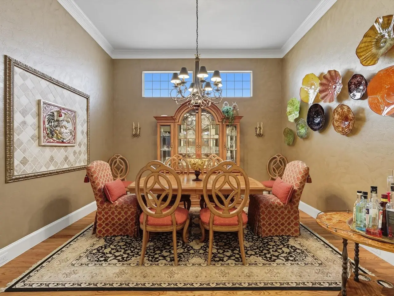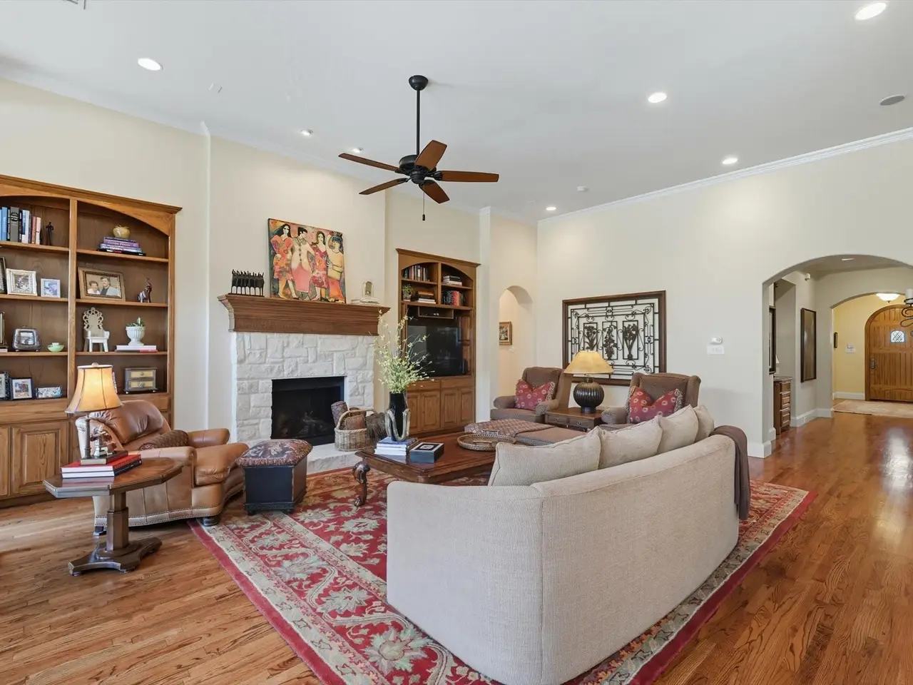 Immaculately maintained one-story home with fabulous curb appeal in the highly desirable Crescent Royale addition in Timarron. Hardwood floors throughout living areas, extra tall ceilings, and large living areas. Three bedrooms, three baths, two living areas and two dining areas. One bedroom currently being used as office. Lots of storage throughout. Spacious primary suite with huge bathroom, separate vanities, and large dual closets. Enjoy relaxing evenings in the stunning outdoor space with living area that includes summer kitchen with grill and burners, pergola, and soothing sounds of the rock waterfall and pond. Backyard features lush landscaping and easy maintenance and backs to green space for privacy. HOA maintains front yard. Roof replaced 8-25; water heaters replaced 2024, new fireplace 8-25.