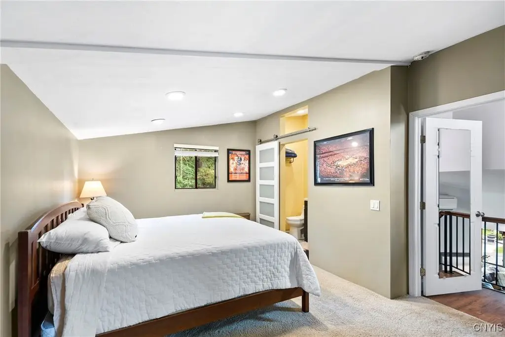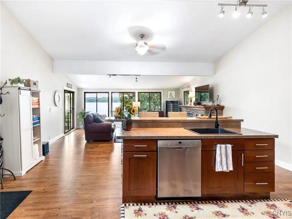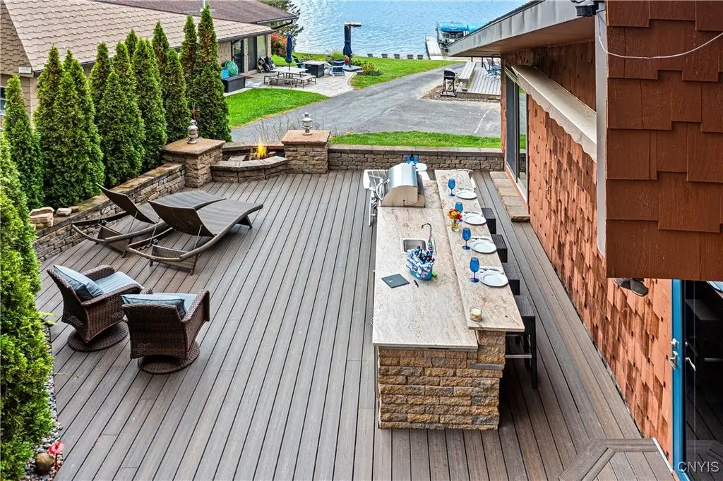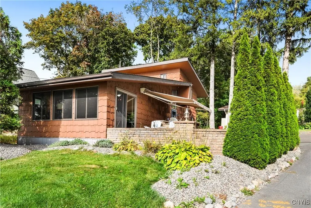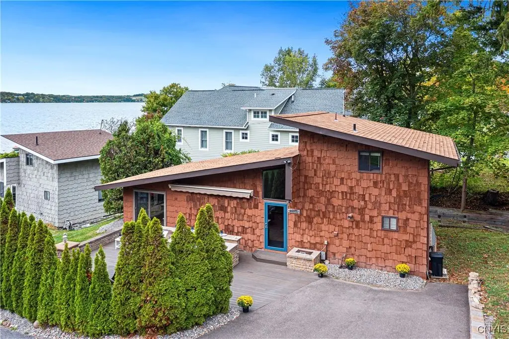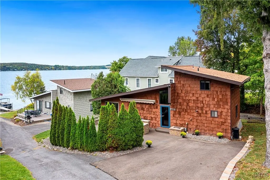Welcome to Leopold Lodge, LLC - Cottage "C" on Skaneateles Lake. Located just 4 miles from the picturesque village of Skaneateles, this beautifully updated retreat offers breathtaking lake views and spectacular sunsets. Cottage "C" offers parking at your door step and features 2 bedrooms and 2 full baths. The space has been thoughtfully designed for both comfort and style. The kitchen is a true highlight with Kraftmaid cherry cabinetry, granite countertops, a center island with seating, and stainless-steel appliances - all flowing seamlessly into the bright living area with panoramic lake views. On the main floor, you'll find a bedroom currently set up with two twin beds and a full bath with walk-in shower conveniently across the hall. A stacked washer/dryer and on-demand hot water add everyday ease. Upstairs, a spiral staircase leads to the spacious primary suite with private ensuite. Outdoor living takes center stage here with sweeping lake views from the private composite deck. The fully equipped outdoor kitchen, complete with granite countertops, propane grill, refrigerator, bar sink, abundant prep and dining space, and a power awning for shade, provide ample space for entertaining. Gather around the cozy fire pit or simply relax and take in the view. With a mini-split system and natural gas fireplace, you'll stay comfortable whatever the weather, while level access to the pebble beach and waterfront mere steps from your door make lake living effortless. Leopold Lodge encompasses 1.3 acres with 99 feet of pristine Skaneateles Lake frontage, shared by five cottages in this truly special community. Ownership includes 20 shares (one-fifth interest) along with exclusive use of Cottage "C." Owners enjoy benefits such as boat hoist rights, use of common areas, shared maintenance expenses, and low, low property taxes! Just pack your bags - Cottage "C" is move-in ready and waiting for you to enjoy the very best of Skaneateles Lake living.