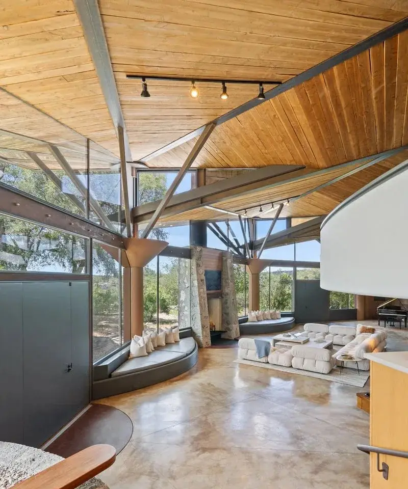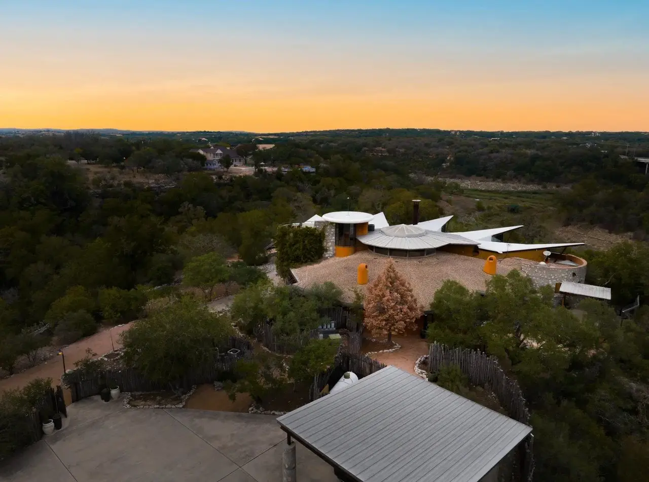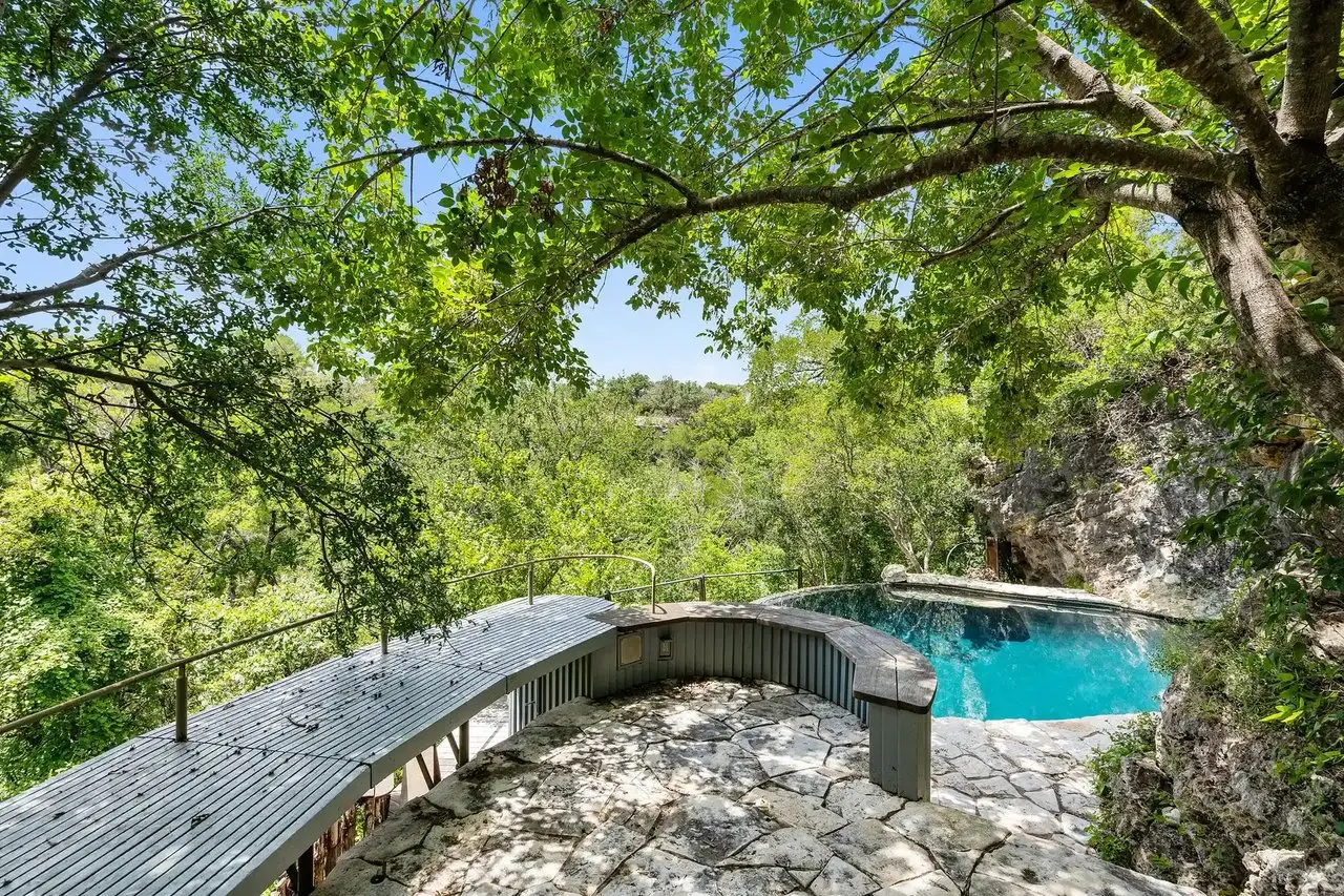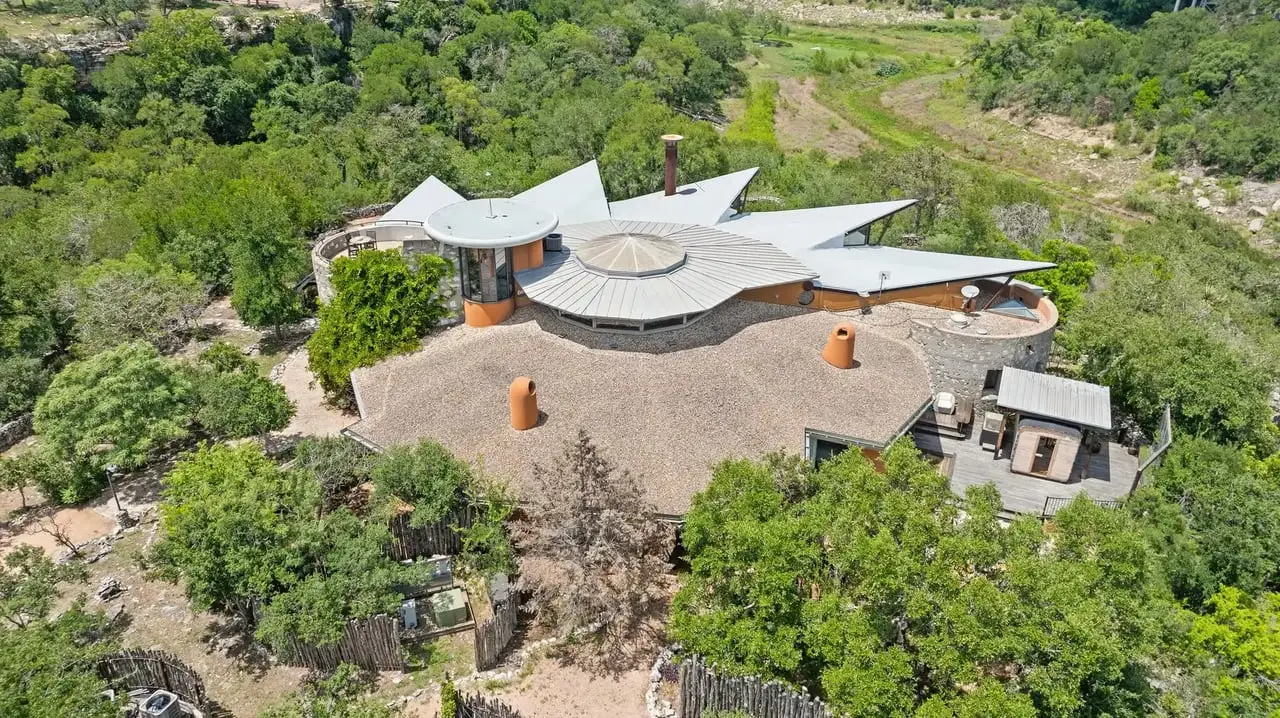 Architecturally Significant Compound in Spicewood | Once-in-a-Lifetime Retreat in Spicewood Once in a lifetime chance to own this culturally and architecturally significant home in the Hill Country, designed by John Covert Watson, an intern of Frank Lloyd Wright’s. Set on 30 stunning acres in Spicewood, The Retreat at Lick Creek Lodge is a one-of-a-kind compound offering the architecture lover the opportunity to be surrounded both by exquisite design and natural beauty. Defined by its hyperbolic parabola roof which resembles a splayed deck of cards, this home is striking inside and out. The roof creates a semi-circular motif that is repeated throughout the house, from the entry rotunda to the arching wall of glass that spans the living room and looks out to the tangle of nature enveloping the home. Interiors Celebrating Local Materials | Memorable Entertaining and Private Hideaways The interior is a celebration of the Texas Hill Country, making use of locally harvested cedar and nearby-quarried desert masonry contrasted with concrete, steel and glass. Cork floors plus rich oak and maple cabinetry add warmth and richness. An extraordinary entertaining space, the living room arches around a limestone fireplace and looks out over the rolling hills; it has hosted galas and concerts when not serving as a private retreat. The floorplan offers many unique hideaways, from a secret-door-accessed office to a serene meditation room. Roam 30 Acres with a Grotto Pool | Miles of Views with Resort Amenities The 30-acre property is set on a cliff over the Pedernales river and overlooks steep ravines and miles of green hills. Step down the hillside to the grotto pool, half-hidden in a rocky crevasse, where you can swim as if you were on a desert island. The ultra-private compound includes a large guest house and office at the front of the property; you will wend your way along gravel paths and native landscaping to reach the main house. Just 40 minutes from Austin, this property offers multiple uses, from a close-in family retreat to executive escape or small resort rental. Regardless, this property will continue to fascinate, inspire and restore its owners for years to come.