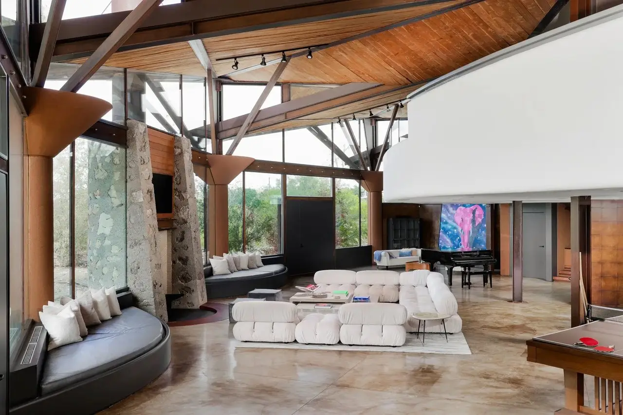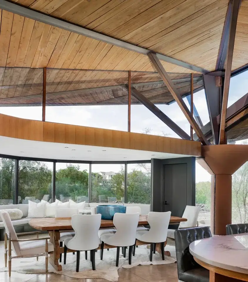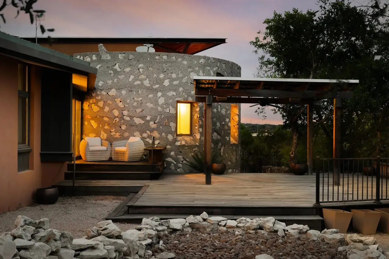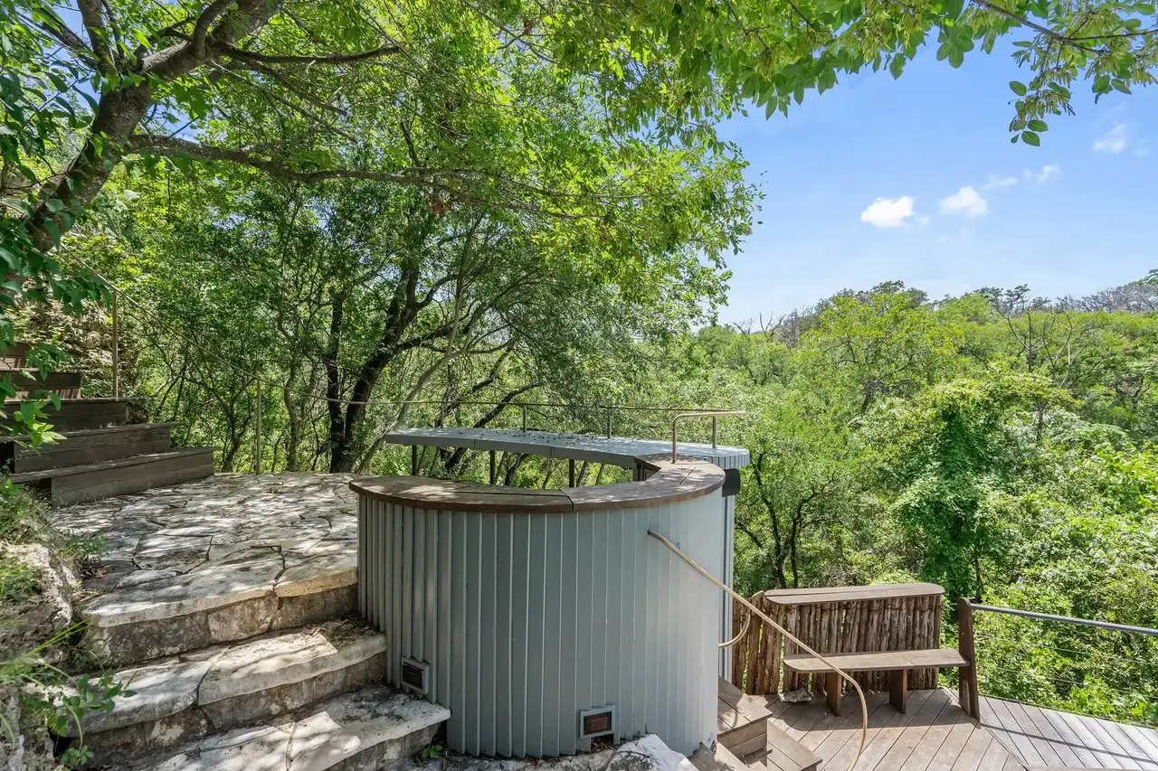 Architecturally Significant Compound in Spicewood | Once-in-a-Lifetime Retreat in Spicewood Once in a lifetime chance to own this culturally and architecturally significant home in the Hill Country, designed by John Covert Watson, an intern of Frank Lloyd Wright’s. Set on 30 stunning acres in Spicewood, The Retreat at Lick Creek Lodge is a one-of-a-kind compound offering the architecture lover the opportunity to be surrounded both by exquisite design and natural beauty. Defined by its hyperbolic parabola roof which resembles a splayed deck of cards, this home is striking inside and out. The roof creates a semi-circular motif that is repeated throughout the house, from the entry rotunda to the arching wall of glass that spans the living room and looks out to the tangle of nature enveloping the home. Interiors Celebrating Local Materials | Memorable Entertaining and Private Hideaways The interior is a celebration of the Texas Hill Country, making use of locally harvested cedar and nearby-quarried desert masonry contrasted with concrete, steel and glass. Cork floors plus rich oak and maple cabinetry add warmth and richness. An extraordinary entertaining space, the living room arches around a limestone fireplace and looks out over the rolling hills; it has hosted galas and concerts when not serving as a private retreat. The floorplan offers many unique hideaways, from a secret-door-accessed office to a serene meditation room. Roam 30 Acres with a Grotto Pool | Miles of Views with Resort Amenities The 30-acre property is set on a cliff over the Pedernales river and overlooks steep ravines and miles of green hills. Step down the hillside to the grotto pool, half-hidden in a rocky crevasse, where you can swim as if you were on a desert island. The ultra-private compound includes a large guest house and office at the front of the property; you will wend your way along gravel paths and native landscaping to reach the main house. Just 40 minutes from Austin, this property offers multiple uses, from a close-in family retreat to executive escape or small resort rental. Regardless, this property will continue to fascinate, inspire and restore its owners for years to come.