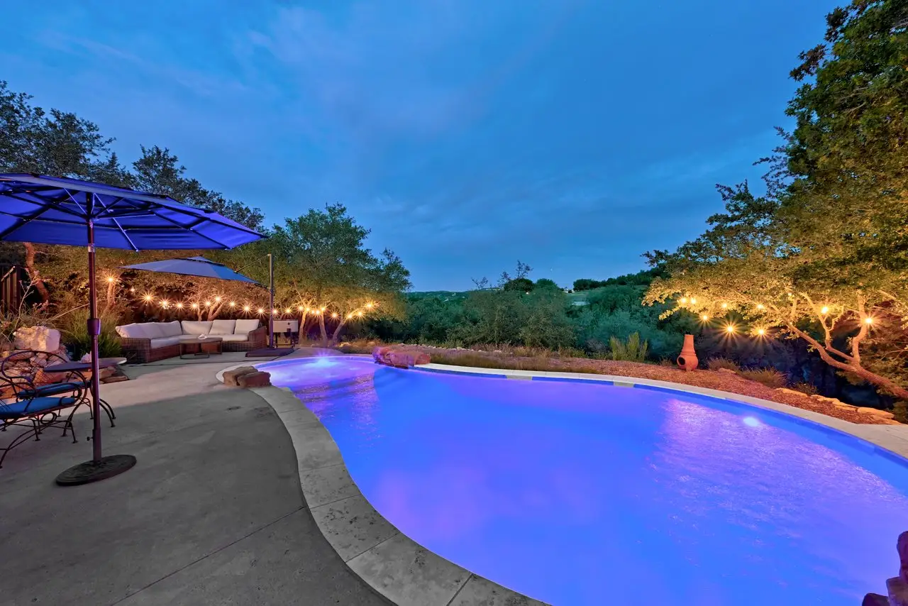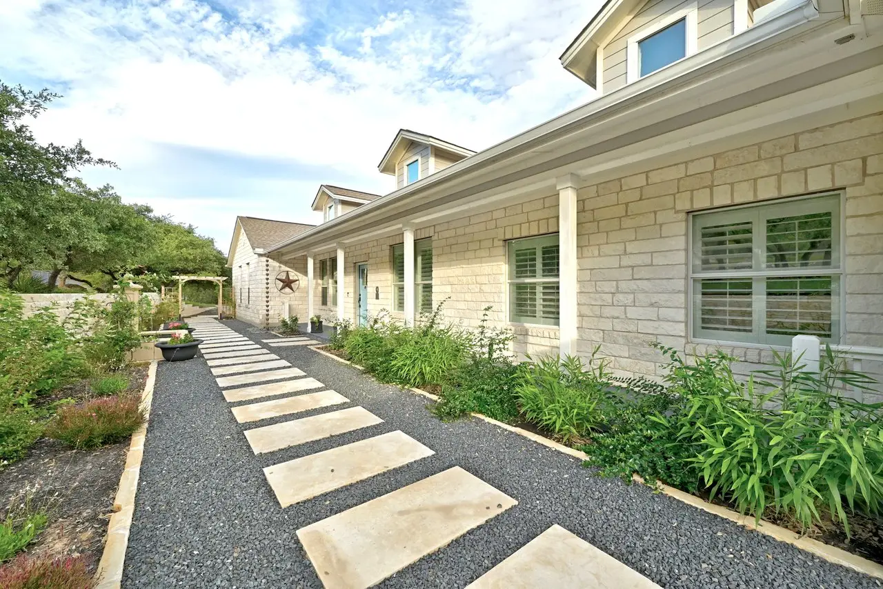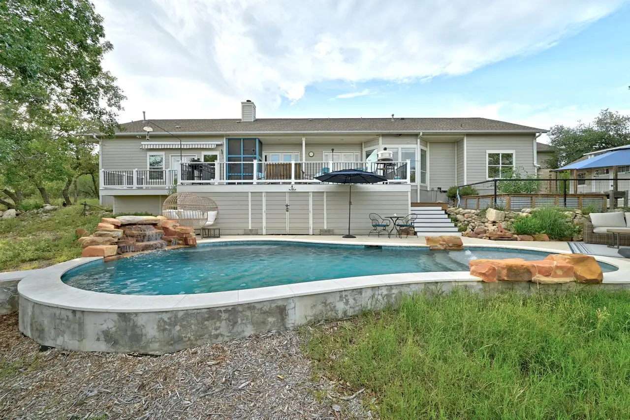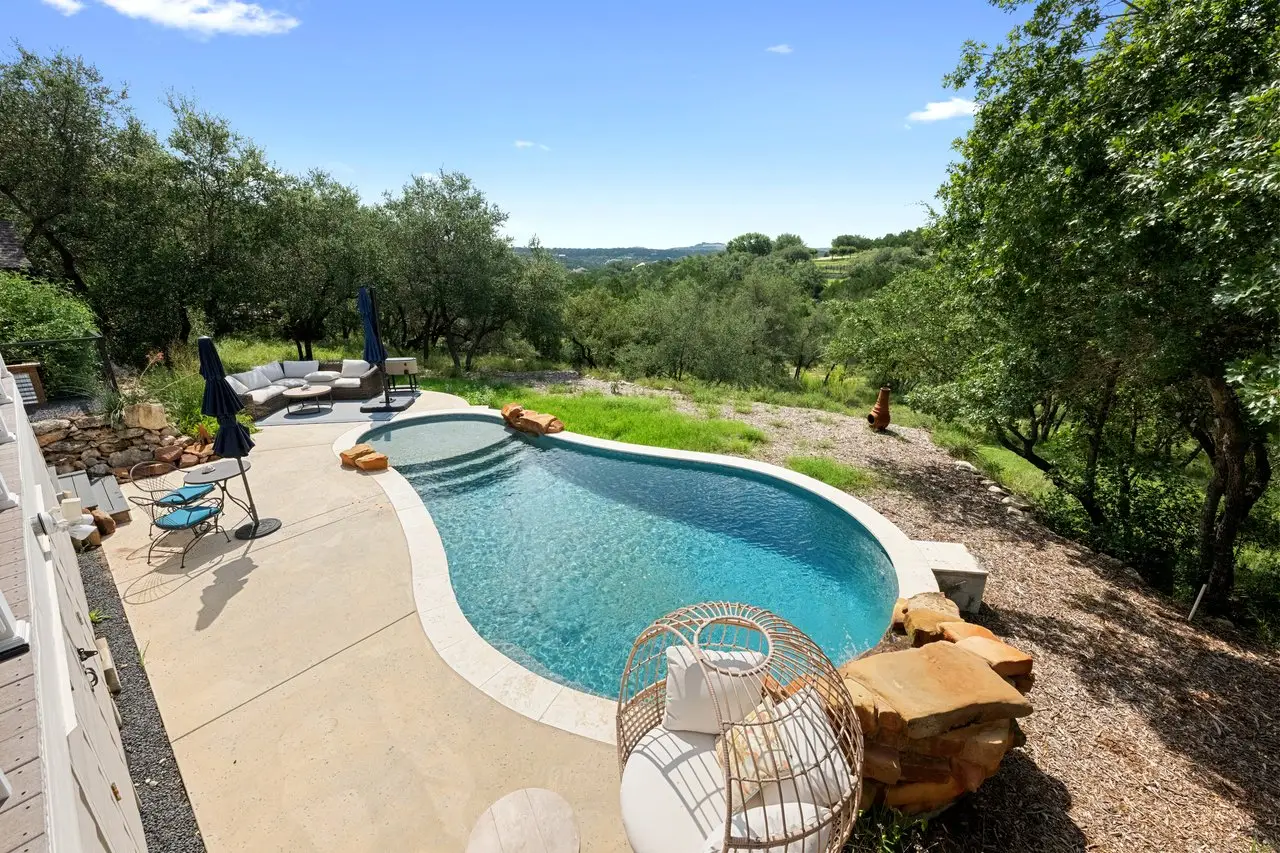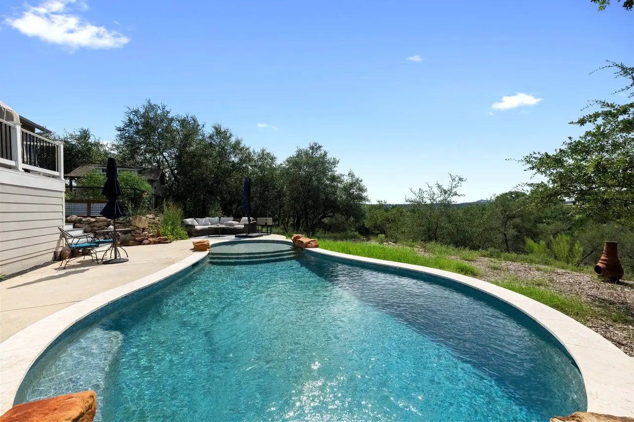 Beautifully UPDATED SINGLE-STORY near Bee Cave with panoramic Hill Country views, pool, creek, and 1.72 acres of utter privacy and serenity! Thoughtful updates and natural beauty combine in this low-tax, convenient community with private Lake Travis access. A natural rock wall and trellis-covered path lead to the front door, where a charming fountain welcomes you. Inside, abundant natural light fills the open layout, featuring two flexible spaces—ideal for offices, sitting areas, or formal dining. One includes a walk-in closet and can serve as a 4th bedroom with access to the guest bathroom. The open kitchen/living area is lined with windows capturing sweeping views and seamless indoor-outdoor flow. The kitchen boasts light gray cabinetry, honed marble counters, farmhouse sink, reverse osmosis filtration, wine fridge, and a commercial-grade 6-burner + griddle gas range with double ovens. No carpet—just upgraded lighting and flooring throughout. The private owner’s suite features a spa-like bath with a tiled rain shower, soaking tub, dual vanities, and walk-in closet, plus an attached Zen den for yoga, nursery, or office. The guest/kids wing has its own flex space for a playroom or another office option. A newly added "moody mudroom" enhances functionality and style with custom storage and designer wallpaper. Outside, enjoy a resort-style backyard with a quartz-plaster UV-purified pool, splash pad, and expansive patio. Sustainable living is supported by a raised garden with drip irrigation, private well, rainwater collection, tankless water heater, and water softener. The oversized 3-car garage offers a workshop area, decked attic storage, and additional storage beneath the back deck. All just 10 minutes from Hill Country Galleria, in acclaimed Lake Travis ISD, with ~1.6% tax rate.