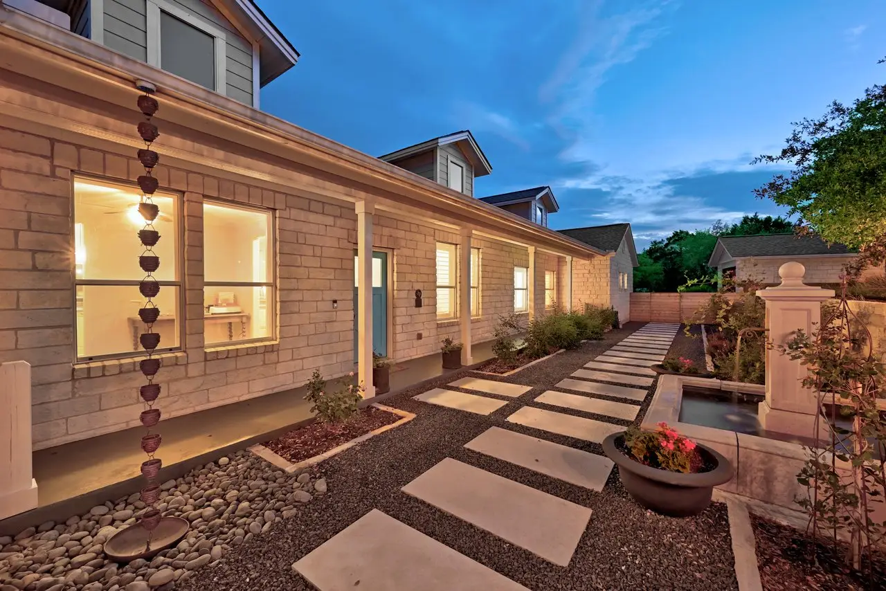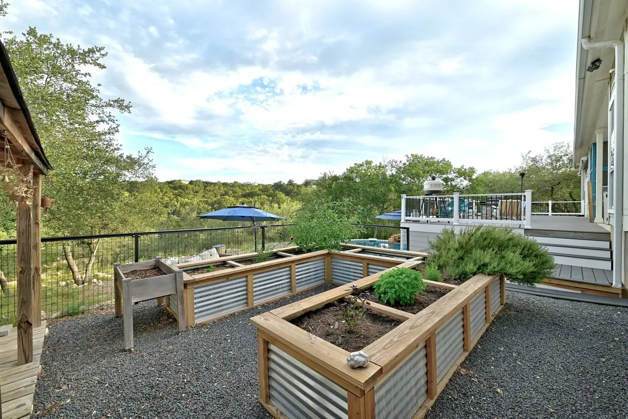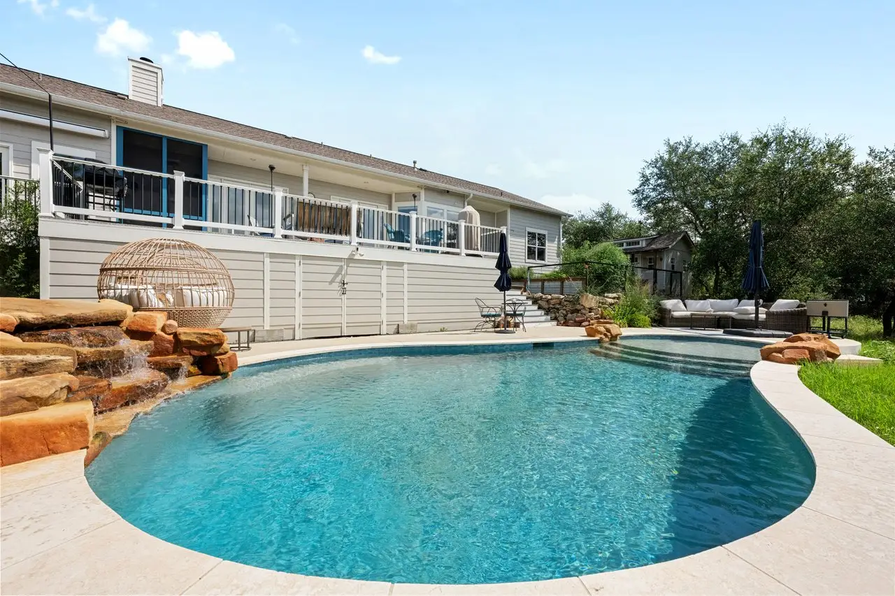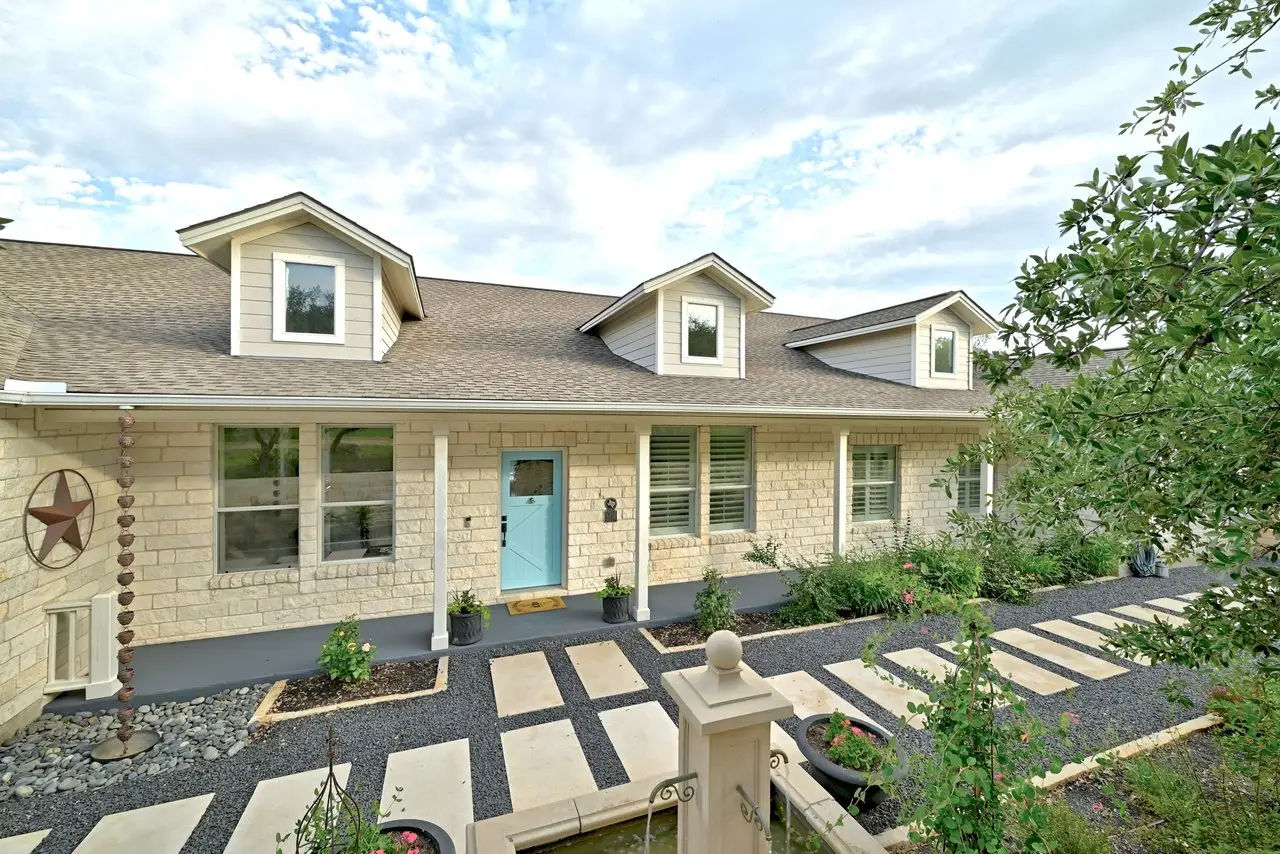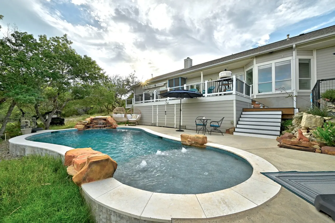 Beautifully UPDATED SINGLE-STORY near Bee Cave with panoramic Hill Country views, pool, creek, and 1.72 acres of utter privacy and serenity! Thoughtful updates and natural beauty combine in this low-tax, convenient community with private Lake Travis access. A natural rock wall and trellis-covered path lead to the front door, where a charming fountain welcomes you. Inside, abundant natural light fills the open layout, featuring two flexible spaces—ideal for offices, sitting areas, or formal dining. One includes a walk-in closet and can serve as a 4th bedroom with access to the guest bathroom. The open kitchen/living area is lined with windows capturing sweeping views and seamless indoor-outdoor flow. The kitchen boasts light gray cabinetry, honed marble counters, farmhouse sink, reverse osmosis filtration, wine fridge, and a commercial-grade 6-burner + griddle gas range with double ovens. No carpet—just upgraded lighting and flooring throughout. The private owner’s suite features a spa-like bath with a tiled rain shower, soaking tub, dual vanities, and walk-in closet, plus an attached Zen den for yoga, nursery, or office. The guest/kids wing has its own flex space for a playroom or another office option. A newly added "moody mudroom" enhances functionality and style with custom storage and designer wallpaper. Outside, enjoy a resort-style backyard with a quartz-plaster UV-purified pool, splash pad, and expansive patio. Sustainable living is supported by a raised garden with drip irrigation, private well, rainwater collection, tankless water heater, and water softener. The oversized 3-car garage offers a workshop area, decked attic storage, and additional storage beneath the back deck. All just 10 minutes from Hill Country Galleria, in acclaimed Lake Travis ISD, with ~1.6% tax rate.