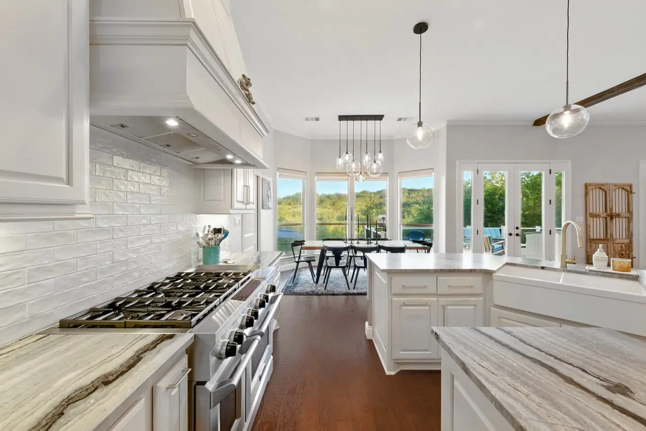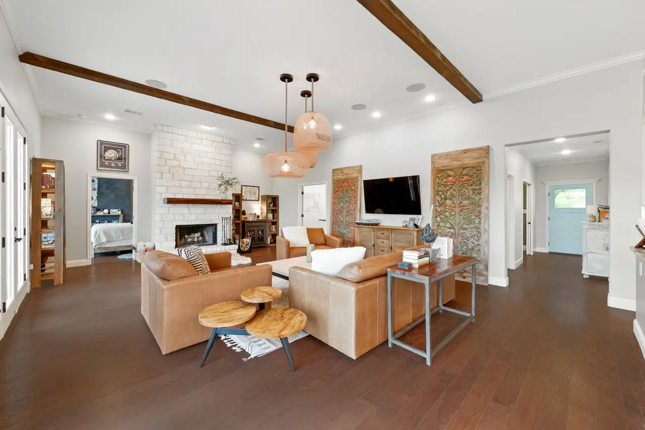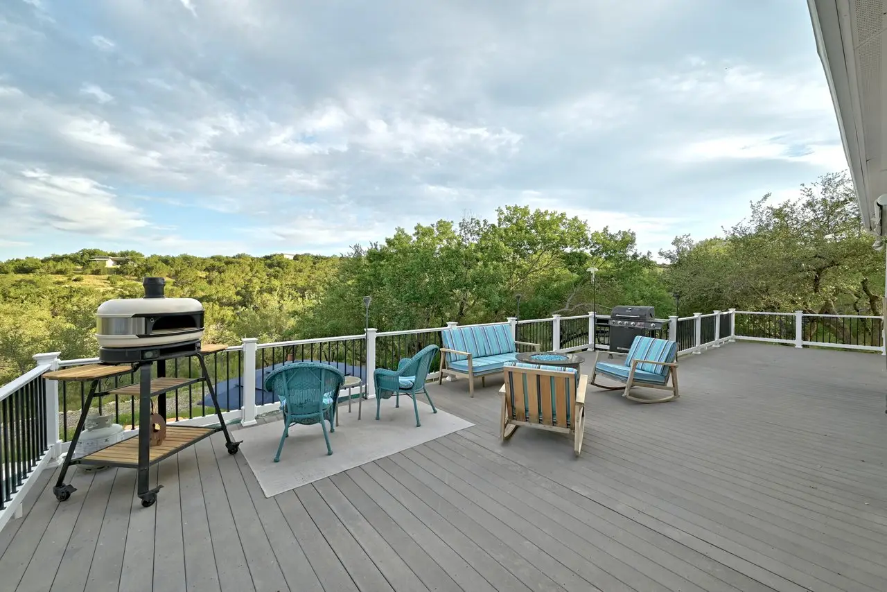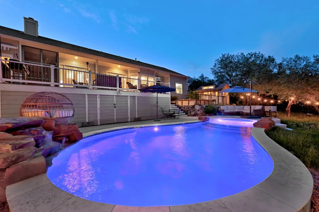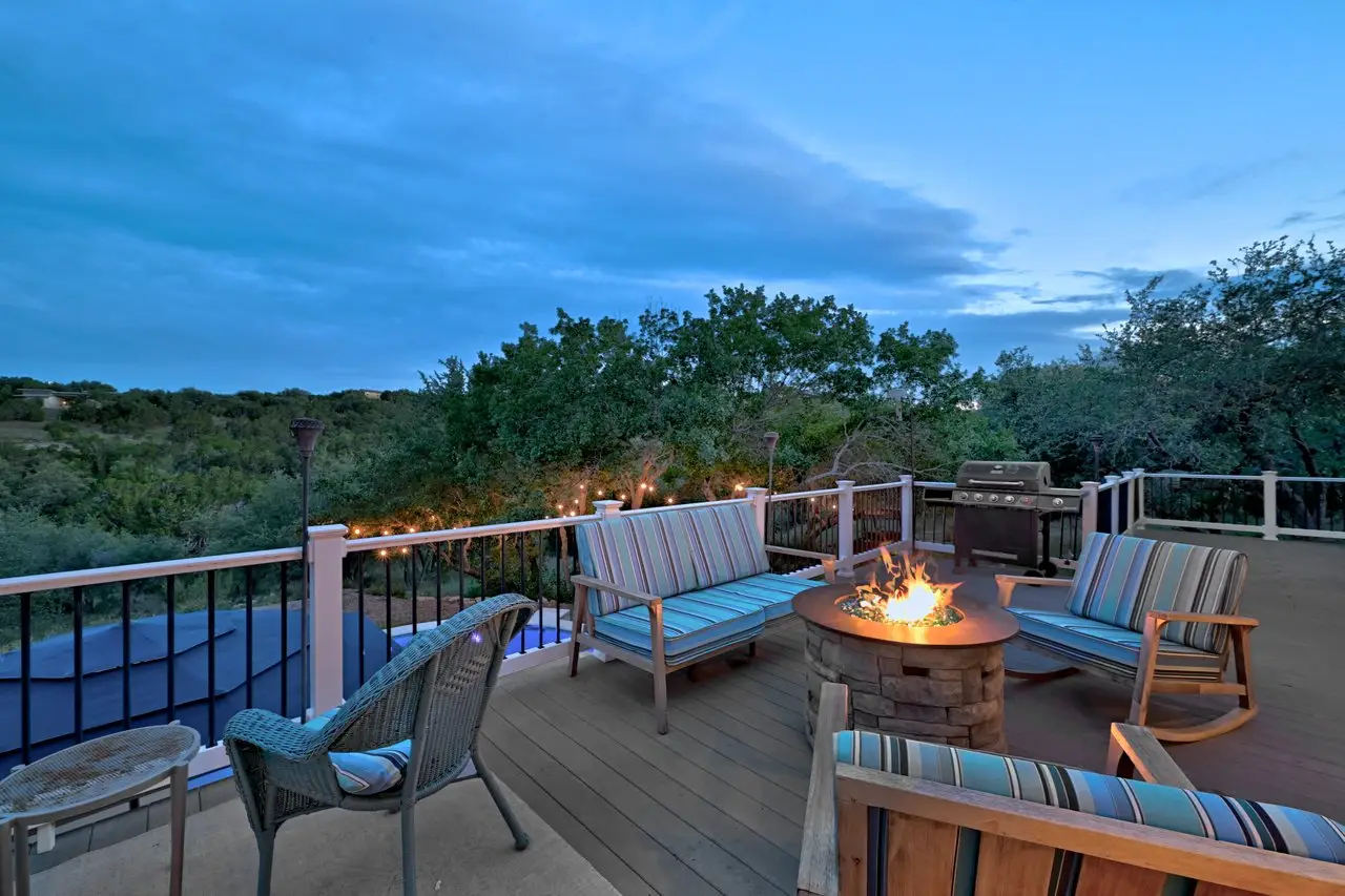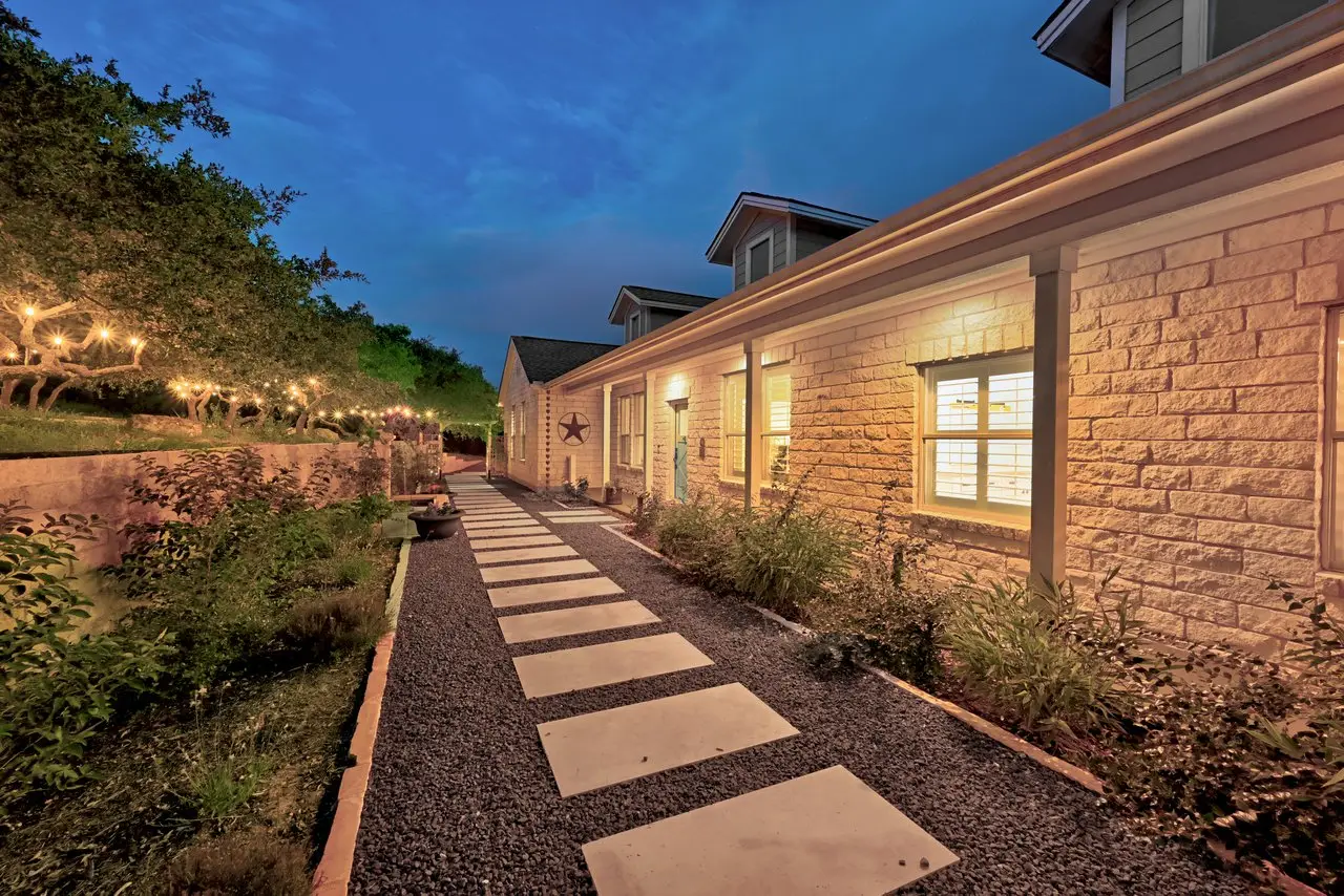 Beautifully UPDATED SINGLE-STORY near Bee Cave with panoramic Hill Country views, pool, creek, and 1.72 acres of utter privacy and serenity! Thoughtful updates and natural beauty combine in this low-tax, convenient community with private Lake Travis access. A natural rock wall and trellis-covered path lead to the front door, where a charming fountain welcomes you. Inside, abundant natural light fills the open layout, featuring two flexible spaces—ideal for offices, sitting areas, or formal dining. One includes a walk-in closet and can serve as a 4th bedroom with access to the guest bathroom. The open kitchen/living area is lined with windows capturing sweeping views and seamless indoor-outdoor flow. The kitchen boasts light gray cabinetry, honed marble counters, farmhouse sink, reverse osmosis filtration, wine fridge, and a commercial-grade 6-burner + griddle gas range with double ovens. No carpet—just upgraded lighting and flooring throughout. The private owner’s suite features a spa-like bath with a tiled rain shower, soaking tub, dual vanities, and walk-in closet, plus an attached Zen den for yoga, nursery, or office. The guest/kids wing has its own flex space for a playroom or another office option. A newly added "moody mudroom" enhances functionality and style with custom storage and designer wallpaper. Outside, enjoy a resort-style backyard with a quartz-plaster UV-purified pool, splash pad, and expansive patio. Sustainable living is supported by a raised garden with drip irrigation, private well, rainwater collection, tankless water heater, and water softener. The oversized 3-car garage offers a workshop area, decked attic storage, and additional storage beneath the back deck. All just 10 minutes from Hill Country Galleria, in acclaimed Lake Travis ISD, with ~1.6% tax rate.