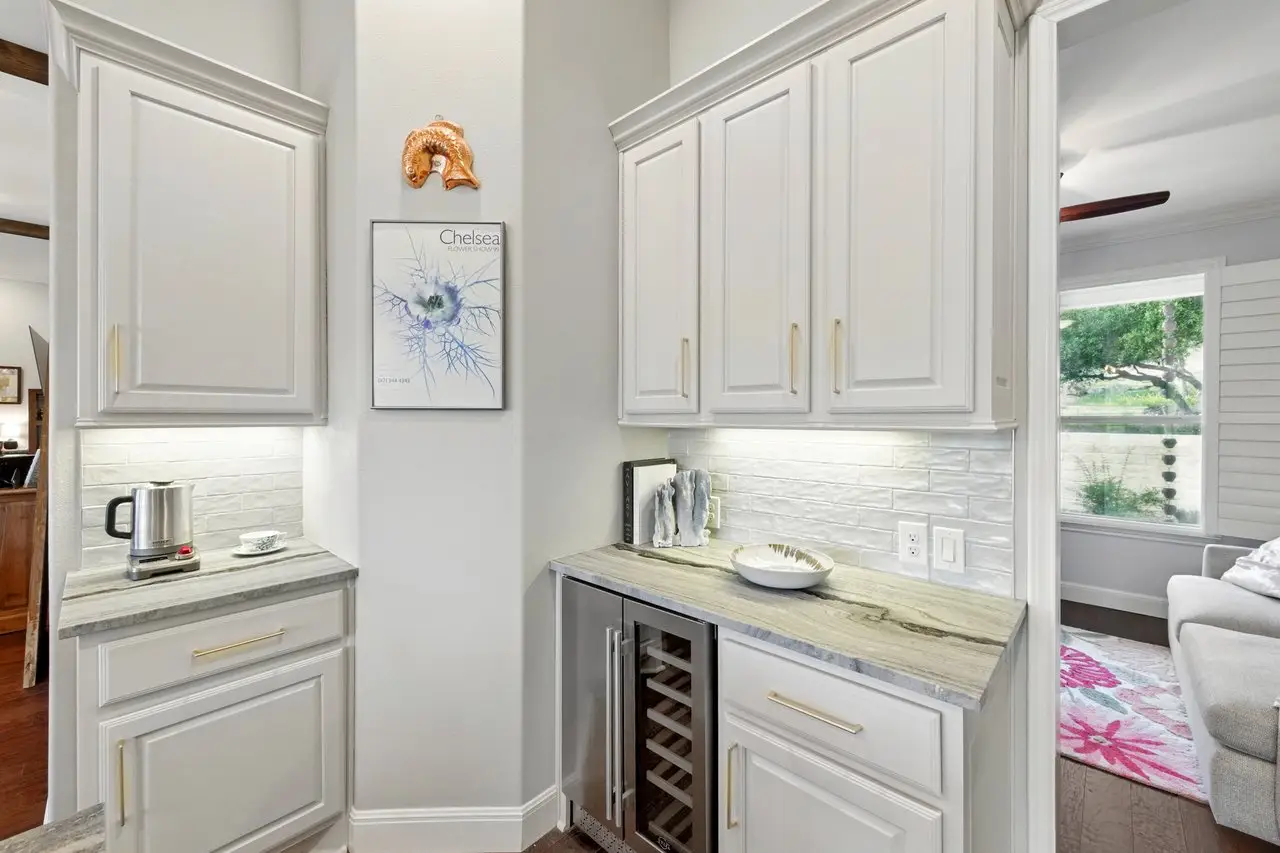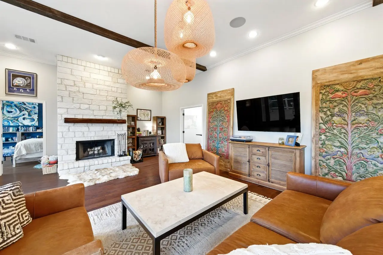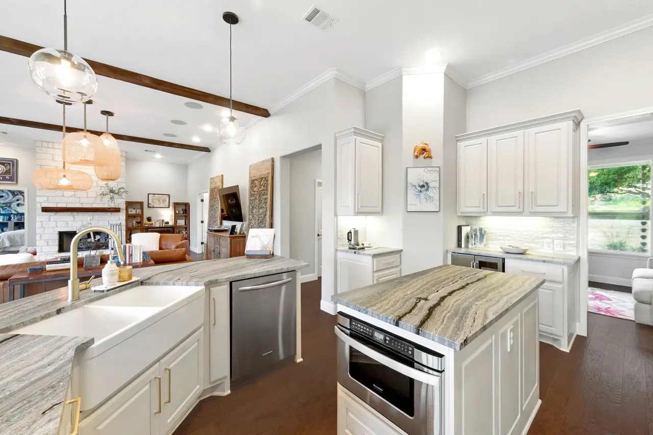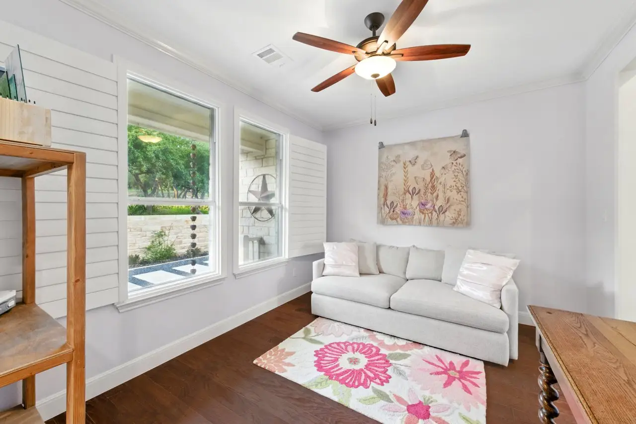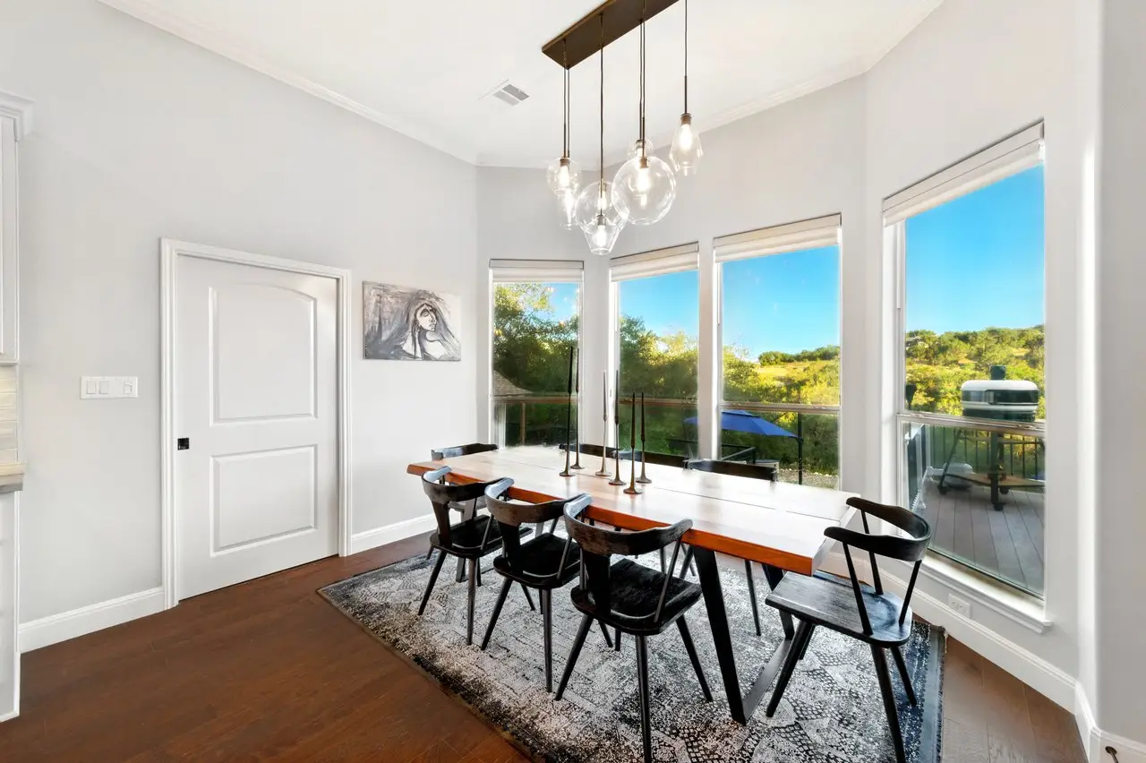 Beautifully UPDATED SINGLE-STORY near Bee Cave with panoramic Hill Country views, pool, creek, and 1.72 acres of utter privacy and serenity! Thoughtful updates and natural beauty combine in this low-tax, convenient community with private Lake Travis access. A natural rock wall and trellis-covered path lead to the front door, where a charming fountain welcomes you. Inside, abundant natural light fills the open layout, featuring two flexible spaces—ideal for offices, sitting areas, or formal dining. One includes a walk-in closet and can serve as a 4th bedroom with access to the guest bathroom. The open kitchen/living area is lined with windows capturing sweeping views and seamless indoor-outdoor flow. The kitchen boasts light gray cabinetry, honed marble counters, farmhouse sink, reverse osmosis filtration, wine fridge, and a commercial-grade 6-burner + griddle gas range with double ovens. No carpet—just upgraded lighting and flooring throughout. The private owner’s suite features a spa-like bath with a tiled rain shower, soaking tub, dual vanities, and walk-in closet, plus an attached Zen den for yoga, nursery, or office. The guest/kids wing has its own flex space for a playroom or another office option. A newly added "moody mudroom" enhances functionality and style with custom storage and designer wallpaper. Outside, enjoy a resort-style backyard with a quartz-plaster UV-purified pool, splash pad, and expansive patio. Sustainable living is supported by a raised garden with drip irrigation, private well, rainwater collection, tankless water heater, and water softener. The oversized 3-car garage offers a workshop area, decked attic storage, and additional storage beneath the back deck. All just 10 minutes from Hill Country Galleria, in acclaimed Lake Travis ISD, with ~1.6% tax rate.