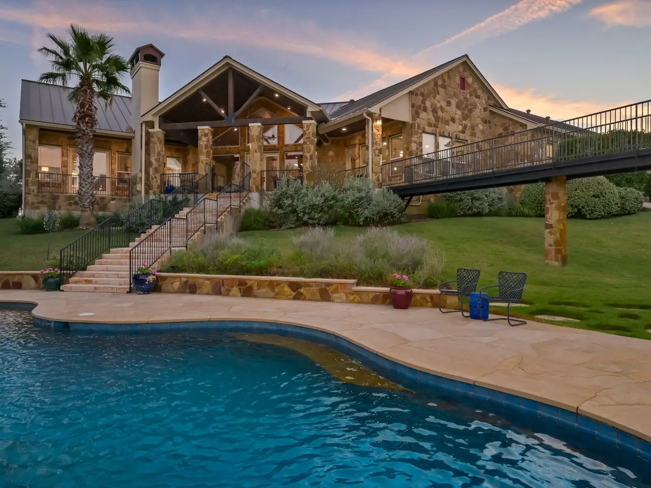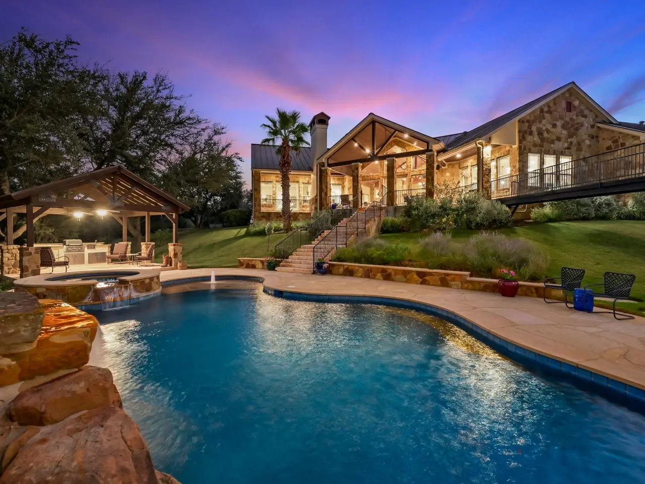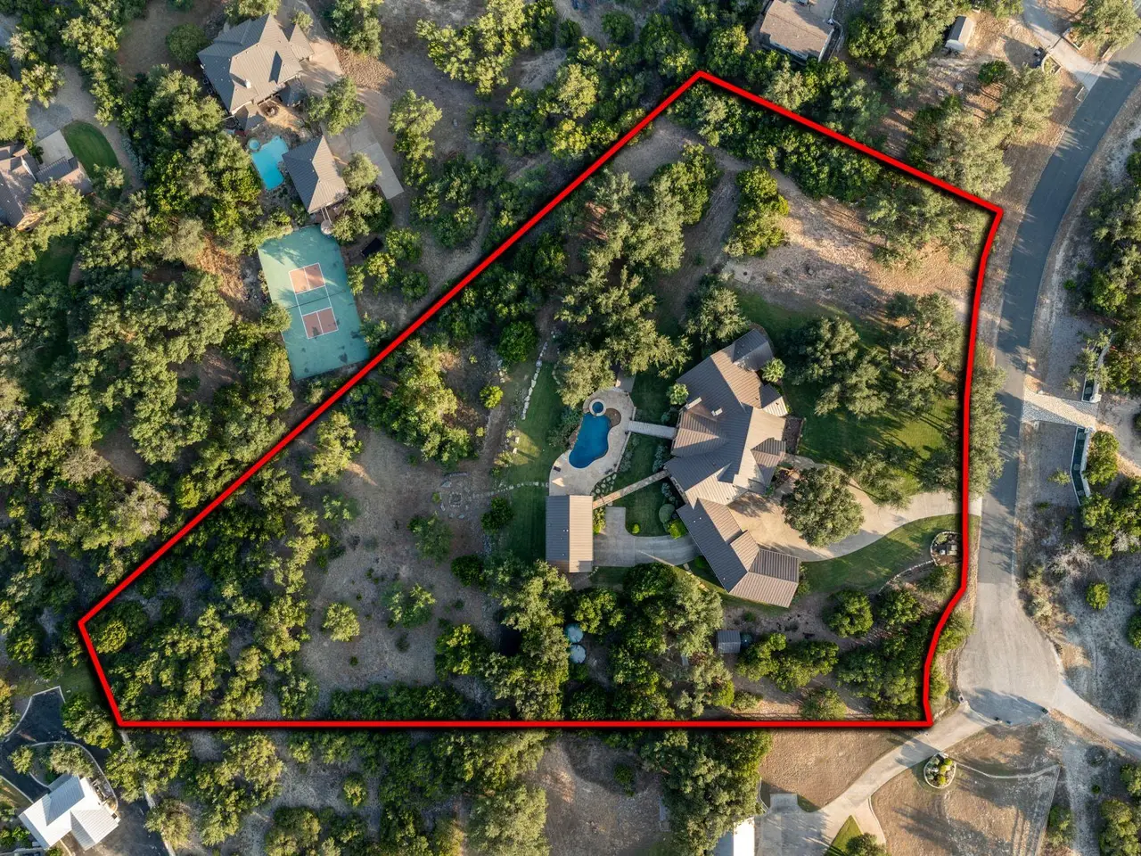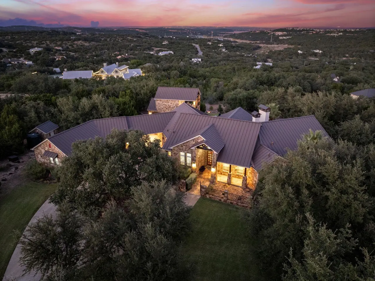 3 + acres of beautifully maintained property. Feels like your far out in the Hill Country with privacy, silence, unrestricted big sky views and abundant wildlife, but just minutes from Lakeway amenities and highway 71. Only 30 minutes to Austin or a short drive west to the Hill Country. Single story 4 bed, 4 bath, 3 car garage main house, 2 story 1 bed, 2 bath 2 car garage guest house connected by an elevated walkway, a very unique set up. This property is well equipped with soaring knotty pine ceilings, stone accents, hardwood/stone floors, 8 ft doors, custom wide moldings, wall of windows in great room, gourmet kitchen, pool, spa, waterfall, oversize entertaining pavilion with kitchen, covered patio off main house with fireplace, covered patio off upper level of guest house, fenced garden, well a with two approx two 5,000 gal holding tanks for irrigation only, access to HOA boat ramp.This property is a MUST SEE!! 24 hours notice for all showings please call listing agent 512-656-3378