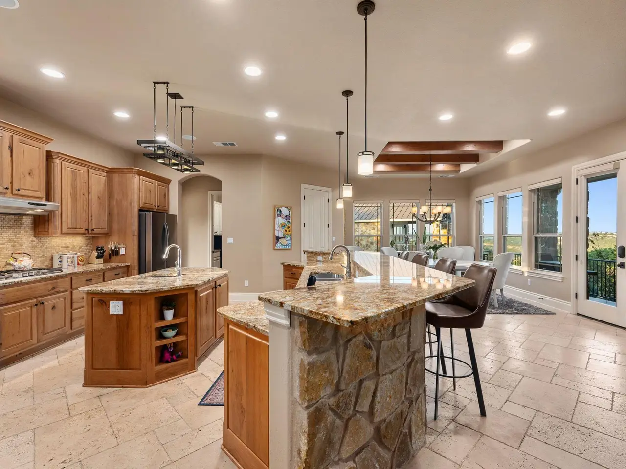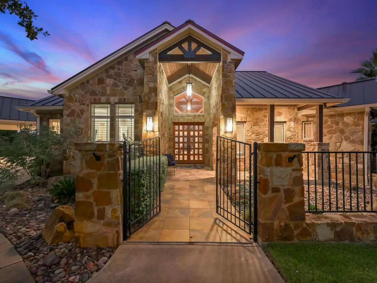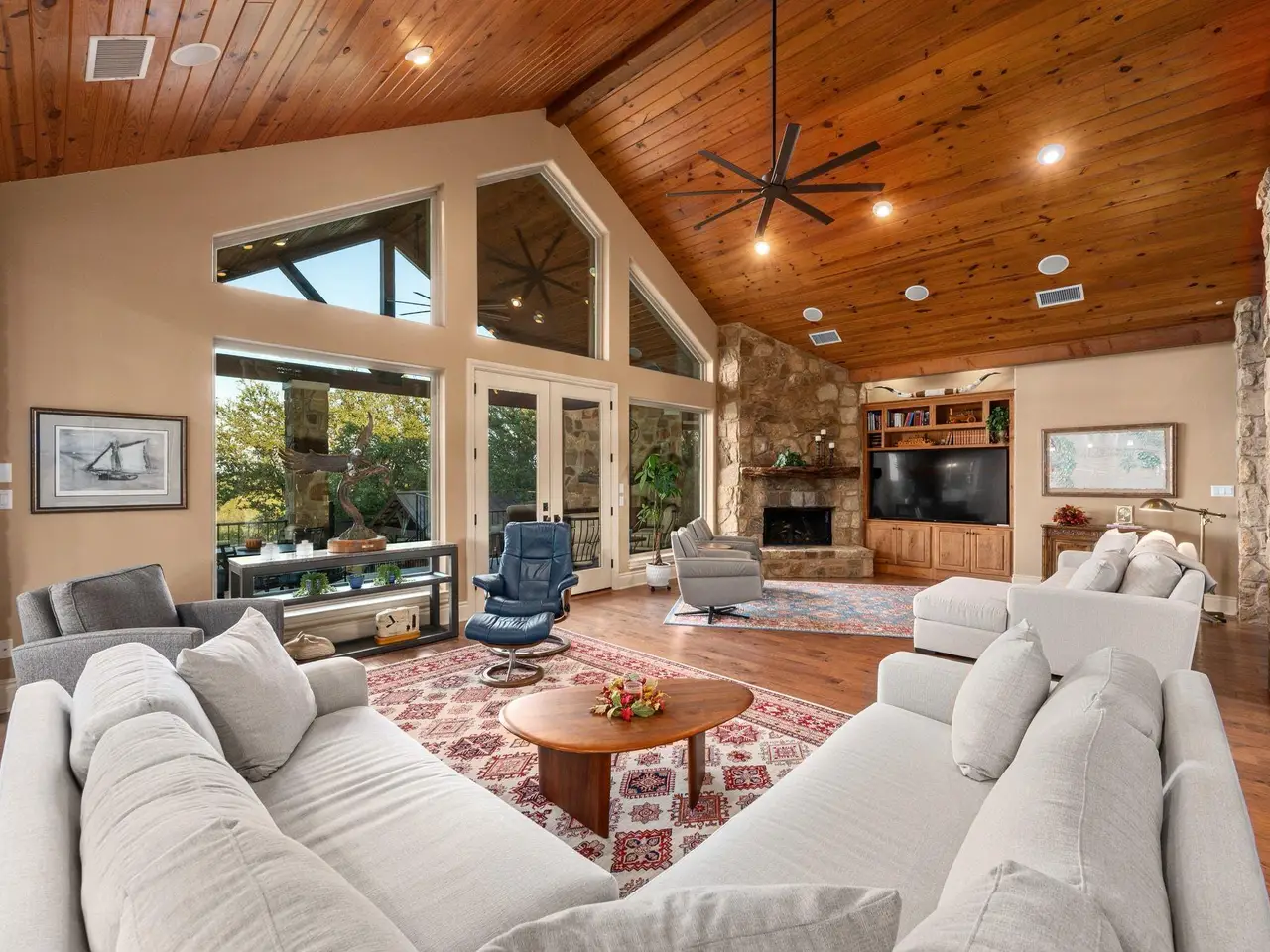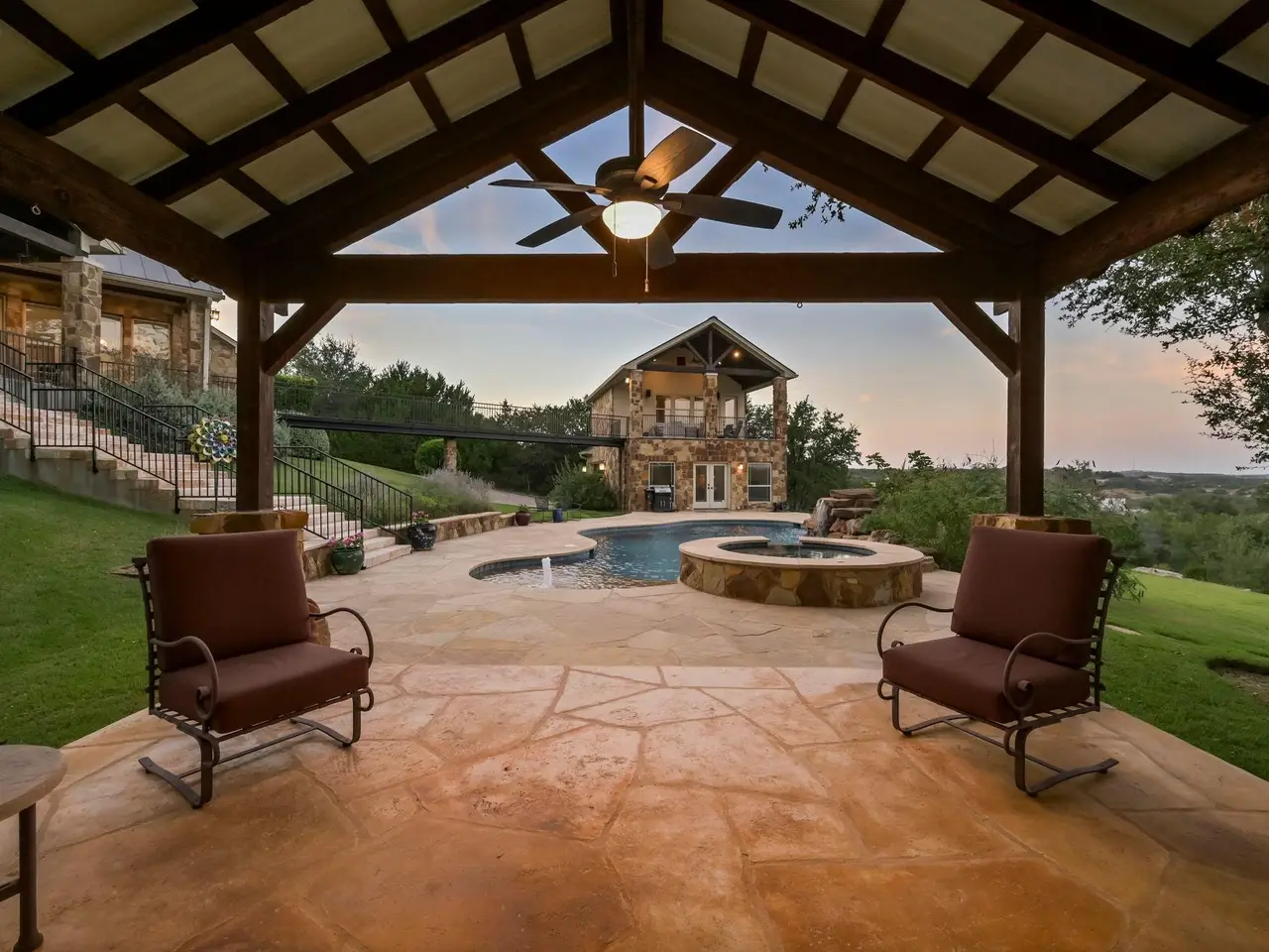 3 + acres of beautifully maintained property. Feels like your far out in the Hill Country with privacy, silence, unrestricted big sky views and abundant wildlife, but just minutes from Lakeway amenities and highway 71. Only 30 minutes to Austin or a short drive west to the Hill Country. Single story 4 bed, 4 bath, 3 car garage main house, 2 story 1 bed, 2 bath 2 car garage guest house connected by an elevated walkway, a very unique set up. This property is well equipped with soaring knotty pine ceilings, stone accents, hardwood/stone floors, 8 ft doors, custom wide moldings, wall of windows in great room, gourmet kitchen, pool, spa, waterfall, oversize entertaining pavilion with kitchen, covered patio off main house with fireplace, covered patio off upper level of guest house, fenced garden, well a with two approx two 5,000 gal holding tanks for irrigation only, access to HOA boat ramp.This property is a MUST SEE!! 24 hours notice for all showings please call listing agent 512-656-3378