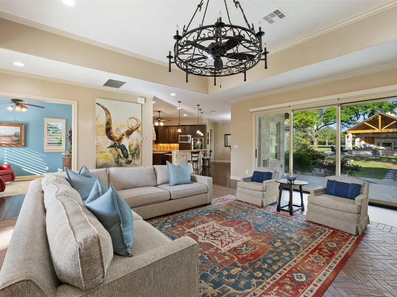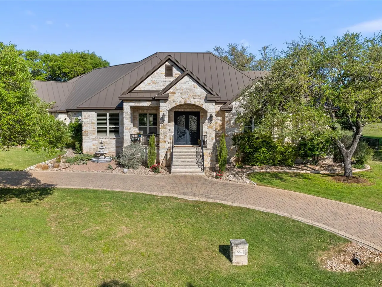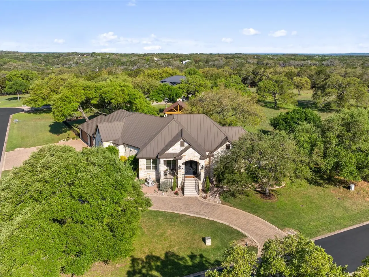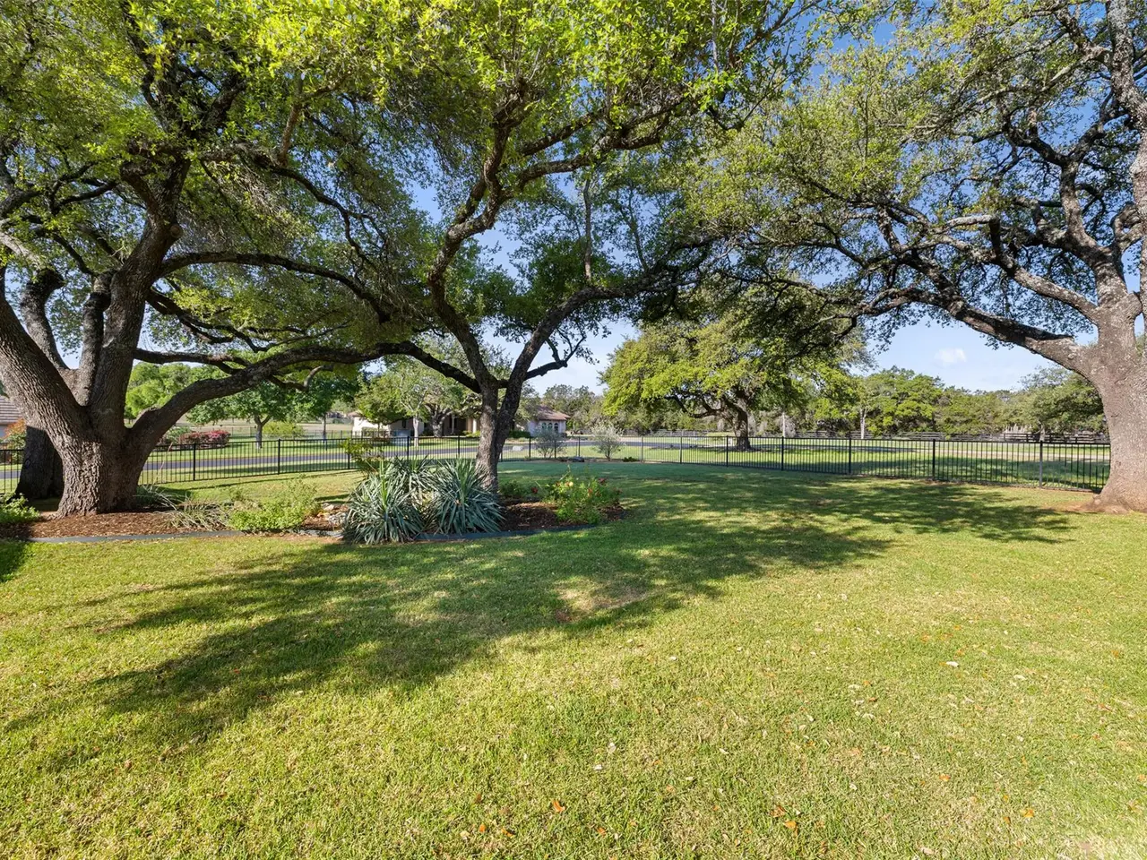 Located in the prestigious gated and guarded Barton Creek Lakeside community, this single-story custom home offers a seamless blend of Hill Country charm and modern comfort. Situated on a large 0.68-acre corner lot, the property is surrounded by mature oak trees and features a wide paver driveway and spacious covered patios perfect for outdoor living. The open-concept living and kitchen area is highlighted by a large center island, granite countertops, and wood shutters throughout. With an in-law floor plan and wide entryways, the home is designed for accessibility and ease of living. One of the bedrooms, located privately at the rear of the home, is ideal as a guest suite, office, or hobby space and includes its own bathroom & outdoor patio. Additional features include a 3-car attached garage, plantation shutters, a laundry room with utility sink, and beautiful wood and brick flooring. The expansive covered back patio and fenced yard provide a tranquil setting to enjoy the peaceful Hill Country surroundings. Barton Creek Lakeside offers access to a private country club with an 18-hole Arnold Palmer-designed golf course, fitness center, tennis courts, Olympic-sized pool, and Lake Travis access. Just a short drive to Spicewood and the surrounding Hill Country, this home combines quality construction, generous space, and resort-style amenities in a quiet, upscale community.