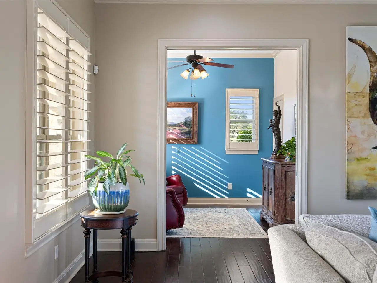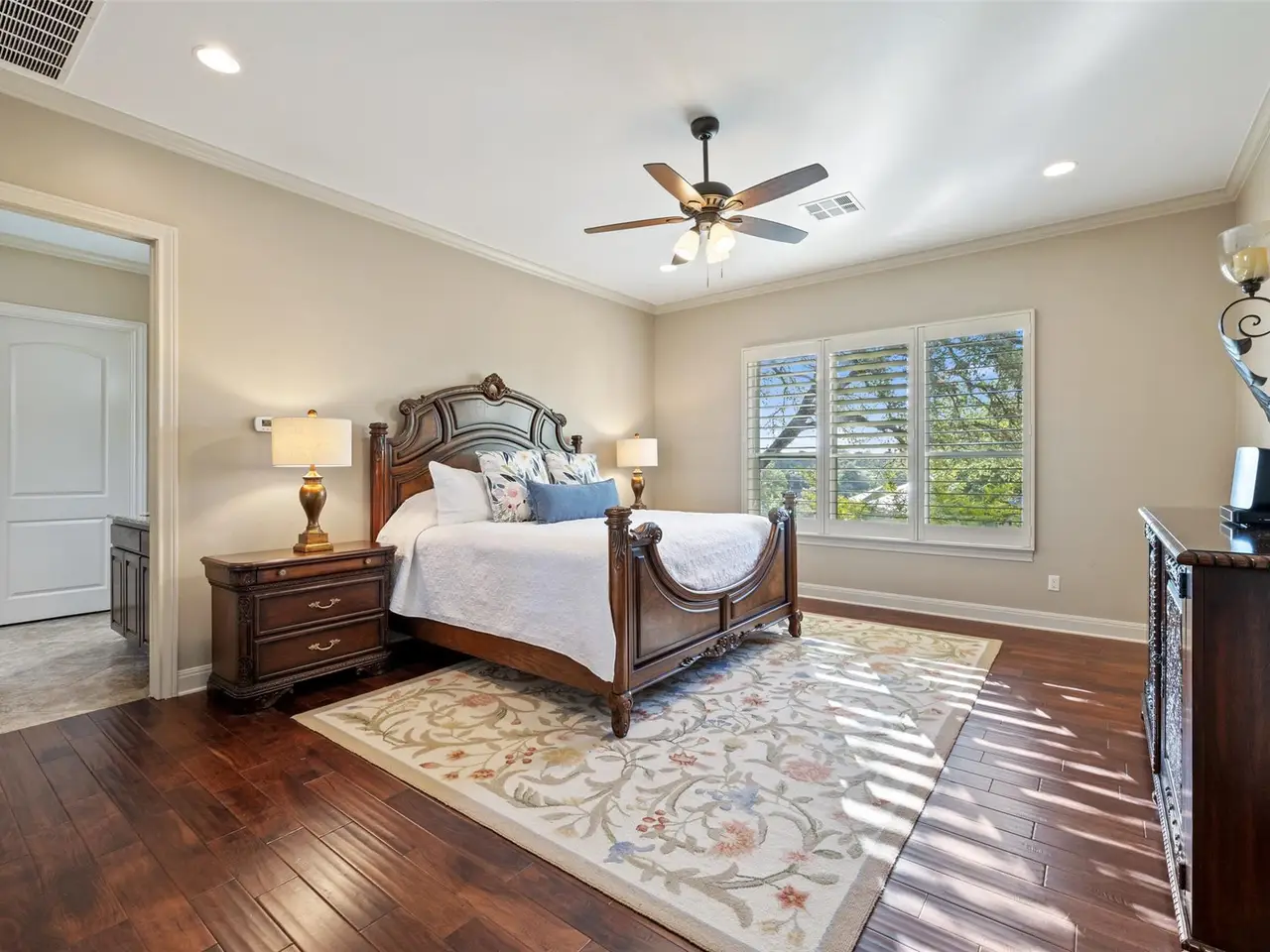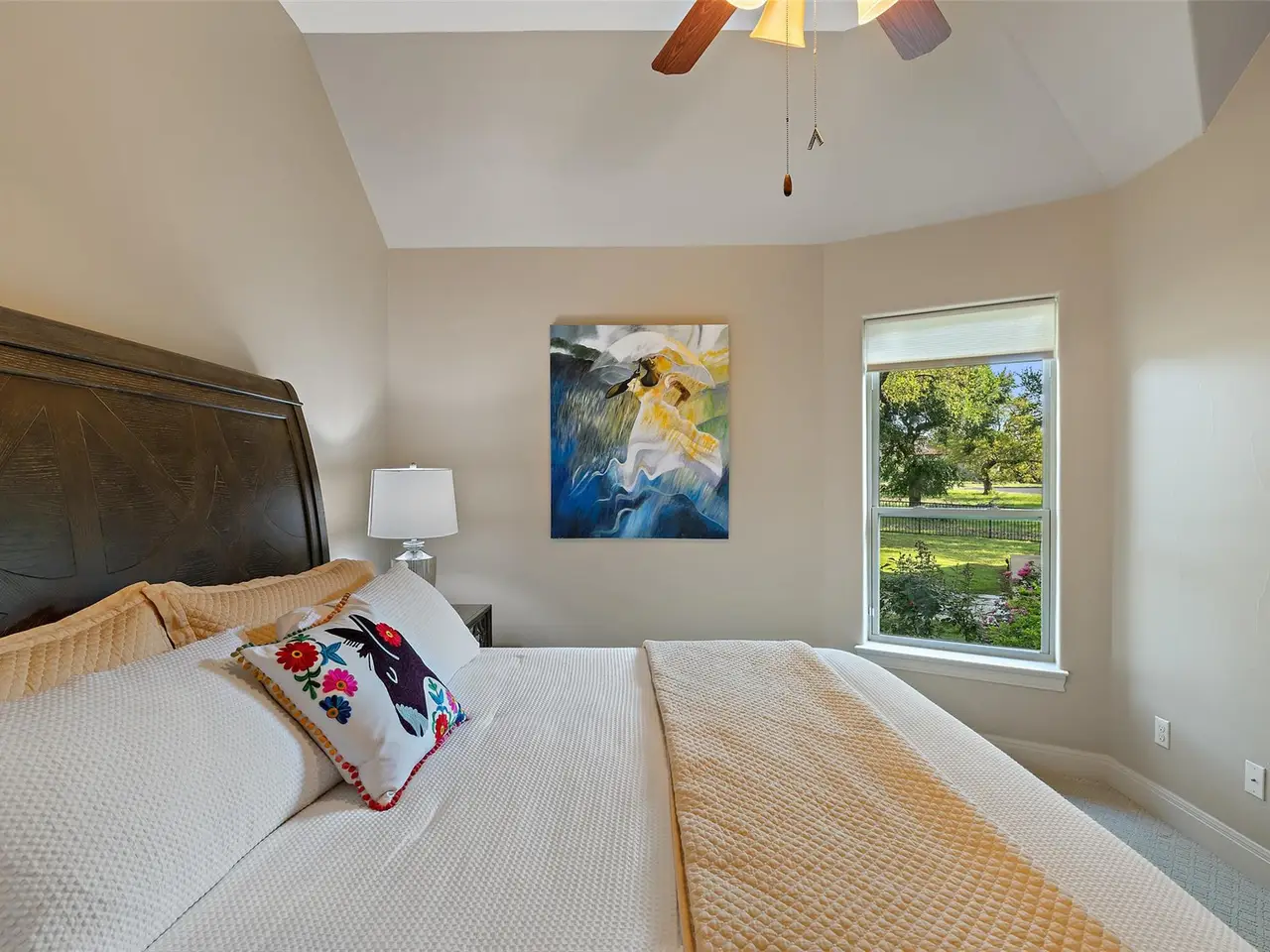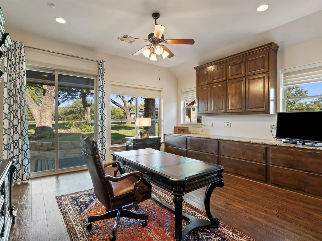 Located in the prestigious gated and guarded Barton Creek Lakeside community, this single-story custom home offers a seamless blend of Hill Country charm and modern comfort. Situated on a large 0.68-acre corner lot, the property is surrounded by mature oak trees and features a wide paver driveway and spacious covered patios perfect for outdoor living. The open-concept living and kitchen area is highlighted by a large center island, granite countertops, and wood shutters throughout. With an in-law floor plan and wide entryways, the home is designed for accessibility and ease of living. One of the bedrooms, located privately at the rear of the home, is ideal as a guest suite, office, or hobby space and includes its own bathroom & outdoor patio. Additional features include a 3-car attached garage, plantation shutters, a laundry room with utility sink, and beautiful wood and brick flooring. The expansive covered back patio and fenced yard provide a tranquil setting to enjoy the peaceful Hill Country surroundings. Barton Creek Lakeside offers access to a private country club with an 18-hole Arnold Palmer-designed golf course, fitness center, tennis courts, Olympic-sized pool, and Lake Travis access. Just a short drive to Spicewood and the surrounding Hill Country, this home combines quality construction, generous space, and resort-style amenities in a quiet, upscale community.