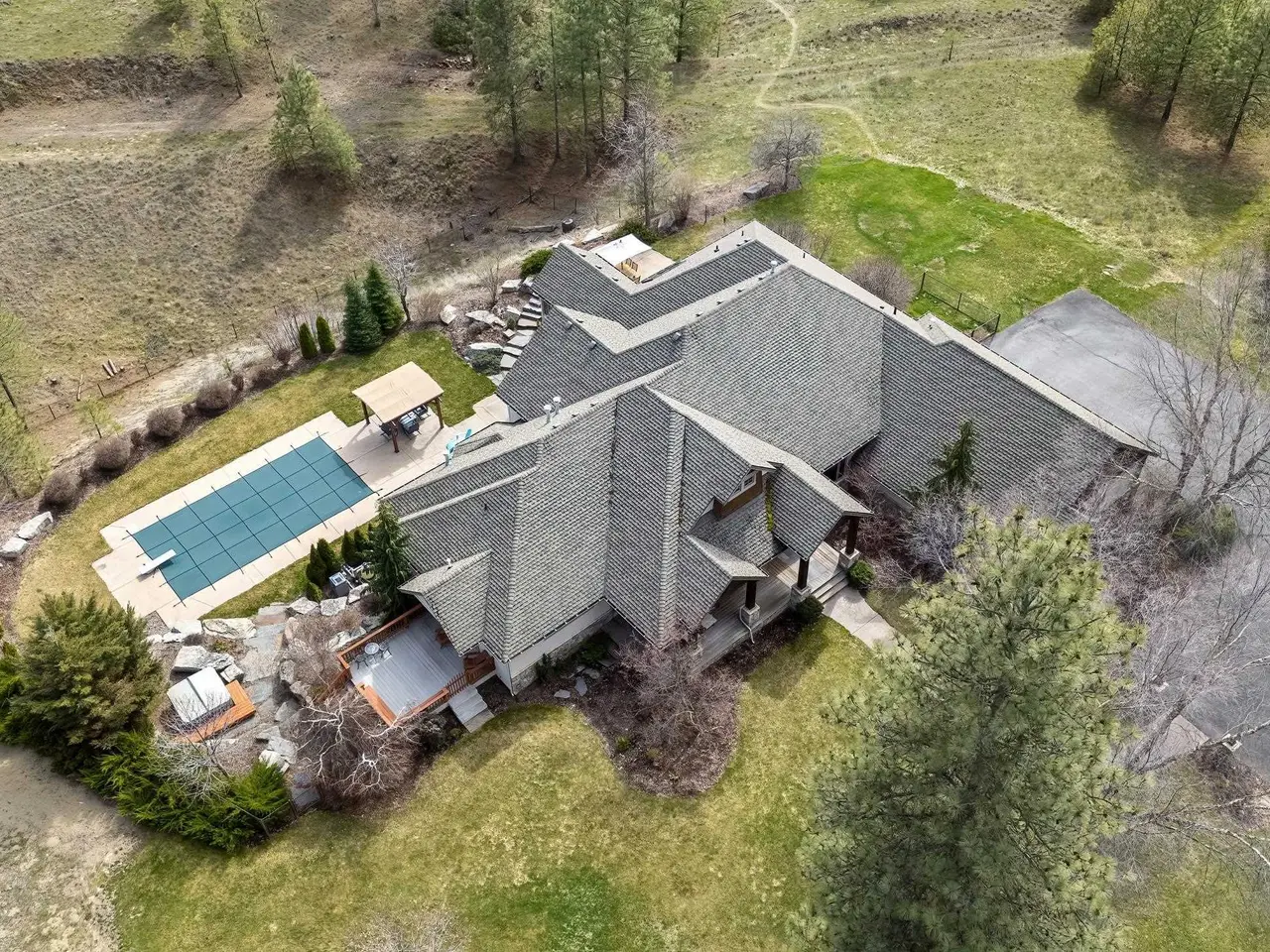 Located on over 10 spectacular acres behind the gates in exclusive Riverbluff Estates, the location + setting of this exquisite, custom Craftsman is private + serene, yet shopping, restaurants, St. George's School, the Little Spokane River Natural Area + Kalispel Golf + Country Club are only minutes away. Amenities include a beautiful open floor plan, generously appointed rooms, vaulted ceilings w/exposed beams, natural stone fireplaces + accents, spacious island kitchen, luxurious primary suite, sun room, fully finished lower level, private backyard space with patio, in-ground pool + hot tub, and room for a shop. Home comes equipped with all of the expected features of a home in this class, and the lower level could function easily for multi-generational living. This is a truly spectacular property!