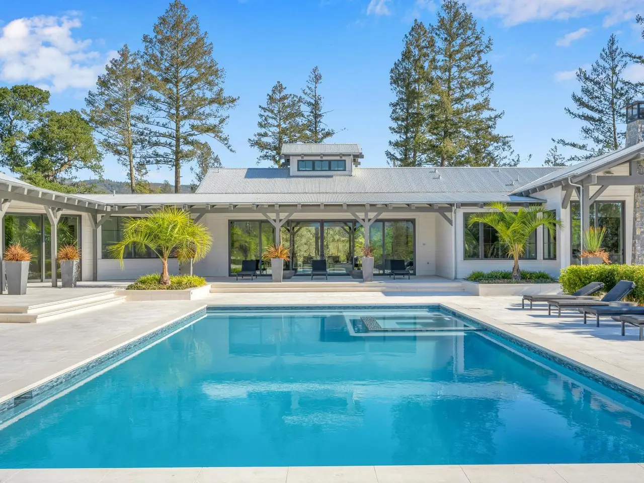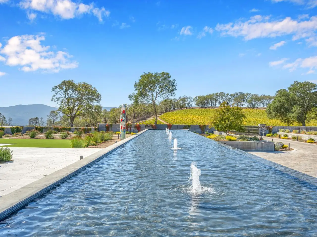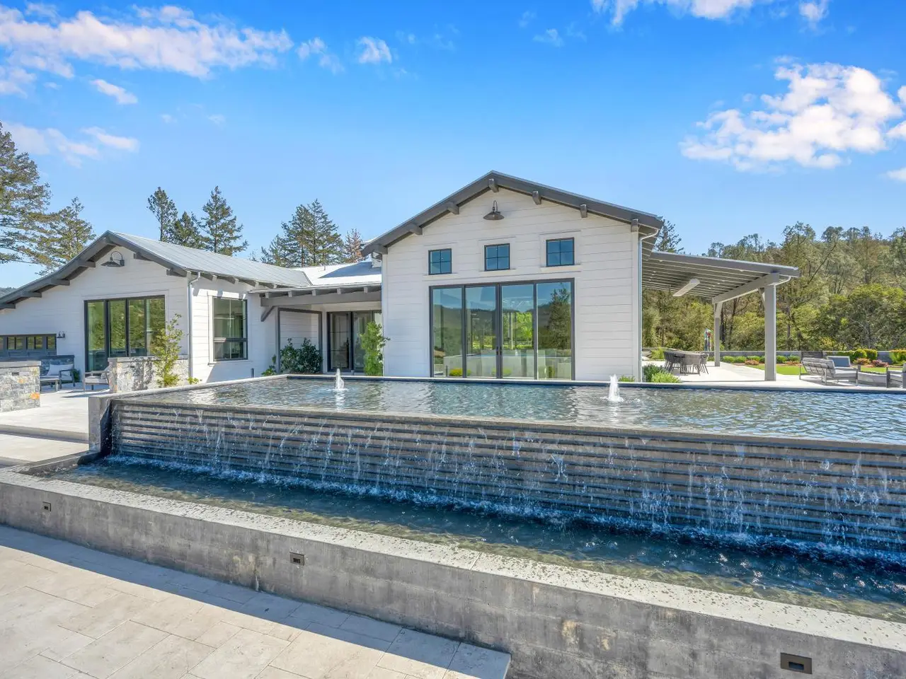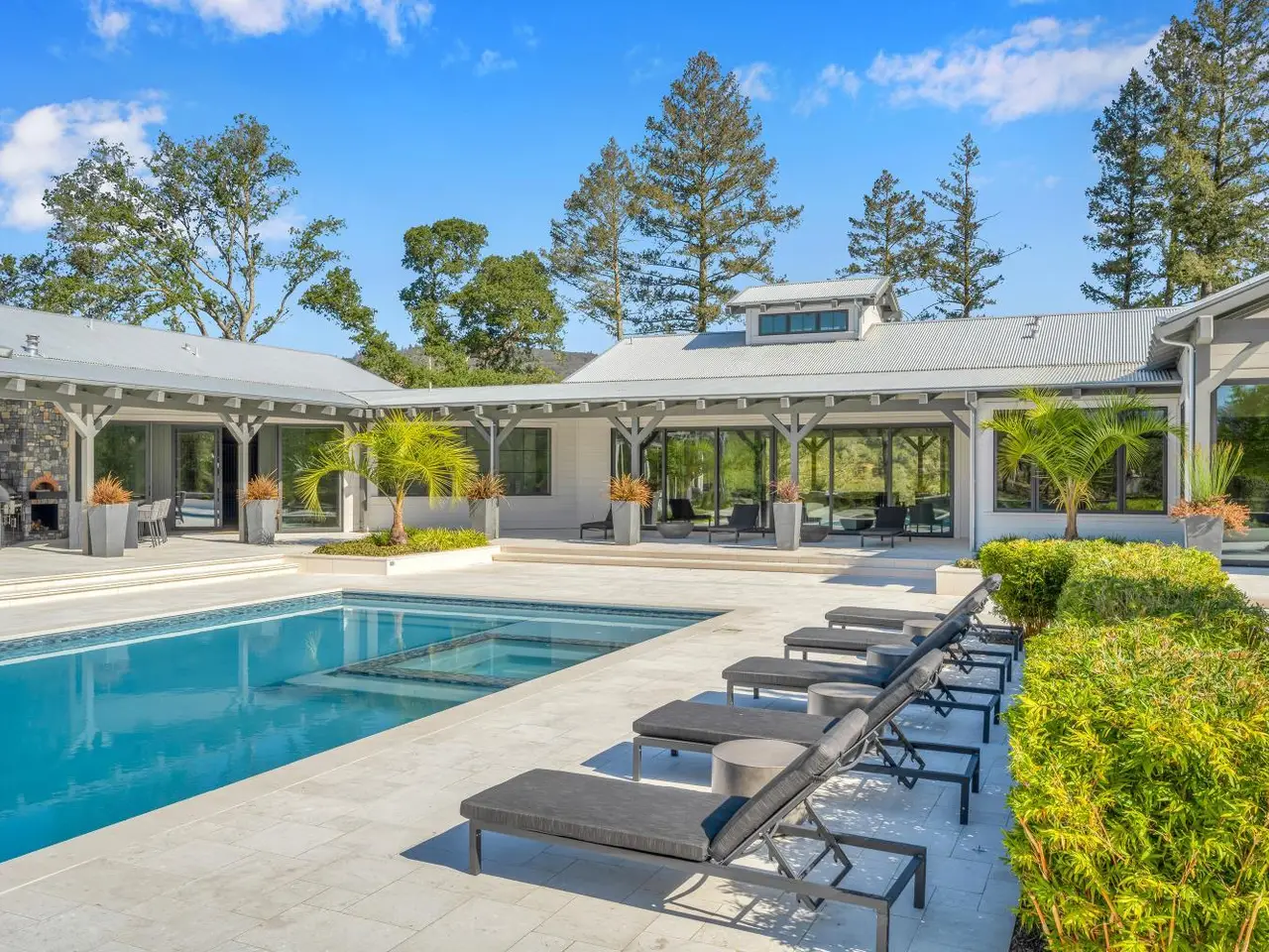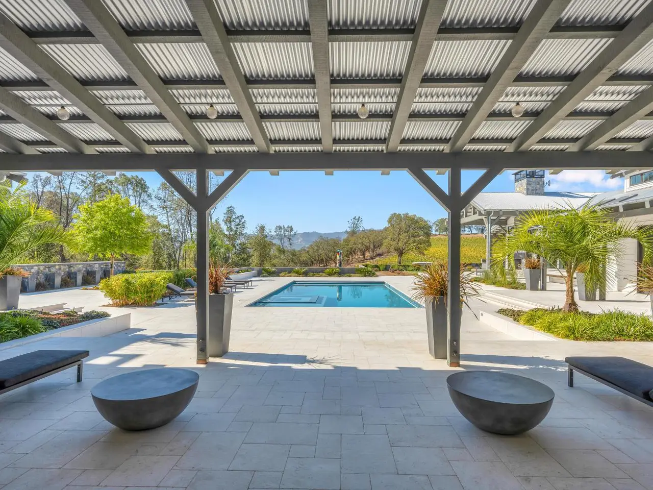 A luxury estate set on 8.04 acres across from the famed upper ridge vineyards of Joseph Phelps, this property has been meticulously designed to maximize privacy, capture vineyard vistas, and harmonize with the surrounding topography. The 7,920 sq. ft. main residence showcases four bedrooms and is constructed with the highest quality materials and finishes. Inside, the home features a dramatic great room, a true chef's kitchen, office/study, walk-in wine cellar, media lounge, and a primary suite with its own private entry lounge. A secondary 1,200 sq. ft. dwelling offers two bedrooms, a full kitchen, living room, and covered patios at both the front and back, providing ideal accommodations for guests. Outdoor living is equally compelling, with more than 2,600 sq. ft. of covered space designed for seamless indoor/outdoor living. Expansive limestone patios lead to a fully equipped outdoor kitchen with pizza oven, resort-style pool and spa, two firepits, an outdoor fireplace, and a bocce courtall thoughtfully crafted for both intimate gatherings and large-scale entertaining.