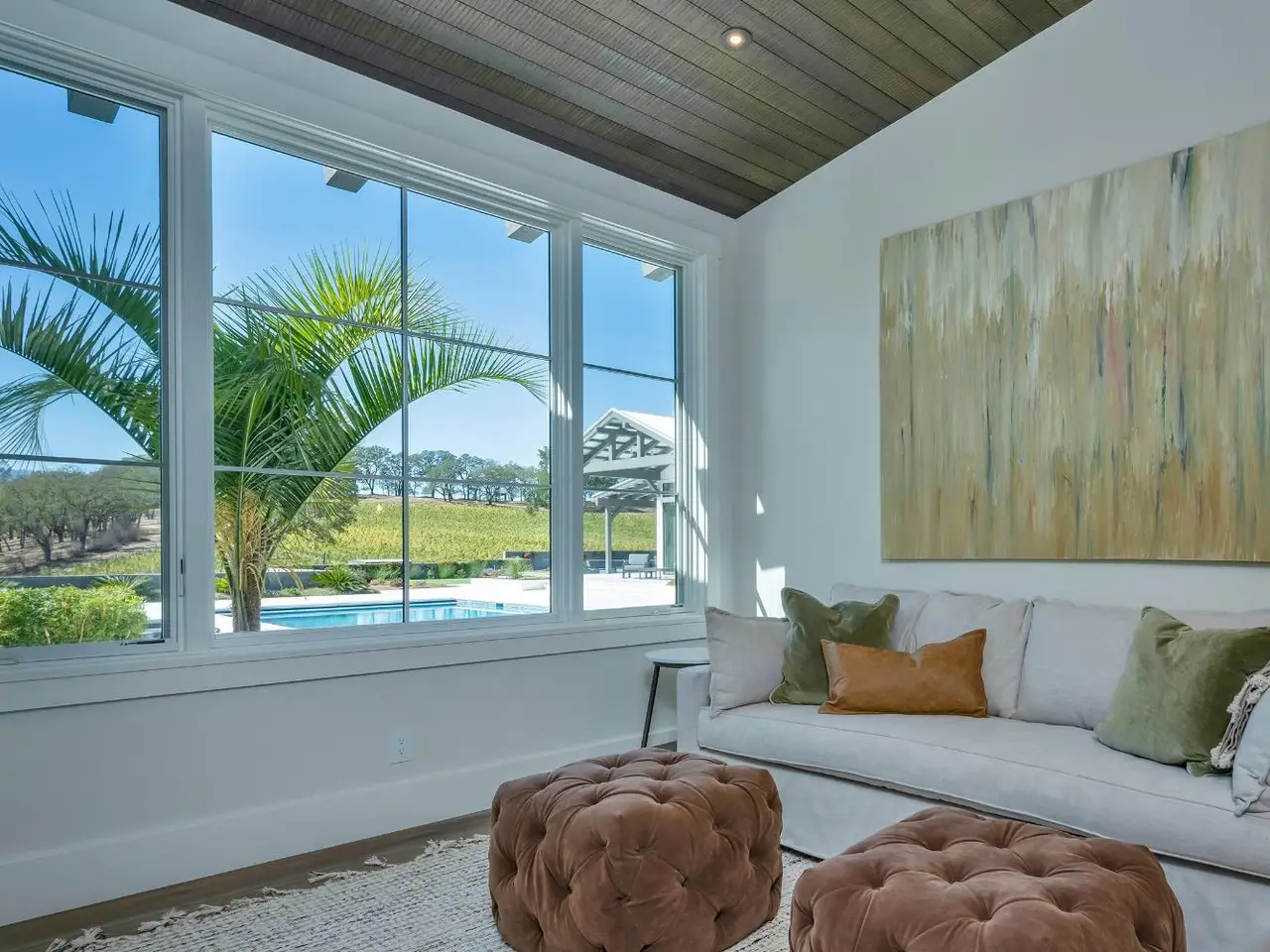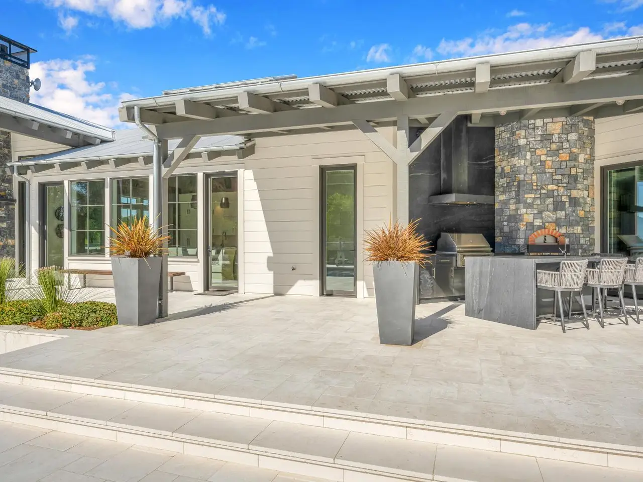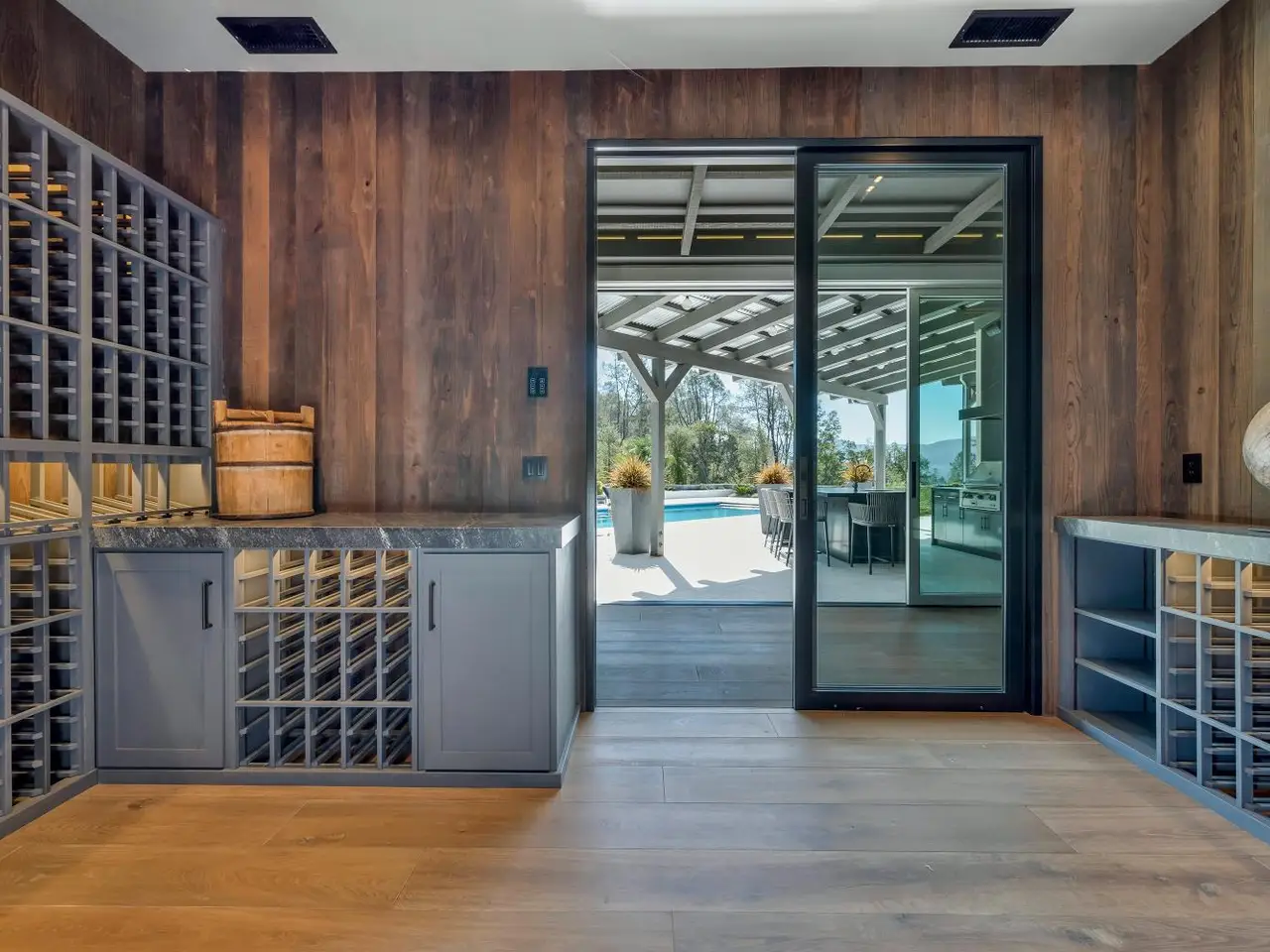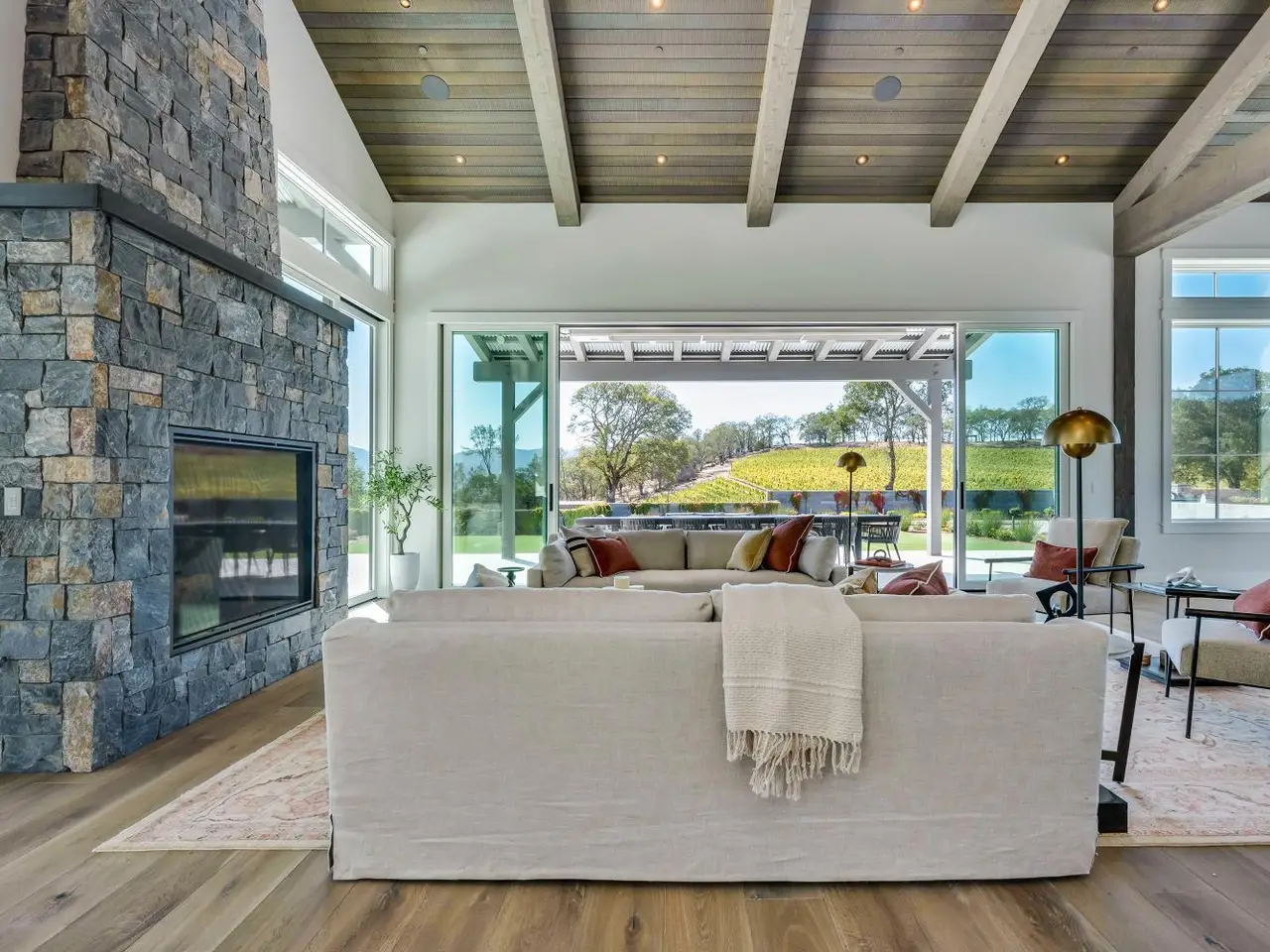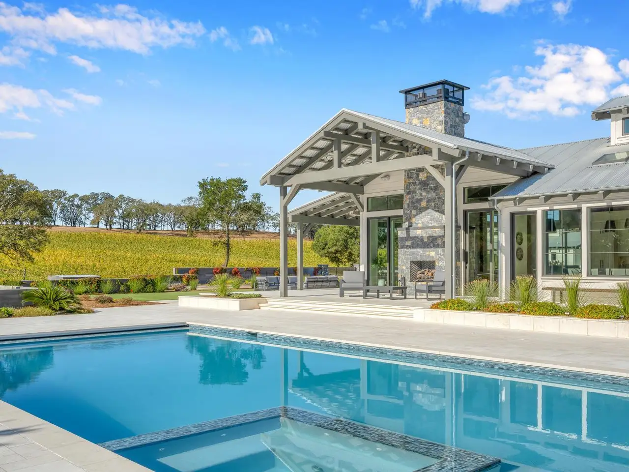 A luxury estate set on 8.04 acres across from the famed upper ridge vineyards of Joseph Phelps, this property has been meticulously designed to maximize privacy, capture vineyard vistas, and harmonize with the surrounding topography. The 7,920 sq. ft. main residence showcases four bedrooms and is constructed with the highest quality materials and finishes. Inside, the home features a dramatic great room, a true chef's kitchen, office/study, walk-in wine cellar, media lounge, and a primary suite with its own private entry lounge. A secondary 1,200 sq. ft. dwelling offers two bedrooms, a full kitchen, living room, and covered patios at both the front and back, providing ideal accommodations for guests. Outdoor living is equally compelling, with more than 2,600 sq. ft. of covered space designed for seamless indoor/outdoor living. Expansive limestone patios lead to a fully equipped outdoor kitchen with pizza oven, resort-style pool and spa, two firepits, an outdoor fireplace, and a bocce courtall thoughtfully crafted for both intimate gatherings and large-scale entertaining.