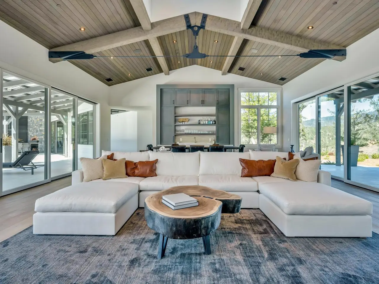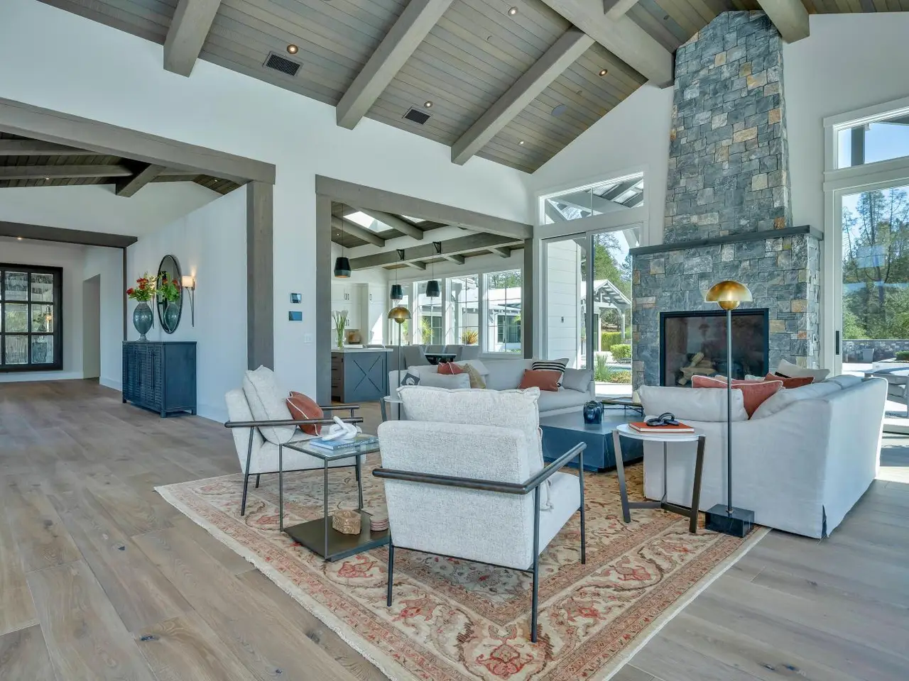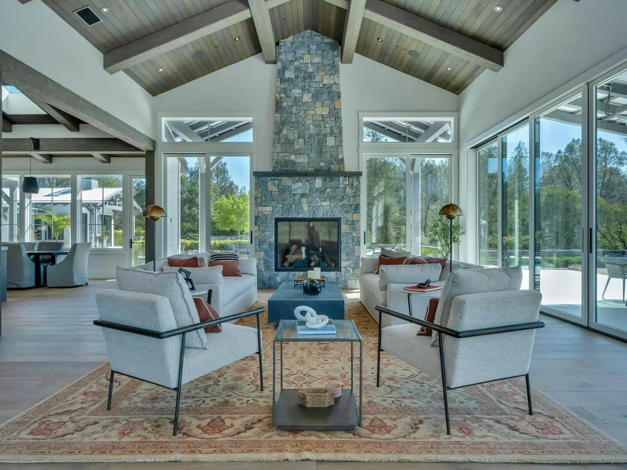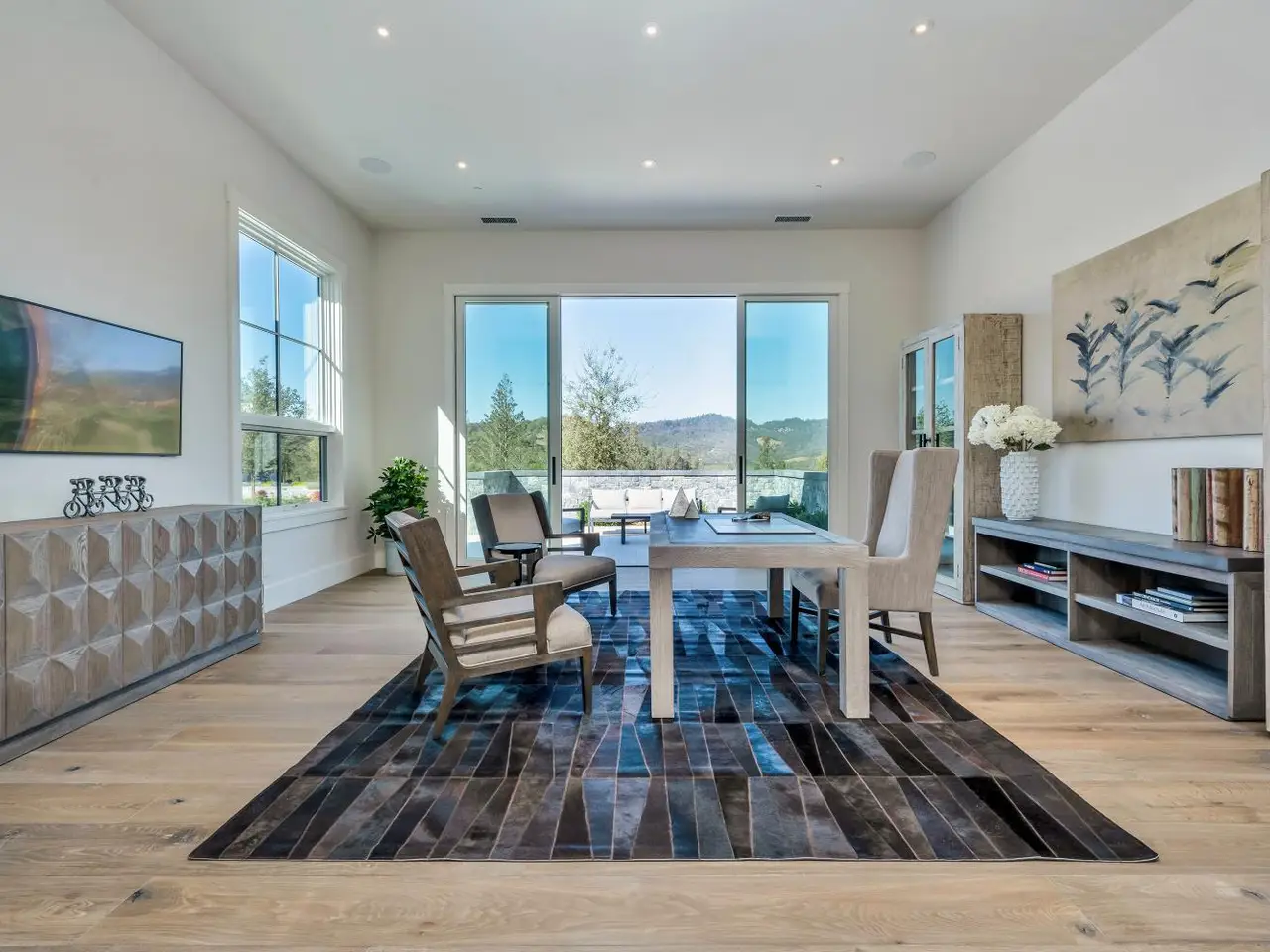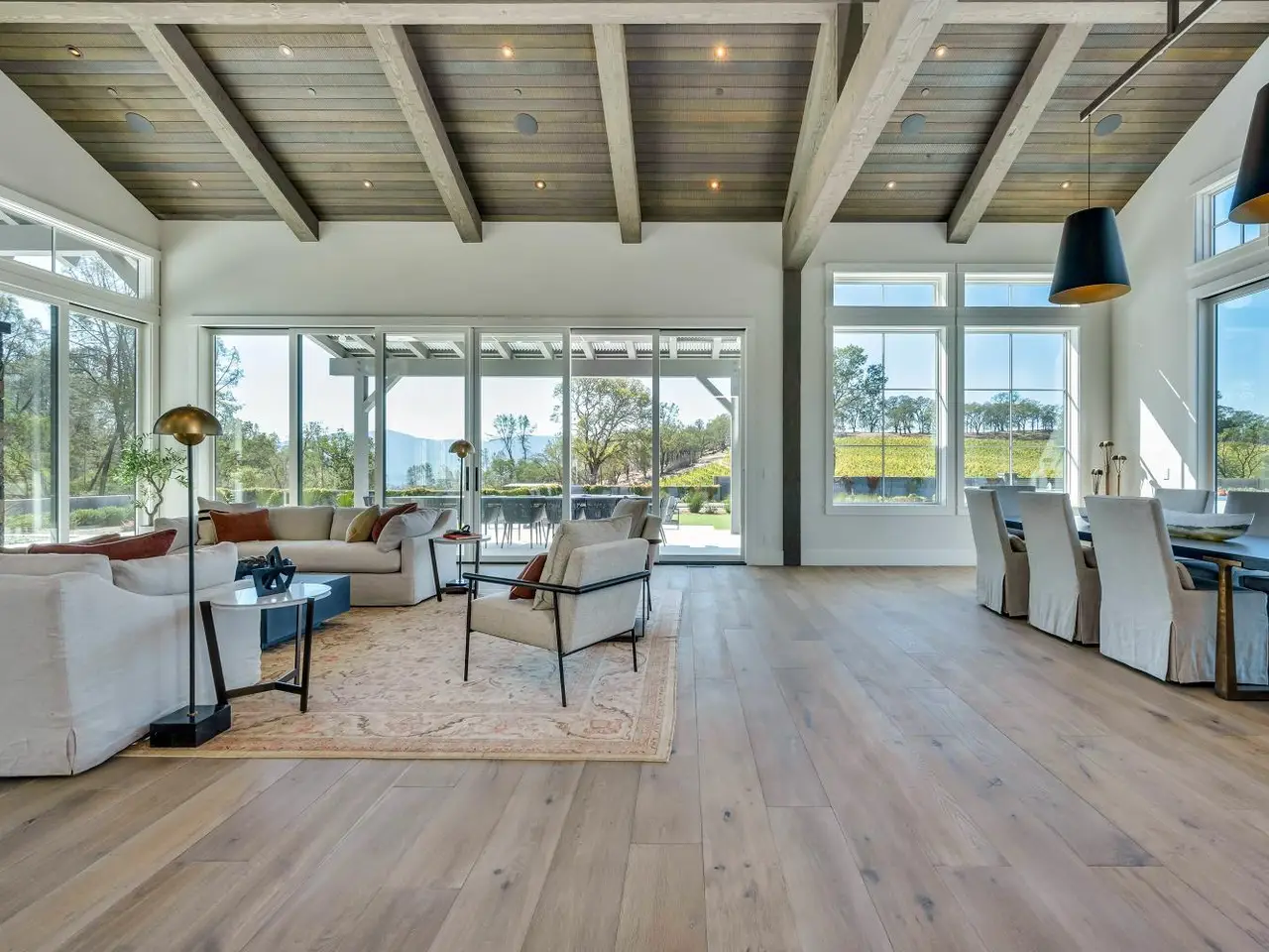 A luxury estate set on 8.04 acres across from the famed upper ridge vineyards of Joseph Phelps, this property has been meticulously designed to maximize privacy, capture vineyard vistas, and harmonize with the surrounding topography. The 7,920 sq. ft. main residence showcases four bedrooms and is constructed with the highest quality materials and finishes. Inside, the home features a dramatic great room, a true chef's kitchen, office/study, walk-in wine cellar, media lounge, and a primary suite with its own private entry lounge. A secondary 1,200 sq. ft. dwelling offers two bedrooms, a full kitchen, living room, and covered patios at both the front and back, providing ideal accommodations for guests. Outdoor living is equally compelling, with more than 2,600 sq. ft. of covered space designed for seamless indoor/outdoor living. Expansive limestone patios lead to a fully equipped outdoor kitchen with pizza oven, resort-style pool and spa, two firepits, an outdoor fireplace, and a bocce courtall thoughtfully crafted for both intimate gatherings and large-scale entertaining.