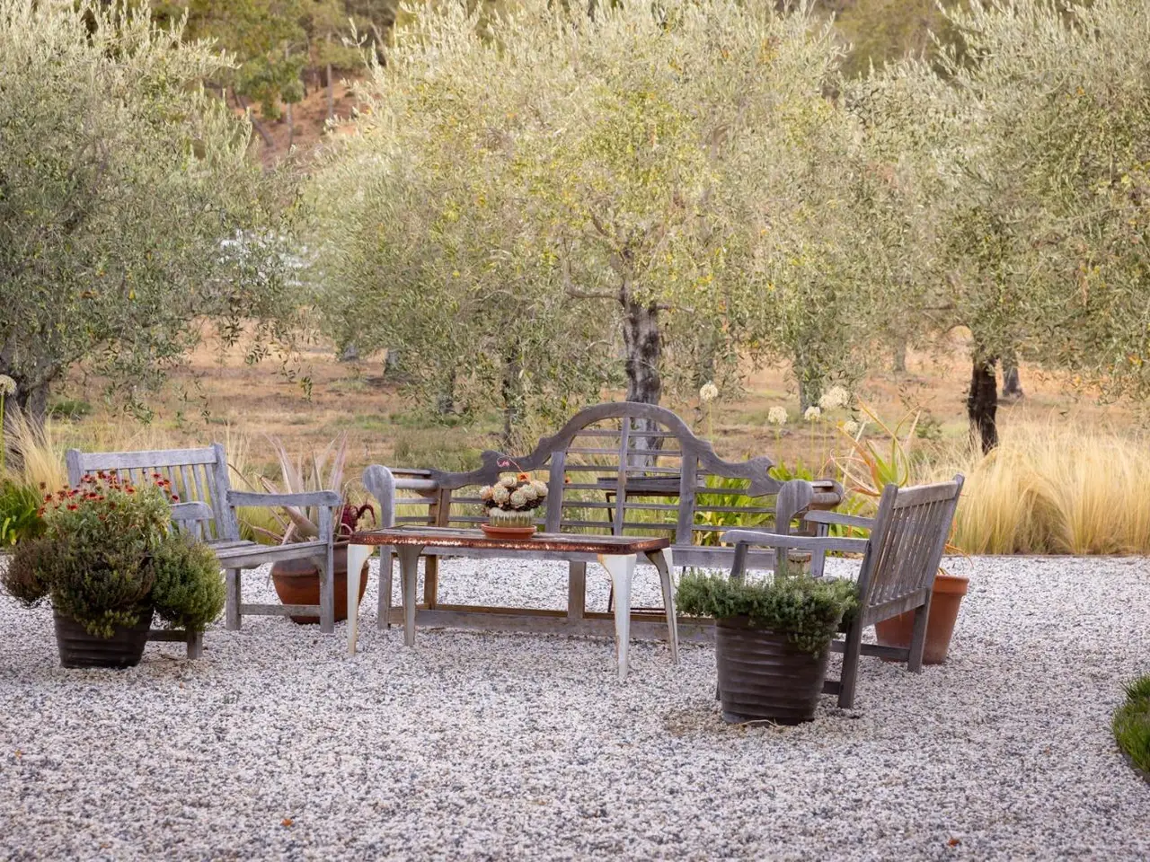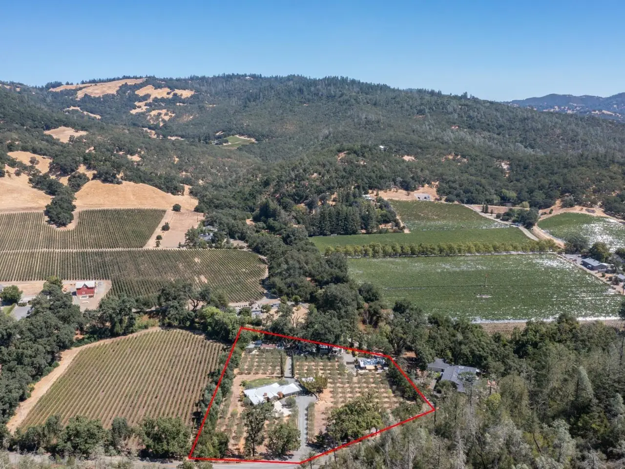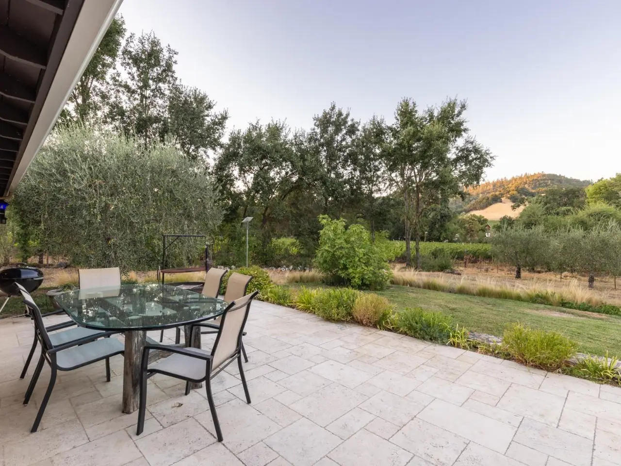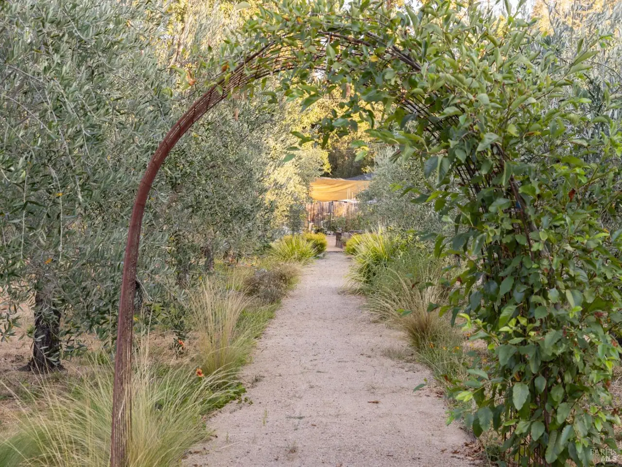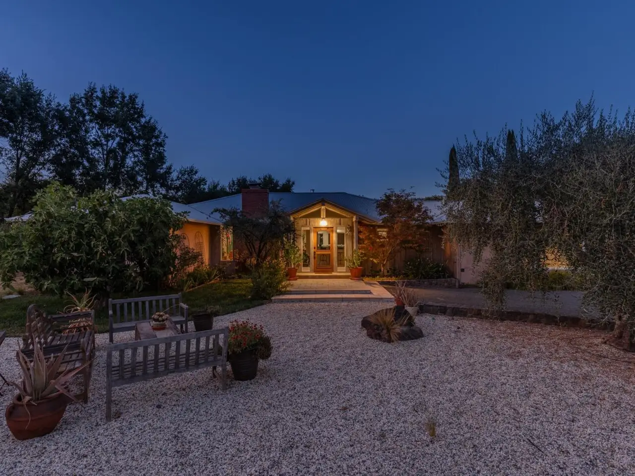 Nestled in a serene landscape featuring over 200 mature olive trees, this updated single-level main house plus additional single level 2nd dwelling and additional structures sit on a private 2.57 acre oasis. Just 4 miles from St. Helena and 2.5 miles to stunning Lake Hennessey, this Napa Valley compound exudes charm and tranquility. The main residence includes 2 bedrooms and 2.5 bathrooms within approximately 2,110 square feet, offering a spacious and inviting layout. Rustic hardwood and large-format stone floors enhance the interior, while expansive sliding patio doors seamlessly connect indoor and outdoor spaces. The kitchen features a quaint breakfast nook, granite countertops, high-end appliances, bar-top seating, and a large walk-in pantry, making it both functional and stylish. A private flex room with a separate entrance provides flexibility, ideal for a third bedroom, office, craft room, or gym. Step outside to discover a truly special outdoor space, complete with a covered back patio perfect for gatherings. Enjoy breathtaking views of the manicured olive orchard, neighboring vineyards and mountains beyond. Access the charming 910+/- square foot guest house and 805+/- sf storage building near the back of the property via a gravel pathway or a separate entrance off Rossi Rd.